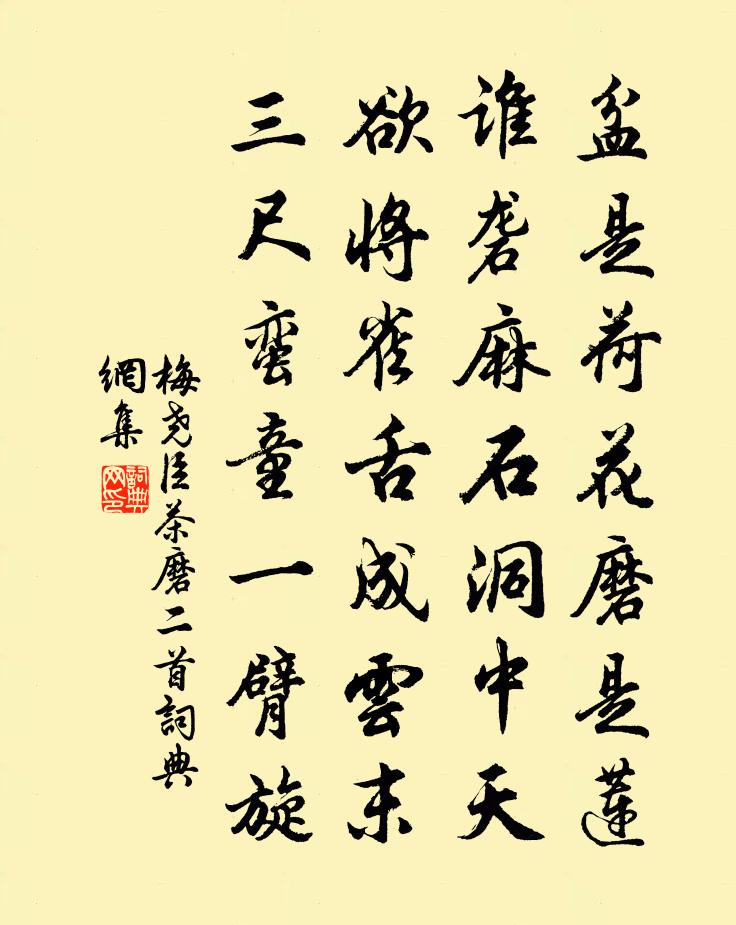 詩詞名句歷史字典書法欣賞書法字典國語詞典說文解字康熙字典古漢語字典標 題 作 者 詩 句 茶磨二首作者:梅堯臣 朝代:宋代茶磨二首原文盆是荷花磨是蓮,誰礱麻石洞中天。欲將雀舌成雲末,三尺蠻童一臂旋。詩詞問答問:茶磨二首的作者是誰?答:梅堯臣問:茶磨二首寫於哪個朝代?答:宋代問:梅堯臣的名句有哪些?答:梅堯臣名句大全梅堯臣茶磨二首書法欣賞茶磨二首書法作品詩詞推薦滿庭芳 李老先生慶八十姬翼〔元代〕南極儲祥,少微呈瑞,八旬應現人寰。水雲疏散,金鼎煉神丹。玩盡長春洞府,逍遙占、物外高閒。無衰老,龜旋題滄浪峽榜鄭仁表〔唐代〕分峽東西路正長,行人名利火然湯。路傍著板滄浪峽,真是將閒攪撩忙。偈傾一百三十三首釋法薰〔宋代〕舉古舉今,和泥合水。說心說性,畫虎成狸。蝶戀花(和王廉訪)葛勝仲〔宋代〕風過漣漪紋縠細。十指香檀,驚破交禽睡。野蔌溪毛真易致。風流未減蘭亭會。擊汰千艘供洛禊。映水垂楊,萬縷題鴻都觀杜光庭〔唐代〕亡吳霸越已功全,深隱雲林始學仙。鸞鶴自飄三蜀駕,波濤猶憶五湖船。雙溪夜月明寒玉,眾嶺秋空斂翠煙。也有題文發叔所藏潘子真水墨江湖八境小軸廬山霽楊萬里〔宋代〕彭滭收積雨,廬山放嫩晴。多情是瀑布,只作雨中聲。憶浪顛陳郁〔宋代〕偶同鄉友校吟編,因得平安到浪顛。心不乾時清似水,發緣憂國白於棉。半生景慕空千里,一紙寒溫廢二年。何日秋日晨與寄楚望張耒〔宋代〕夜雨霽清曉,浮雲散涼川。幽人理青發,汲彼石井泉。焚香展素帙,持珠諷妙言。晨暉淡悠揚,秋霞麗紺天。萎花和吳侍御被使燕然盧照鄰〔唐代〕春歸龍塞北,騎指雁門垂。胡笳折楊柳,漢使采燕支。戍城聊一望,花雪幾參差。關山有新曲,應向笛中吹。偈頌一百四十一首釋師範〔宋代〕雲門一曲,從來無譜。韻出五音,調高千古。就中妙旨許誰知,幾擬黃金鑄子期。陳保之訪宿徐照〔宋代〕不作王侯客,一身如散仟。少聞人世事,多欠酒家錢。省語初如傲,高文舊已傳。去燈燒蠟炬,相對坐茫然。鳳銜杯晏殊〔宋代〕青苹昨夜秋風起。無限個、露蓮相倚。獨憑朱闌、愁望晴天際。空目斷、遙山翠。彩箋長,錦書細。誰信道、兩情酬謝謙山所寄張埴〔宋代〕老農群兒去聚沙,不知桃子結西華。歸來鄉井半鬼錄,依舊湖山一會家。白蓋年深蝸浼浼,綠陰人靜鵲槎槎。江流十一月七日五首張耒〔宋代〕水霧今晨重,山川不復分。自然無日色,那更挾霜分。烏鳥依寒寂,漁樵散暝昏。一杯聊愈疾,令我憶違君。次韻朱希真贈別黃彥平〔宋代〕白頭才半刺,黃卷漫三餘。鬢禿絲難理,詩工錦不如。登山靈運屐,下法少游車。子念從吾隱,吾能授子書。寄沖退處士章詧釋真一子〔宋代〕未遂山中吟,時聞世上音。笑言失真詮,塵穢濁神襟。歸植南園芝,馳他北溟金。千日勤耕耘,自然生瑤琳。沁園春 答九華葉賢良劉克莊〔宋代〕一卷陰符,二石硬弓,百斤寶刀。更玉花驄噴,鳴鞭電抹,烏絲闌展,醉墨龍跳。牛角書生,虬髯豪客,談笑皆堪出城三首晁補之〔宋代〕堆案文書無了畢,並堤船舫且縈迴。非關董役年年事,自為春郊得得來。太師中書令魏國公冊贈尚書令追封真定王趙挽王禹偁〔宋代〕忍聽咚咚窆鼓聲,笳簫鳴咽暮雲凝。勳勞自契約蕭相,諡法還須比魏徵。曉月暗垂丹旐露,夜風輕觸繐帷燈。三川除夜長安客舍歐陽詹〔唐代〕十上書仍寢,如流歲又遷。望家思獻壽,算甲恨長年。虛牖傳寒柝,孤燈照絕編。誰應問窮轍,泣盡更潸然。名句推薦世人結交須黃金,黃金不多交不深。張謂《題長安壁主人》 破帽遮顏過鬧市,漏船載酒泛中流。魯迅《自嘲》 高樓送客不能醉,寂寂寒江明月心。王昌齡《芙蓉樓送辛漸二首》 處事最當熟思緩處。熟思則得其情,緩處則得其當。陳繼儒《小窗幽記·集醒篇》 江湖多風波,舟楫恐失墜。杜甫《夢李白二首·其二》 更待菊黃家醞熟,共君一醉一陶然。白居易《與夢得沽酒閒飲且約後期》 自古聖賢盡貧賤,何況我輩孤且直!鮑照《擬行路難·其六》 相逢不飲空歸去,洞口桃花也笑人。佚名《增廣賢文·上集》 相尋夢裡路,飛雨落花中。晏幾道《臨江仙·鬥草階前初見》 客路青山外,行舟綠水前。王灣《次北固山下》
