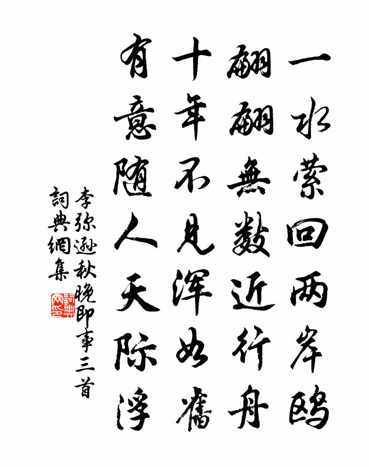 詩詞名句歷史字典書法欣賞書法字典國語詞典說文解字康熙字典古漢語字典標 題 作 者 詩 句 秋晚即事三首作者:李彌遜 朝代:宋代秋晚即事三首原文一水縈迴兩岸鷗,翩翩無數近行舟。十年不見渾如舊,有意隨人天際浮。詩詞問答問:秋晚即事三首的作者是誰?答:李彌遜問:秋晚即事三首寫於哪個朝代?答:宋代李彌遜秋晚即事三首書法欣賞秋晚即事三首書法作品詩詞推薦秋晚雜書三十首方回〔宋代〕獨吟不愧聲,獨立不愧影。獨行不愧屐,獨臥不愧枕。昏昏十日醉,炯炯一夕醒。古瓶插殘菊,老碗貯凍茗。三嗅題陸大參秀夫廣陵牡丹詩卷後林景熙〔宋代〕南海英魂叫不醒,舊題重展墨香凝。當時京洛花無主,猶有春風寄廣陵。端午帖子詞蘇軾〔宋代〕微涼生殿閣,習習滿皇都。試問吾民慍,南風為解無。依韻和許待制春雪梅堯臣〔宋代〕密雪犯陽和,寒階覆短莎。條牙摧不展,鳥舌噤應多。變令已為失,易消如未苛。桃花禹門水,早晚見通波。贈歐陽建曹攄〔魏晉〕嗟我良友。惟彥之選。弱冠參戎。既立南面。或踴而升。蔚煥其變。豈徒虛聲。考績畿甸。約政理繁。事省功辯。鄰女搔綿吟華岳〔宋代〕閒窗日上三竿竹,窗下嬌娥整輪輻。匆匆未暇理雲鬟,半朵青鴉倚紅玉。青梢摘盡銀香囊,畫欄平倚斑筠筐。時將添酒中六詠酒船陸龜蒙〔唐代〕昔人性何誕,欲載無窮酒。波上任浮身,風來即開口。荒唐意難遂,沉湎名不朽。千古如比肩,問君能繼不?餞陳匝峰之廉泉趙善璙〔宋代〕桃源渺何處,夢短到家難。不辦一丘費,猶為九品官。鶴嫌新俸薄,鷗訝舊盟寒。附翼攀鱗事,書生不敢幹。欲登蓬萊山謝雨恐泥濘不可行是早忽晴並紀其陳宓〔宋代〕喧枕浪浪直到明,驅車欲謝卻成晴。天人契合豈無意,草木□途俱有情。賸作寰中三日施,依前岩畔一泓清。願言婦女之孝二十首趙津吏女林同〔宋代〕儻得代父死,誠非愛妾身。不圖君聘妾,向道有嚴親。與潘仲達二首張耒〔宋代〕東風沛甘雨,百物一時好。江南桃李盡,紅紫到百草。道傍負擔子,寒食歸祭禱。今我淮上丘,三年不躬掃。頌古八首釋深〔宋代〕一人背手抽金鏃,一人反身控角弓。南北東西競頭看,果然一雁落寒空。岳陽道中鄭剛中〔宋代〕客子方憂畏,津亭更寂寥。亂雲藏野寺,積雪覆溪橋。米潤還難買,酤遲轉不饒。梅花有何故,冷笑背寒條。明發白沙灘聞布榖有感楊萬里〔宋代〕提壺勸我飲,杜鵑勸我歸。不如布榖子,勸我勤耘耔。我少貧且賤,不但無置錐。筆耒墾紙田,黑水導墨池。借令春日小園即事十首方回〔宋代〕傍宅荒山幾許長,蕘夫芸子縱牛羊。何當盡與栽桃李,疊石周遭築短牆。水龍吟 賦蓮花海棠王惲〔元代〕兩株雲錦翻空,換根元有丹砂*。繡幃重繞,銀紅高照,故家風味。翠羽生紅,霧紗肌玉,風流誰比。記沉香亭暖浪淘沙(與前人)陳著〔宋代〕有約泛溪篷。游畫圖中。沙鷗引入翠重重。認取抱琴人住處,水淺山濃。一笑兩衰翁。莫惜從容。瓮醅灰芋雪泥菘郭信可索雲溪詩懶未能作戲成此寄以自解馮時行〔宋代〕疏疏翠竹淨江沙,遠寄新詩物地夸。月徑剩教添鬢雪,雲溪日放長苔花。也知一決君無勇,豈是狂吟我欲賒。琴鶴館中賞紅梅何澹〔宋代〕石渠南畔小闌乾,一種孤芳萬玉攢。應為癯儒嫌冷淡,故將素麵汙鉛丹。花面酒盞渾如夢,池上詩盟幸不寒。美景即事鄭清之〔宋代〕微雲疏雨一分月,折葦枯荷強半秋。猶有遠禽飛不盡,急翻孤影暮江頭。名句推薦彩線輕纏紅玉臂,小符斜掛綠雲鬟。佳人相見一千年。蘇軾《浣溪沙·端午》 遠夢歸侵曉,家書到隔年。杜牧《旅宿》 低頭羞見人,雙手結裙帶。毛鉉《 * 詞·下床著新衣》 桃花落後蠶齊浴,竹筍抽時燕便來。朱彝尊《鴛鴦湖棹歌·一百首選二》 有情風、萬里卷潮來,無情送潮歸。蘇軾《八聲甘州·寄參寥子》 山河風景元無異,城郭人民半已非。文天祥《金陵驛二首·其一》 紫泉宮殿鎖煙霞,欲取蕪城作帝家。李商隱《隋宮》 嫦娥應悔偷靈藥,碧海青天夜夜心。李商隱《嫦娥》 同聲相應,同氣相求。佚名《易傳·乾文言》 分不盡,半涼天。可憐閒剩此嬋娟。吳文英《思佳客·閏中秋》