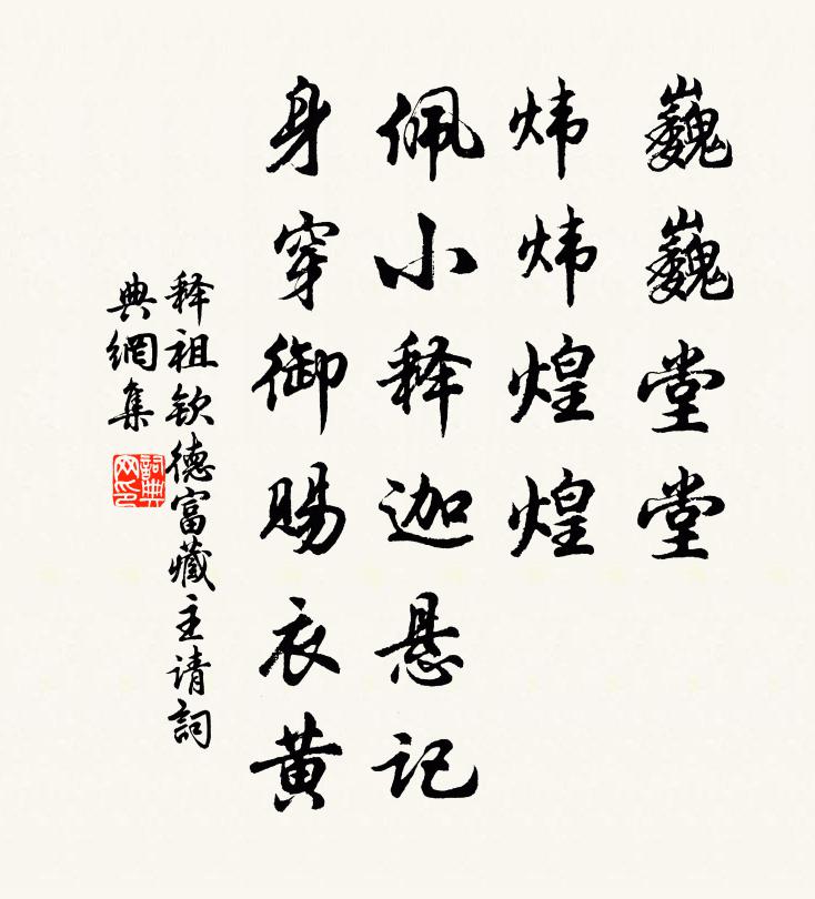 詩詞名句歷史字典書法欣賞書法字典國語詞典說文解字康熙字典古漢語字典標 題 作 者 詩 句 德富藏主請作者:釋祖欽 朝代:宋代德富藏主請原文巍巍堂堂,煒煒煌煌。佩小釋迦懸記,身穿御賜衣黃。詩詞問答問:德富藏主請的作者是誰?答:釋祖欽問:德富藏主請寫於哪個朝代?答:宋代釋祖欽德富藏主請書法欣賞德富藏主請書法作品詩詞推薦酬魏三十七李群玉〔唐代〕靜里寒香觸思初,開緘忽見二瓊琚。一吟麗可風流極,沒得弘文李校書。偶作呈諤閏二上人魏野〔宋代〕老雖無悶向茅堂,忽忽還因物感傷。積霧易迷平地水,孤雲難護滿天霜。祥麟可向清時見,驚鶴那於黑處藏。信意行次漢水寄荊南漕唐司勛鄭獬〔宋代〕漢水渺渺東南流,蕭蕭雨打杏花洲。欲托雙魚寄書札,不知幾日到荊州。荊州故人日漸遠,到時綠草滿沙頭。爭得君子泉李申子〔宋代〕□岩峭□色斕斑,雲葉煙蘿□□□鬟。疑有仙琚時會集,唾珠霏屑落人間。東偏紙閣初成陸游〔宋代〕蚍蜉占雨解移穴,蟋蟀畏寒先近床。我亦聯屏為燠室,一冬省火又宜香。涪陵令李坤幼隨母冒姓今複姓項安世〔宋代〕孝子生平三釜悲,故人解後一寒疑。亦知自講陶朱事,不同戲題臣向詩。舊天夫人稱李衛,如今弟子即羲之。姓同喜遷鶯(壽邵太尉)佚名〔宋代〕春回天際,見柳眼翠窺,梅腮粉膩。日慶三陽,時逢千載,帷幄挺生元帥。亘古撫今忠義,天下安危注意。負英偉伏承伯丈人待制侍郎九重渙號三聘鼎來促裝戒李呂〔宋代〕孟子正心邪說息,昌黎首唱六經明。可憐後學多趨末,重振斯文藉主盟。漁家傲侯善淵〔元代〕百歲光陰如奔騎。浮華眩目飛塵隙。玄覽滌除運神力。通訊息。無生路上知端的。霧散瑤瞳升天奕。陽光漸著純陰鹿鳴小集奉餞赴省諸公曹彥約〔宋代〕便從場屋了經綸,看取朝家詔選掄。天賦忠良須努力,人生溫飽豈榮身。鼎來時事方憂國,到底儒冠不誤人。青紫上杜駙馬賈島〔唐代〕玉山突兀壓乾坤,出得朱門入戟門。妻是九重天子女,身為一品令公孫。鴛鴦殿里參皇后,龍鳳堂前賀至尊。今日首尾吟邵雍〔宋代〕堯夫非是愛吟詩,詩是堯夫信腳時。高祖宅前花似錦,魏王堤畔柳如絲。因閒看水行來遠,就便遊園歸去遲。每遇學易齋五邁〔宋代〕太極分陽陽,生生之謂易。易有乾之元,生意露沙息。先生易中行,日用而飲食。全體純是仁,本自玄中得。克己送新羅人及第歸貫休〔唐代〕捧桂香和紫禁菸,遠鄉程徹巨鰲邊。莫言掛席飛連夜,見說無風即數年。衣上日光真是火,島旁魚骨大於船。到鄉十月六日園丁置墨紫方岳〔宋代〕已是年時欲雪天,誰回冷落作芳妍。極知品在群葩上,忽與梅爭一著先。顏色依然香墨重,花頭不減暮春圓。人言蠶婦辭陳普〔宋代〕東鄰採桑婦,西鄰養蠶女,年年役役為蠶苦。桐花如雪麥如雲,鳴鳩醉椹 * 雨。踏踏登竹梯,山煙鎖春樹。不管送秘典座勝侍者乞麥陳與義〔宋代〕一春不雨但多風,家家買龜問豐凶。天寧疏頭與天通,泚筆未了雲埋空。一雨三日勤老龍,隴頭滿眼十分豐。法中送劉童子試藝天京蒲壽宬〔宋代〕磽磽頭角出群玉,炯炯瞳人剪秋漪。神光理作照書月,一覽千古無復遺。殊科自可獻上國,況能文藝超等夷。河洛次李參政所和五絕句韻因以為詩魏了翁〔宋代〕天地之心萬物靈,世間難得是人身。面前放過知何限,好與光明做一巡。喜得建茶陸游〔宋代〕玉食何由到草萊,重奩初喜坼封開。雪霏庾嶺紅絲磑,乳泛閩溪綠地材。舌本常留甘盡日,鼻端無復鼾如雷。故應名句推薦善無主於心者不留,行莫辯於身者不立。墨子《墨子·02章 修身》 山光悅鳥性,潭影空人心。常建《題破山寺後禪院》 浮雲不系名居易,造化無為字樂天李忱《吊白居易》 其身正,不令而行;其身不正,雖令不從。孔子弟子《論語·子路篇》 離情被橫笛,吹過亂山東。王安石《江上》 瞻彼洛城郭,微子為哀傷。曹操《薤露行》 誰問旗亭,美酒斗十千。賀鑄《行路難·縛虎手》 西望雷塘何處是?香魂零落使人愁,淡煙芳草舊迷樓王士禎《浣溪沙·紅橋》 牛刀可以割雞,雞刀難以屠牛。王充《論衡·卷十二·程材篇》 思欲委符節,引竿自刺船。元結《賊退示官吏》