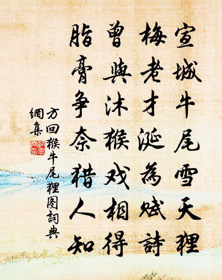 詩詞名句歷史字典書法欣賞書法字典國語詞典說文解字康熙字典古漢語字典標 題 作 者 詩 句 猴牛尾狸圖作者:方回 朝代:宋代猴牛尾狸圖原文宣城牛尾雪天狸,梅老才涎為賦詩。曾與沐猴戲相得,脂膏爭奈獵人知。詩詞問答問:猴牛尾狸圖的作者是誰?答:方回問:猴牛尾狸圖寫於哪個朝代?答:宋代方回猴牛尾狸圖書法欣賞猴牛尾狸圖書法作品詩詞推薦金剛隨機無盡頌法會因由分第一釋印肅〔宋代〕更上一層樓,清風似餌鉤。釺鱗吞不得,莫怪釣竿頭。水調歌頭汪莘〔宋代〕堯舜去已遠,稷契不重來。周流天上地下,我馬亦悠哉。君向雲中獨立,知與何人相俟,孔蓋逐風回。長憶目成處風箏(一作題風箏寄意)高駢〔唐代〕夜靜弦聲響碧空,宮商信任往來風。依稀似曲才堪聽,又被移將別調中。得失吟邵雍〔宋代〕時難得而易失,心雖悔而何追。不知老之已至,不知志與願違。次奉少游梅韻楊萬里〔宋代〕南枝外槁中不槁,未葉先花笑人倒。已從寒里詩愁著,可復溪邊被花惱。非渠挽出百卉前,爾許清寒誰敢早。有花僕射相公思縟春榮詞含古雅忽成絕唱以導高情李至〔宋代〕行穿花竹戶庭幽,只下堂階便且游。紅蕊向人含艷態,黃鶯代客說春愁。繞床文史堪怡悅,滿席笙歌好獻酬。未必滿庭芳佚名〔宋代〕道釋儒門,三教歸一,算來平等肩齊。道分天地,萬化總歸基。佛在靈山證果,六年後、雪嶺修持。儒家教,溫良湘中旅泊寄閻九司戶防①孟浩然〔唐代〕桂水通百越,扁舟期曉發。②荊雲蔽三巴,夕望不見家。③襄王夢行雨,才子謫長沙。長沙饒瘴癧,胡為苦留滯。挽主簿楊仲遠詩虞儔〔宋代〕居士胸懷壑與丘,琴山懷抱枕清流。一區宅好真揚子,萬卷書多似鄴侯。好客亦嘗陪俎豆,諸郎殊不廢箕裘。人間將赴京留獻令公盧綸〔唐代〕沙鶴驚鳴野雨收,大河風物颯然秋。力微恩重諒難報,不是行人不解愁。屬疾李商隱〔唐代〕許靖猶羈宦,安仁復悼亡。茲辰聊屬疾,何日免殊方。秋蝶無端麗,寒花只暫香。多情真命薄,容易即迴腸。織圖二十四首織樓璹〔宋代〕青鐙映幃幙,絡緯鳴井欄。軋軋揮素手,風露淒已寒。辛勤度幾梭,始復成一端。寄言羅綺伴,當念麻苧單。漁家傲(般涉·第二)周邦彥〔宋代〕幾日輕陰寒測測。東風急處花成積。醉踏陽春懷故國。歸未得。黃鸝久住如相識。賴有蛾眉能暖客。長歌屢勸金杯仙興葉紹翁〔宋代〕金書宮殿玉闌乾,雪瀑泉飛洞口寒。日暮仙翁騎鶴去,碧桃花滿石棋盤。四月八日三絕劉克莊〔宋代〕九龍吐香水,茲事已千秋。道是本無垢,年年浴未休。用從軍古雲樂為韻賀楊覺甫乾李曾伯〔宋代〕國有金湯在,鄰修玉帛雲。夷侵由廢雅,苗格自敷文。當寧形宵慮,公車以歲聞。便當從幕府,入校道山芸。舟還江南阻風有懷伯兄王安石〔宋代〕幾時重接汝南評,兩漿留連不計程。白浪黏天無限斷,玄雲垂野少晴明。平皋望望欲何向,薄宦嗟嗟空此行。會有尋梅吳錫疇〔宋代〕迤邐尋梅過別村,歸來新月照黃昏。更無可覓春風面,捻斷冰髭立斷魂。瓊花鄭損〔唐代〕春晚驅車列古祠,看花復誦舊題詩。少年嘗記六七月,大暑曾開三五枝。酹酒輒來思往事,憑闌欲去立多時。八仙晦日重宴陳嘉言〔唐代〕高門引冠蓋,下客抱支離。綺席珍羞滿,文場翰藻摛。蓂華雕上月,柳色藹春池。日斜歸戚里,連騎勒金羈。名句推薦織錦相思樓影下,鈿釵暗約小簾間。吳文英《新雁過妝樓·中秋後一夕李方庵月庭延客命小妓過新水令坐間賦詞》 飛蓬各自遠,且盡手中杯。李白《魯郡東石門送杜二甫》 何處它年寄此生,山中江上總關情。虞集《院中獨坐》 滯雨通宵又徹明,百憂如草雨中生。薛逢《長安夜雨》 照花前後鏡,花面交相映。溫庭筠《菩薩蠻·小山重疊金明滅》 山驛淒涼,燈昏人獨寢。陸游《清商怨·葭萌驛作》 欲將輕騎逐,大雪滿弓刀。盧綸《和張僕射塞下曲·其三》 南陵水面漫悠悠,風緊雲輕欲變秋。杜牧《南陵道中 / 寄遠》 四十三年,望中猶記,烽火揚州路。辛棄疾《永遇樂·京口北固亭懷古》 舍近謀遠者,勞而無功范曄《後漢書·列傳·吳蓋陳臧列傳》