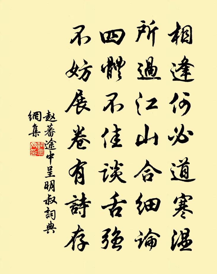 詩詞名句歷史字典書法欣賞書法字典國語詞典說文解字康熙字典古漢語字典標 題 作 者 詩 句 途中呈明叔作者:趙蕃 朝代:宋代途中呈明叔原文相逢何必道寒溫,所過江山合細論。四體不佳談舌強,不妨展卷有詩存。詩詞問答問:途中呈明叔的作者是誰?答:趙蕃問:途中呈明叔寫於哪個朝代?答:宋代趙蕃途中呈明叔書法欣賞途中呈明叔書法作品詩詞推薦偈頌一百二十三首釋普度〔宋代〕二千年前,毗藍園裹。地動山搖,禍胎忽起。雲門瞎棒打不死,後代兒孫空切齒。休切齒,杓柄短長,澆潑在你。劉阮再到天台不復見仙子曹唐〔唐代〕再到天台訪玉真,青苔白石已成塵。笙歌冥寞閒深洞,雲鶴蕭條絕舊鄰。草樹總非前度色,煙霞不似昔年春。桃花奉酬李舍人秋日寓直見寄張南史〔唐代〕秋日金華直,遙知玉佩清。九重門更肅,五色詔初成。槐落宮中影,鴻高苑外聲。翻從魏闕下,江海寄幽情。洞庭春色/沁園春陸游〔宋代〕壯歲文章,暮年勳業,自昔誤人。算英雄成敗,軒裳得失,難如人意,空喪天真。請看邯鄲當日夢,待炊罷黃粱徐句齊唐〔宋代〕歲貴波然素,時珍蟹有箱。送逢侍者釋智愚〔宋代〕銷鑠精微復見人,青鞋蹈破幾重雲。鷲峰孤頂來辭我,祗有秋光可共分。紹興六年十月六日同信可舜弼進道謁隱甫值渠馮時行〔宋代〕畫山畫骨更畫魂,范寬此中高出群。君家八幅老筆墨,百年古篋鋪香芸。我來日出掛東壁,蒼崖落雪飛紛紛。寒鳥思歸傅察〔宋代〕舊國日已遠,東秦安在哉。水雲波浩蕩,林日影摧頹。野色撩詩興,秋風動旅懷。擊舟還信步,不覺詠歸來。平陵老將(此以下詩皆集外補遺)韋莊〔唐代〕白羽金僕姑,腰懸雙轆轤。前年蔥嶺北,獨戰雲中胡。匹馬塞垣老,一身如鳥孤。歸來辭第宅,卻占平陵居。三用韻何夢桂〔宋代〕貧女傷莫年,有淚不可挹。秦川五色錦,半世勞獨織。織花空過眼,新故總塵跡。撫機悲歲年,顏貌非故夕。妾心村居書事陸游〔宋代〕過門車馬誰曾入,塞路蓬蒿不復鋤。雨漏日惟支敗屋,鼠余時自緝殘書。寄寶藏壁天瑞施樞〔宋代〕路轉小橋東,群龍擁梵宮。荇花明晚水,蓮葉向秋風。匠斧應休役,禪窗定費功。笑他塵俗者,客路每匆匆。周德萬攜孥赴龍舒法曹,道過水陽相見,留別范成大〔宋代〕草草相逢小駐船,一杯和淚飲江天。妹孤忍使行千里,兄老那堪別數年。馬轉不容吾悵望,櫓鳴肯為汝留連?神如經伏波神祠劉禹錫〔唐代〕蒙蒙篁竹下,有路上壺頭。漢壘麏鼯斗,蠻溪霧雨愁。懷人敬遺像,閱世指東流。自負霸王略,安知恩澤侯。鄉園水調歌頭向子諲〔宋代〕公幕府間。從游者,洪駒父、徐師川、蘇伯固父子、李商老兄弟。是夕登臨,賦詠樂甚。俯仰三十九年,所存者,次韻王有之主簿陳棣〔宋代〕蓬生敢望直如麻,才思真同焦谷芽。擁被苦吟聲躑躅,盈編細札眼空花。羨君得意方豪縱,顧我無知絕誕夸。輸與續得觀書,迎就當陽居止,正月中旬定出三峽杜甫〔唐代〕自汝到荊府,書來數喚吾。頌椒添諷詠,禁火卜歡娛。舟楫因人動,形骸用杖扶。天旋夔子國,春近岳陽湖。發日立春韋莊〔唐代〕青帝東來日馭遲,暖煙輕逐曉風吹。罽袍公子樽前覺,錦帳佳人夢裡知。雪圃乍開紅菜甲,彩幡新翦綠楊絲。殷勤暮春偶成四首廖行之〔宋代〕蒲渚生新漲,花蹊長綠陰。微風將暑至,一雨共春深。強聒燕何吻,卑喧蛙未瘖。有懷無可奈,吟興發清斟。輞川集。欹湖王維〔唐代〕 * 凌極浦,日暮送夫君。湖上一回首,山青卷白雲。名句推薦野客預知農事好,三冬瑞雪未全消。戴復古《除夜》 淒涼寶劍篇,羈泊欲窮年。李商隱《風雨》 先生醉也,童子扶者。曹德《三棒鼓聲頻·題淵明醉歸圖》 見人初解語嘔啞,不肯歸眠戀小車。韋莊《與小女》 桃花潭水深千尺,不及汪倫送我情。李白《贈汪倫》 誰見汀洲上,相思愁白蘋。劉長卿《餞別王十一南遊》 無情明月,有情歸夢,同到幽閨。劉基《眼兒媚·秋思》 孤雁不飲啄,飛鳴聲念群。杜甫《孤雁 / 後飛雁》 不見年年遼海上,文章何處哭秋風?李賀《南園十三首》 父老得書知我在,小軒臨水為君開。蘇軾《送賈訥倅眉》