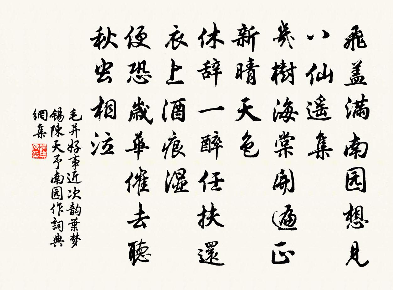 詩詞名句歷史字典書法欣賞書法字典國語詞典說文解字康熙字典古漢語字典標 題 作 者 詩 句 好事近(次韻葉夢錫陳天予南園作。)作者:毛並 朝代:宋代原文飛蓋滿南園,想見八仙遙集。幾樹海棠開遍,正新晴天色。休辭一醉任扶還,衣上酒痕濕。便恐歲華催去,聽秋蟲相泣。詩詞問答問:《好事近(次韻葉夢錫陳天予南園作。)》的作者是誰?答:毛並問:該詩寫於哪個朝代?答:宋代問:該詩是什麼體裁?答:詞書法欣賞好事近(次韻葉夢錫陳天予南園作。)書法作品詩詞推薦保聖院陳舜俞〔宋代〕門深鎖蒼苔,地靈育嘉樹。寂然煙雲宅,不接市朝路。苟能灰心居,即是古樂處。初除官蒙裴常侍贈鶻銜瑞草緋袍魚袋因謝惠貺兼抒離情白居易〔唐代〕新授銅符未著緋,因君裝束始光輝。惠深范叔綈袍贈,榮過蘇秦佩印歸。魚綴白金隨步躍,鶻銜紅綬繞身飛。明朝次韻子瞻太白山下早行題崇壽院蘇轍〔宋代〕山下晨光晚,林梢露滴升。峰頭斜見月,野市早明燈。樹暗猶藏鵲,堂開已饌僧。據鞍應夢我,聯騎昔嘗曾。點絳唇(春暮)趙長卿〔宋代〕啼鳥喃喃,恨春歸去春誰管。日和風暖。綠暗閒庭院。還憶當年,綺席新相見。人已遠。水流雲散。空結多情怨。奉和聖制中春麟德殿會百僚觀新樂權德輿〔唐代〕仲春藹芳景,內庭宴群臣。森森列乾戚,濟濟趨鉤陳。大樂本天地,中和序人倫。正聲邁鹹濩,易象含羲文。玉俎次吳說避地白岩山中書懷韻鄧仁憲〔宋代〕避地南來極,吾鄉北斗邊。風塵今阻隔,途路舊迍邅。閭里千門盛,湖山百卉鮮。故鄉歸未得,飛夢入青天。月夜觀雪三首楊萬里〔宋代〕仙人愛雪不嫌寒,挈月來看夜不眠。游遍瓊樓霜欲曉,卻將玉鏡掛青天。和擇之韻張栻〔宋代〕舊說峰頭寺,真成杖屨來。卻尋泥路滑,更喜野雲堆。寒積三冬雪,陽生九地雷。城中幾親友,為說看山回。送李德仁歸濟南鄉試 其二王冕〔元代〕江上有古柳,搖揚絲依依。容光照青眼,薄妒紅樓眉。玩之益何喜?攀之益何悲?於今贈君去,願染春風衣。兩浙轉運使呂少卿輓辭強至〔宋代〕卿月無光沒使星,屬封涕淚逐霜零。敝裯舊服從身殮,素節清風到目瞑。澄汰濁流師孟博,誅求橫賦罪延齡。塵埃閨怨詞三首白居易〔唐代〕朝憎鶯百囀,夜妒燕雙棲。不慣經春別,唯知到曉啼。珠箔籠寒月,紗窗背曉燈。夜來巾上淚,一半是春冰。關山挽孫少卿四首陳淳〔宋代〕福慶於人鮮比方,一生坦若履康莊。好逑得偶天官胄,嗣子能傳月窟芳。壽入九齡光寶籙,服膺三品燦金章。始終踏莎行(贈傀儡人劉師父)劉仁父〔宋代〕不假牽絲,何勞刻木。天然容貌施妝束。把頭全仗姓劉人,就中學寫秦城築。伎倆優長,恢諧軟熟。當場喝采醒群見胥平叔梅堯臣〔宋代〕歷君門兮九重,雲黕黕兮欲雨。隱翠幕兮觀予,心眷眷兮不語。會昌元年春五絕句。贈舉之僕射白居易〔唐代〕雞球餳粥屢開筵,談笑謳吟間管弦。一月三回寒食會,春光應不負今年。奉贈王中允維杜甫〔唐代〕中允聲名久,如今契闊深。共傳收庾信,不比得陳琳。一病緣明主,三年獨此心。窮愁應有作,試誦白頭吟。歸雲釋心月〔宋代〕拖雲從龍去又回,無心卻似有心來。只因怕失老僧約,永日岩房撥不開。哭補闕亡友綦毋學士王灣〔唐代〕明代資多士,儒林得異才。書從金殿出,人向玉墀來。詞學張平子,風儀褚彥回。崇儀希上德,近侍接元台。曩契感白蓮花白居易〔唐代〕白白芙蓉花,本生吳江濆。不與紅者雜,色類自區分。誰移爾至此,姑蘇白使君。初來苦憔悴,久乃芳氛氳。月月次平元衡菖蒲釋寶曇〔宋代〕只許春水細有聲,不容燈焰惱黃昏。是為白石清泉伴,乞與 * 便垛根。名句推薦瀚海闌乾百丈冰,愁雲慘澹萬里凝。岑參《白雪歌送武判官歸京》 天涯地角有窮時,只有相思無盡處。晏殊《玉樓春·春恨》 無聊成獨臥,彈指韶光過。納蘭性德《菩薩蠻·新寒中酒敲窗雨》 非意相干,可以理遣。房玄齡《晉書·列傳·第六章》 何以解憂?唯有杜康。曹操《短歌行》 志足而言文,情信而辭巧劉勰《文心雕龍·徵聖》 願得一心人,白頭不相離。卓文君《白頭吟》 不管煙波與風雨,載將離恨過江南。鄭文寶《柳枝詞》 殘雪壓枝猶有桔,凍雷驚筍欲抽芽。歐陽修《戲答元珍》 泥上偶然留指爪,鴻飛那復計東西。蘇軾《和子由澠池懷舊》
