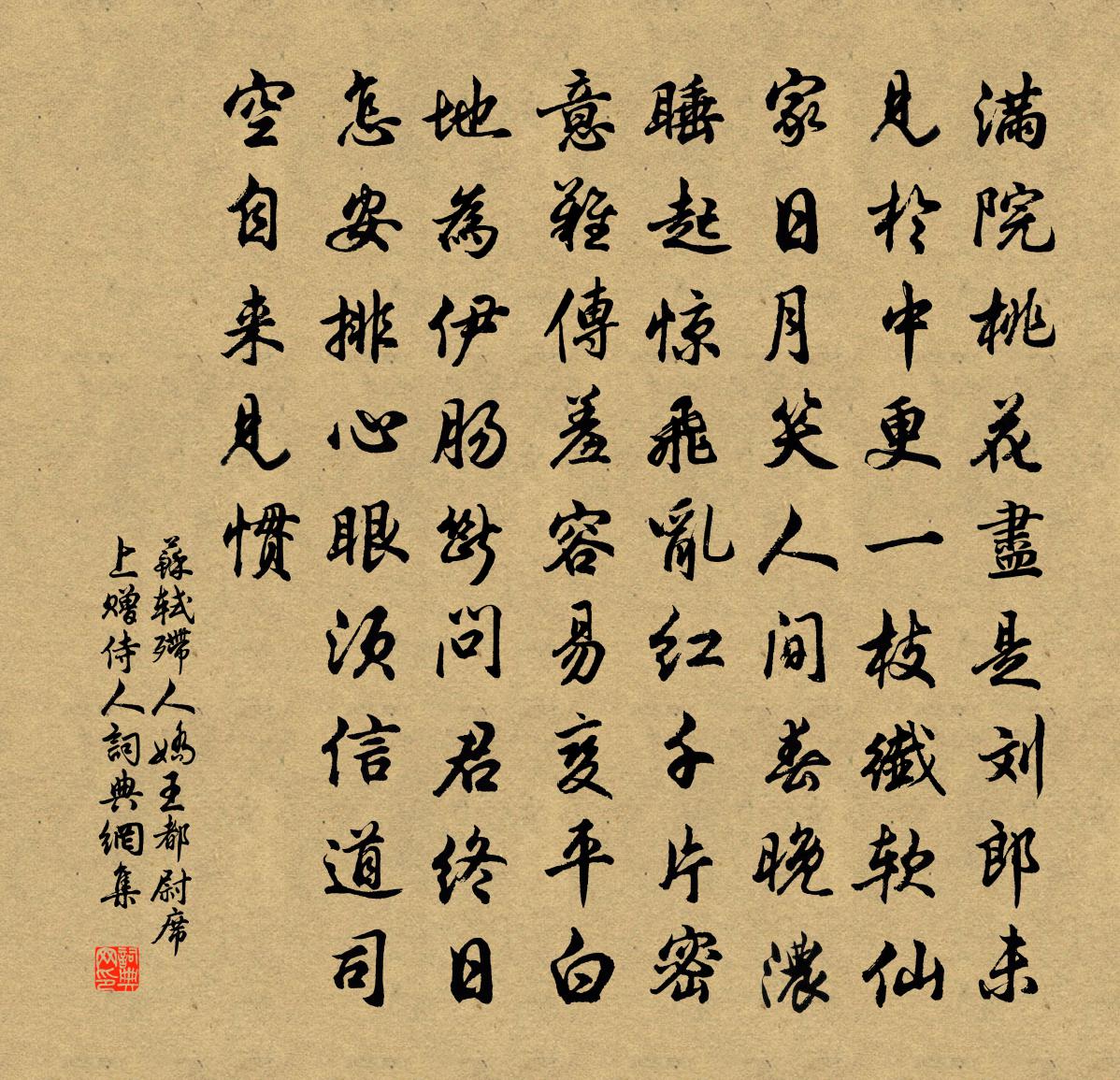 滿院桃花,儘是劉郎未見。於中更、一枝纖軟。仙家日月,笑人間春晚。濃睡起,驚飛亂紅千片。