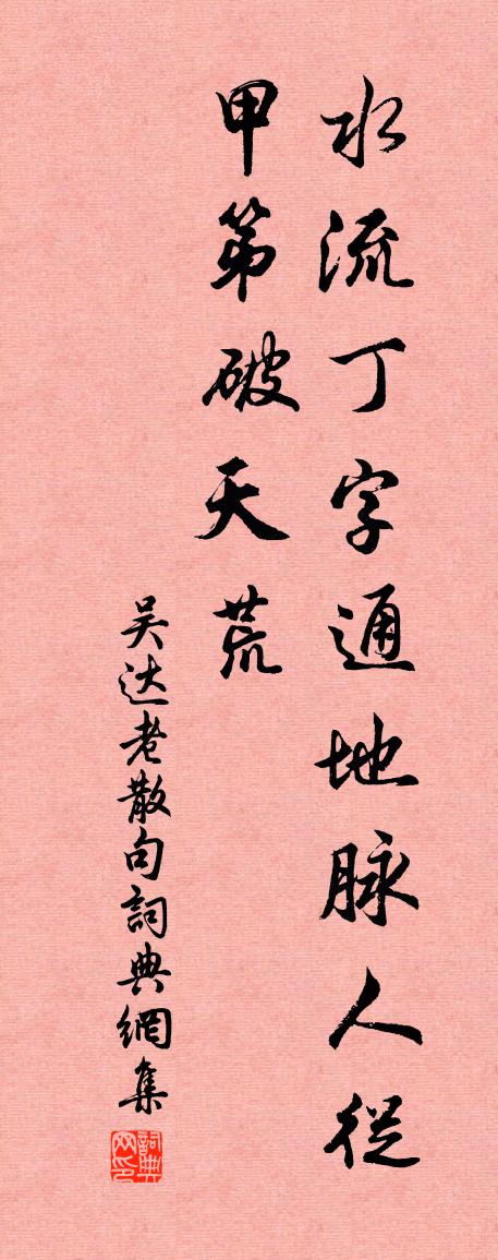 詩詞名句歷史字典書法欣賞書法字典國語詞典說文解字康熙字典古漢語字典標 題 作 者 詩 句 句作者:吳達老 朝代:宋代句原文水流丁字通地脈,人從甲第破天荒。詩詞問答問:句的作者是誰?答:吳達老問:句寫於哪個朝代?答:宋代吳達老句書法欣賞句書法作品詩詞推薦吳太清有遠役以詩寄別次韻釋道璨〔宋代〕宇宙入八窗,芙蓉製衣裳。兩眼掛萬古,深拄書傳香。筆端膚寸合,要作天下涼。餘事亦演雅,簸弄正未妨。顛倒范增二首王安石〔宋代〕中原秦鹿待新羈,力戰紛紛此一時。有道弔民天即助,不知何用牧羊兒。梁縣界虸蚄蟲生羅處約〔宋代〕方喜雲油布,俄聞葉螣生。田神何縱虐,稼政自非明。潁鳳那充食,吳牛已絕耕。浣溪沙(時在西園偶成)黃公度〔宋代〕風送清香過短牆。煙籠晚色近修篁。夕陽樓外角聲長。欲去還留無限思,輕勻淡抹不成妝。一尊相對月生涼。寄題習景純藏春塢司馬光〔宋代〕藏春在何放,鬱郁成松林。永日門闌靜,東風花木深。主公今素髮,野服遂初心。時與鄉人醉,高歌散百金。冬晴陸游〔宋代〕歲暮常年雪正豪,今年暄暖減綈袍。春回山圃梅爭發,睡足茆檐日已高。倉庾家家儲舊谷,笙歌店店賣新醪。太平慶清朝佚名〔宋代〕點檢堯階,階蓂生六葉,春深桃杏花開。長庚入夢,重新產謫仙才。事業十年燈火,文章筆下若掀雷。果然是,兩渡江雲 楊花周濟〔清代〕春風真解事,等閒吹遍,無數短長亭。一星星是恨,直送春歸,替了落花聲。憑闌極目,盪春波、萬種春情。應笑虞美人(東山海棠)李彌遜〔宋代〕海棠開後春誰主。日日催花雨。可憐新綠遍殘枝。不見香腮和粉、暈燕脂。去年攜手聽金縷。正是花飛處。老來先讀尹師魯集強至〔宋代〕章句橫行古道堙,先生筆力障頹津。高文簡得春秋法,大體嚴如劍佩臣。冰鐵剛顏低獄吏,雲風壯略疏邊人。謫官秋晚孤山周端臣〔宋代〕山夾寒雲晚不收,蘋花洲渚雁聲秋。西湖處士無訊息,落日丹楓處處愁。成都運司園亭十首西園楊怡〔宋代〕池台密相望,曾是故侯宅。賞心知幾人,喬木已百尺。低花拂烏帽,古蘚駮蒼石。欲問昔豪華,秋風掃無跡。偈公六十五首釋鹹傑〔宋代〕虛驟龍驤與麽來,驀然平地起風雷。棒頭正眼明如日,凜凜清風廓九垓。登樓蘇泂〔宋代〕秋林薄薄半棲鴉,城腳荷花一帶斜。碧色暮雲三萬里,不知魚網是誰家。送李定言南遊許渾〔唐代〕酒酣輕別恨,酒醒復離憂。遠水應移棹,高峰更上樓。簟涼清露夜,琴響碧天秋。重惜芳尊宴,滿城無舊遊。呈諸同舍華岳〔宋代〕洛陽年少不知幾,十載南州賦式微。三舉不登黃甲去,兩庠空笑白丁歸。頭長賈昔過三尺,腰大巨今徙十圍。祗恐次韻蘇粹之發乾見贈二首李彌遜〔宋代〕頹齡知有幾,誰復問行藏。散策蒼林靜,拋書白晝長。相呼山鳥聚,自澆澗花香。此地無車馬,真成物我忘。歲盡即事三首方回〔宋代〕閒門空宇日蕭蕭,天地無情鬢轉凋。政使面顏成菜色,未應官職愛冰條。藏山竹簡光陰短,寄隴梅枝信息遙。不寐夏初湖村雜題陸游〔宋代〕嫩日輕風夏未深,曲廊倚杖得閒吟。地偏草茂無人跡,一對茭雞下綠陰。南湖送徐二十七西上劉長卿〔唐代〕家在橫塘曲,那能萬里違。門臨秋水掩,帆帶夕陽飛。傲俗宜紗帽,乾時倚布衣。獨將湖上月,相逐去還歸。名句推薦所敬者寡,而悅者眾,此之謂要道也。孔子及其弟子《孝經·廣要道》 懸衡而知平,設規而知圓。韓非及後人《韓非子·飾邪》 客自長安來,還歸長安去。李白《金鄉送韋八之西京》 君疑臣則臣必死。羅貫中《三國演義·第一百一十九回》 離別一何久,七度過中秋。蘇轍《水調歌頭·徐州中秋》 小娃撐小艇,偷采白蓮回。白居易《池上》 祁祁傷豳歌,萋萋感楚吟謝靈運《登池上樓》 醉不成歡慘將別,別時茫茫江浸月。白居易《琵琶行 / 琵琶引》 去年上巳洛橋邊,今年寒食廬山曲。宋之問《寒食江州滿塘驛》 暗昧處見光明世界,此心即白日青天。王永彬《圍爐夜話·第七八則》