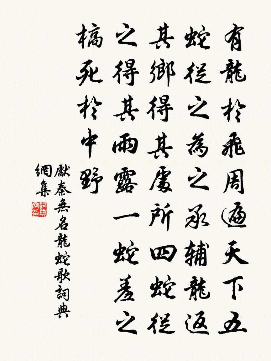 詩詞名句歷史字典書法欣賞書法字典國語詞典說文解字康熙字典古漢語字典標 題 作 者 詩 句 龍蛇歌作者:先秦無名 朝代:先秦龍蛇歌原文有龍于飛。周遍天下。五蛇從之。為之承輔。龍返其鄉。得其處所。四蛇從之。得其雨露。一蛇羞之。槁死於中野。詩詞問答問:龍蛇歌的作者是誰?答:先秦無名問:龍蛇歌寫於哪個朝代?答:先秦問:龍蛇歌是什麼體裁?答:樂府先秦無名龍蛇歌書法欣賞龍蛇歌書法作品詩詞推薦秋夕送友人歸吳崔塗〔唐代〕離心醉豈歡,把酒強相寬。世路須求達,還家亦未安。旅程愁算遠,江月坐吟殘。莫羨扁舟興,功成去不難。有感 其三王冕〔元代〕慷慨看雙劍,淒涼獨老翁。不嫌天地窄,殊覺路途窮。茅屋荒山雨, * 曠野風。人情只如此,何必問英雄?西湖雜興二首高翥〔宋代〕十三樓寺早餐飯,六一泉寺晚詠歌。坐斷竹風無暑氣,乳禽鳴處綠陰多。治圃雜書二十首方回〔宋代〕徑捷人蹤雜,牆頹地界斜。織籬呼野老,烹茗諭鄰家。舊穴通羊豕,新畦隔芋瓜。尚當分汝果,幸勿竊予花。春日郊行和郭希魯二首王之道〔宋代〕坐對煙江疊嶂圖,何如門外翠屏紆。尋芳敢擅攜筇去,命友應從折簡呼。酒里光陰閒活計,詩餘情思靜功夫。浪吟花障姚中一〔宋代〕綠外穠黃白外紅,一屏香錦立春風。天真步障豪難敵,借與王家賽石崇。蝶戀花 月下醉書雨岩石浪辛棄疾〔宋代〕九畹芳菲蘭佩好。空谷無人,自怨蛾眉巧。寶瑟泠泠千古調。朱絲弦斷知音少。冉冉年華吾自老。水滿汀洲,何處游雲溪與郡宴用太守韻即事二首戴復古〔宋代〕溪堂久矣無人到,千騎傳呼五馬來。流水奔騰砥柱立,好山呈露晚雲開。指揮壯士馳驍騎,管領衰翁弔古梅。笑問負暄趙蕃〔宋代〕天公知我寒無褐,惠以檐間百尺裘。挾纊固殊如是想,索衣不嘆晚為謀。神融遽合莊周夢,意氣俄乘竹葉舟。側聽望渦流辭晁補之〔宋代〕望渦流兮浼浼,勢南折兮東還。水沖隈兮岸圮,嗟龍去兮幾年。俛余進兮藂祠,儼帝服兮神冠。牆壁繢兮怪奇,泯王郎中妓席五詠箏顧況〔唐代〕秦聲楚調怨無窮,隴水胡笳咽復通。莫遣黃鶯花里囀,參差撩亂妒春風。·106 ·酬梁二十宋中所贈兼留別梁少府獨孤及〔唐代〕少讀黃帝書,肯不笑機事。意猶負深衷,未免名跡累。厭貧學乾祿,欲徇賓王利。甘為風波人,豈復江海意。擔簦貽白永年詩樵夫〔唐代〕清秋無所事,乘露出遙天。憑仗樵人語,相期白永年。宮烏棲趙嘏〔唐代〕宮烏棲處玉樓深,微月生檐夜夜心。香輦不回花自落,春來空佩辟寒金。棕拂子杜甫〔唐代〕棕拂且薄陋,豈知身效能。不堪代白羽,有足除蒼蠅。熒熒金錯刀,擢擢朱絲繩。非獨顏色好,亦用顧盼稱。吾老某夏夜酣寢飄然身若凌雲其覺也作夢遊仙以原李新〔宋代〕飄飄夜半身凌雲,夢與群仙遊玉京。龍虎騰驤爭引導,侍童羅絡甘蓬迎。絳幡羽扇前驅列,寶蓋華旗助旌節。鈞天擬古納蘭性德〔清代〕朔風吹古柳,時序忽代續。庭草萎已盡,顧視白日速。吾本落拓人,無為自拘束。倜儻寄天地,樊籠非所欲。嗟載次王兄韻二首劉宰〔宋代〕賣屋依三阜,開窗對兩池。去來誰是主,空鎖壁間詩。竇三中丞去歲有台中五言四韻未及酬…因追曩篇持以贈之武元衡〔唐代〕在昔謬司憲,常僚惟有君。報恩如皎日,致位等青雲。削藁書難見,除苛事早吟。雙旌不可駐,風雪路岐分。句崔子方〔宋代〕白日行空闊,青燈耿夜闌。名句推薦人情反覆,世路崎嶇。洪應明《菜根譚·概論》 願借天風吹得遠,家家門巷盡成春。李方膺《題畫梅》 人生易老天難老,歲歲重陽。 * 《採桑子·重陽》 落魄江南載酒行,楚腰纖細掌中輕。杜牧《遣懷》 思則有備,有備無患左丘明《左傳·襄公·襄公十一年》 情知已被山遮斷,頻倚闌乾不自由。辛棄疾《鷓鴣天·晚日寒鴉一片愁》 知是人家花落盡,菜畦今日蝶來多。高啟《春暮西園》 今年海角天涯。蕭蕭兩鬢生華。李清照《清平樂·年年雪裡》 那作商人婦,愁水復愁風。李白《長干行二首》 笑拈芳草不知名,乍凌波、斷橋西堍。吳文英《西子妝慢·湖上清明薄游》