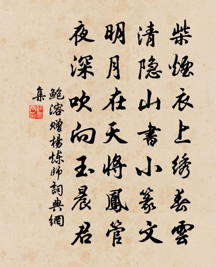 詩詞名句歷史字典書法欣賞書法字典國語詞典說文解字康熙字典古漢語字典標 題 作 者 詩 句 贈楊鍊師作者:鮑溶 朝代:唐代贈楊鍊師原文柴煙衣上繡春雲,清隱山書小篆文。明月在天將鳳管,夜深吹向玉晨君。詩詞問答問:贈楊鍊師的作者是誰?答:鮑溶問:贈楊鍊師寫於哪個朝代?答:唐代鮑溶贈楊鍊師書法欣賞贈楊鍊師書法作品詩詞推薦自桃川至辰州絕句四十有二趙蕃〔宋代〕患難嗟予已素行,今朝灘里挽仍撐。心乎詎敢懷尤怨,命爾何能計死生。醉和顏美中元夕絕句趙釴夫〔宋代〕年年人月喜團圓,好在詩邊又酒邊。莫道玄真只漁釣,也隨世俗夜無眠。小圃茅亭初成即事十絕句程公許〔宋代〕鑒池取月未傷廉,何必蓮峰詫藉船。少待清渠通綠溜,醉歌綠幰鑒明蠲。昭君辭薛道衡〔隋代〕我本良家子。充選入椒庭。不蒙女史進。更失畫師情。蛾眉非本質。蟬鬢改真形。專由妾命薄。誤使君恩輕。啼沾太皇太后合春帖子六首蘇頌〔宋代〕荊楚牛人敺厲氣,安豐棗臘祀蒼精。聖朝雖舉前朝事,不為禳祈為勸耕。菩薩蠻·風柔日薄春猶早李清照〔宋代〕風柔日薄春猶早,夾衫乍著心情好。睡起覺微寒,梅花鬢上殘。故鄉何處是?忘了除非醉。瀋水臥時燒,香消酒未賀中齋黃大卿得子何夢桂〔宋代〕聞說南山孕鳳雛,嶄然頭角嶔{上山下欺}。月宮仙桂托根異,海島蟠桃生子遲。七秩高年堂上父,一生足事膝間豫章行曹植〔魏晉〕窮達難豫圖。禍福信亦然。虞舜不逢堯。耕耘處中田。太公未遭文。漁釣終渭川。不見魯孔丘。窮困陳蔡間。周公醉蓬萊(擬人賀生日)史浩〔宋代〕紀今辰高會,屈指三朝,更逢重九。珠履瑤簪,聚一天星斗。菊蕊含芳,桂花籠艷,有美容爭秀。袞繡堂中,蓬壺冬日宴於庶子宅各賦一字得鮮劉孝孫〔唐代〕解襟游勝地,披雲促宴筵。清文振筆妙,高論寫言泉。凍柳含風落,寒梅照日鮮。驪歌雖欲奏,歸駕且留連。【南呂】一枝花_不戀蝸角名孫叔順〔元代〕不戀蝸角名,豈問蠅頭利?世情看冷暖,人面逐高低。閒是閒非,僻掉的都伶俐,百年身圖畫裡。本待要快活逍遙女人唐寅〔明代〕這個女人不是人,九天仙女下凡塵。養個兒子會做賊,偷得蟠桃供母親。浣溪沙葛勝仲〔宋代〕今夜風光戀渚苹。欲教四角出車輪。金釵離立座生春。神女恍驚巫峽夢,飛瓊原是閬風人。詔封后院寵儒臣。新營別墅寄家兄竇鞏〔唐代〕懶性如今成野人,行藏由興不由身。莫驚此度歸來晚,買得西山正值春。妙嚴禪寺徐似道〔宋代〕宿霧釀成三日雨,曉風鏖退一天雲。落花院宇渾無事,閒拂碑塵看斷文。簡高澹軒姜竹野〔宋代〕西風籬下菊班班,想得吟肩正聳山。急遣曲生陪杖履,要傳好句出人間。句崔仲容〔唐代〕妾心合君心,一似影隨形。梁燕無情困,雙棲語此時。不覺紅顏去,空嗟白髮生。桐花落盡春又盡,紫塞征人猶未喜雨杜甫〔唐代〕春旱天地昏,日色赤如血。農事都已休,兵戈況騷屑。巴人困軍須,慟哭厚土熱。滄江夜來雨,真宰罪一雪。谷根李參政約至井監偶得三絕魏了翁〔宋代〕忽聞車馬下天來,擁術闐衢撥不開。六十七年無此客,灶前老隸亦驚猜。一叢花(再呈十二叔)晁補之〔宋代〕飛鳧仙令氣如虹。脫屐向塵籠。凌煙畫像雲台議,似眼前、百草春風。盞里聖賢,壺中天地,高興更誰同。應懷得名句推薦千門萬戶曈曈日,總把新桃換舊符。王安石《元日》 李杜詩篇萬口傳,至今已覺不新鮮。趙翼《論詩五首》 為問元戎竇車騎,何時返旆勒燕然。皇甫冉《春思》 日上,正赤如丹,下有紅光,動搖承之。姚鼐《登泰山記》 未必素娥無悵恨,玉蟾清冷桂花孤。晏殊《中秋月》 無聊成獨臥,彈指韶光過。納蘭性德《菩薩蠻·新寒中酒敲窗雨》 芳菲歇去何須恨,夏木陰陰正可人。秦觀《三月晦日偶題》 綺席象床寒玉枕,美人何處醉黃花。汪元量《望江南·幽州九日》 瀚海百重波,陰山千里雪。李世民《飲馬長城窟行》 野梅燒不盡,時見兩三花劉基《古戍》