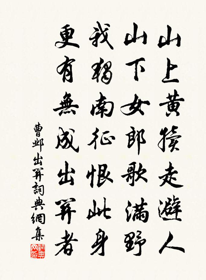 詩詞名句歷史字典書法欣賞書法字典國語詞典說文解字康熙字典古漢語字典標 題 作 者 詩 句 出關作者:曹鄴 朝代:唐代出關原文山上黃犢走避人,山下女郎歌滿野。我獨南征恨此身,更有無成出關者。詩詞問答問:出關的作者是誰?答:曹鄴問:出關寫於哪個朝代?答:唐代問:出關是什麼體裁?答:七絕曹鄴出關書法欣賞出關書法作品注釋全唐詩詩詞推薦代人傷往詩 一庾信〔南北朝〕青田松上一黃鶴。相思樹下兩鴛鴦。無事交渠更相失。不及從來莫作雙。點絳唇張元乾〔宋代〕畫閣深圍,暖紅光里芳林影。暗香成陣。上下花相映。倒掛疏枝,月落參橫冷。休裝景。要人酒醒。除是花枝並。長相思程垓〔宋代〕酒孤斟。客孤吟。戲馬台荒露草深。英雄何處尋。愛登臨。莫登臨。定是愁來關客心。暮天煙水沈。赴蘇州至常州,答賈舍人白居易〔唐代〕杭城隔歲轉蘇台,還擁前時五馬回。厭見簿書先眼合,喜逢杯酒暫眉開。未酬恩寵年空去,欲立功名命不來。一別八月十王日夜寄友人司馬光〔宋代〕故人音信絕,對月動相思。清露滴紅葉,此懷當告誰。秋風廣陵郭,正是望濤時。水龍吟(雲意)高觀國〔宋代〕舊家心緒如雲,乍舒乍卷初無定。西郊載雨,東城隔霧,還開晴景。愛惱花陰,喜移月地,朦朧清影。任無心有意海棠二首吳融〔唐代〕太尉園林兩樹春,年年奔走探花人。今來獨倚荊山看,回首長安落戰塵。雲綻霞鋪錦水頭,占春顏色最風流。若教薔薇陸龜蒙〔唐代〕倚牆當戶自橫陳,致得貧家似不貧。外布芳菲雖笑日,中含芒刺欲傷人。清香往往生遙吹,狂蔓看看及四鄰。遇有雪後晚晴,四山皆青,惟東山全白。賦最愛東楊萬里〔宋代〕只知逐勝忽忘寒,小立春風夕照間。最愛東山晴後雪,軟紅光里涌銀山。又和病中遣懷釋寶曇〔宋代〕聞公多病正緣詩,酷似梅花太瘦時。故憶主人鷗去近,尚留賓客鶴歸遲。把麾定復追蘇子,鼓瑟無因見孺悲。已辦園中二首晁公溯〔宋代〕眇眇周垣總路平,森森夏木已陰成。卻疑身在華軒上,翠幄中間曳杖行。送張君玉赴寧江幕府七首晁公溯〔宋代〕來守劍西三里城,胸中豈止俗塵生。簿書堆案惟思睡,見此魁梧覺眼明。頌古十九首釋慧暉〔宋代〕心徑苔生何處去,謝家人不在漁船。蘆花萬頃水天闊,白鳥深沉任轉旋。劉公詩孔武仲〔宋代〕原甫吾不識,聞之士大夫。少時已絕群。卓牽千里駒。讀書足智慮,萬卷力有餘。善發六藝蘊,高談詆先儒。天文臨江仙(閒居感舊)劉辰翁〔宋代〕昔走都門終夜雨,明朝泥淖堪驚。疏疏點點忽難鳴。數峰青似染,快活早來晴。十五年間春夢斷,亂山寒食清明。奉和虢州劉給事使君三堂新題二十一詠荷池韓愈〔唐代〕風雨秋池上,高荷蓋水繁。未諳鳴摵摵,那似卷翻翻。宴湖上呈穉卿韓維〔宋代〕熠熠螢光草際流,及時高宴落霞洲。繁弦急管宜清月,細蕊濃芳艷晚秋。飛鷺欲來迎畫舫,跳鱗如喜脫金鉤。知公奉和袁陟〔宋代〕客意正索寞,詩筒江際來。一聞清玉韻,如見翠屏開。磅礴雲霄外,騰凌鸞鳳回。仙源朝路蔽,乳寶夜風豗。九月郊廟朝會歌辭紹熙元年恭上壽星聖皇太后至尊佚名〔宋代〕鐘鼓交作,文物鹹德。彤庭玉階,天子是蒞。咨爾輔臣,展采錯事。輔臣稽首,敢不率禮。南溪書院楊發〔唐代〕茅屋住來久,山深不置門。草生垂井口,花發接籬根。入院將雛鳥,攀蘿抱子猿。曾逢異人說,風景似桃源。名句推薦團扇不搖風自舉,盈盈翠竹,纖纖白薴,不受些兒暑。文徵明《青玉案·庭下石榴花亂吐》 日暮長江里,相邀歸渡頭。儲光羲《江南曲四首》 年少萬兜鍪,坐斷東南戰未休。辛棄疾《南鄉子·登京口北固亭有懷》 泥上偶然留指爪,鴻飛那復計東西。蘇軾《和子由澠池懷舊》 對望中天地,洞然如刷。史達祖《滿江紅·中秋夜潮》 灞原風雨定,晚見雁行頻。馬戴《灞上秋居》 投我以桃,報之以李。佚名《抑》 遙知獨聽燈前雨,轉憶同看雪後山。納蘭性德《於中好·送梁汾南還為題小影》 國君好仁,天下無敵焉。孟子《孟子·盡心章句下·第四節》 焚琴煮鶴從來有,惜玉憐香幾個知!馮夢龍《醒世恆言·卷三》