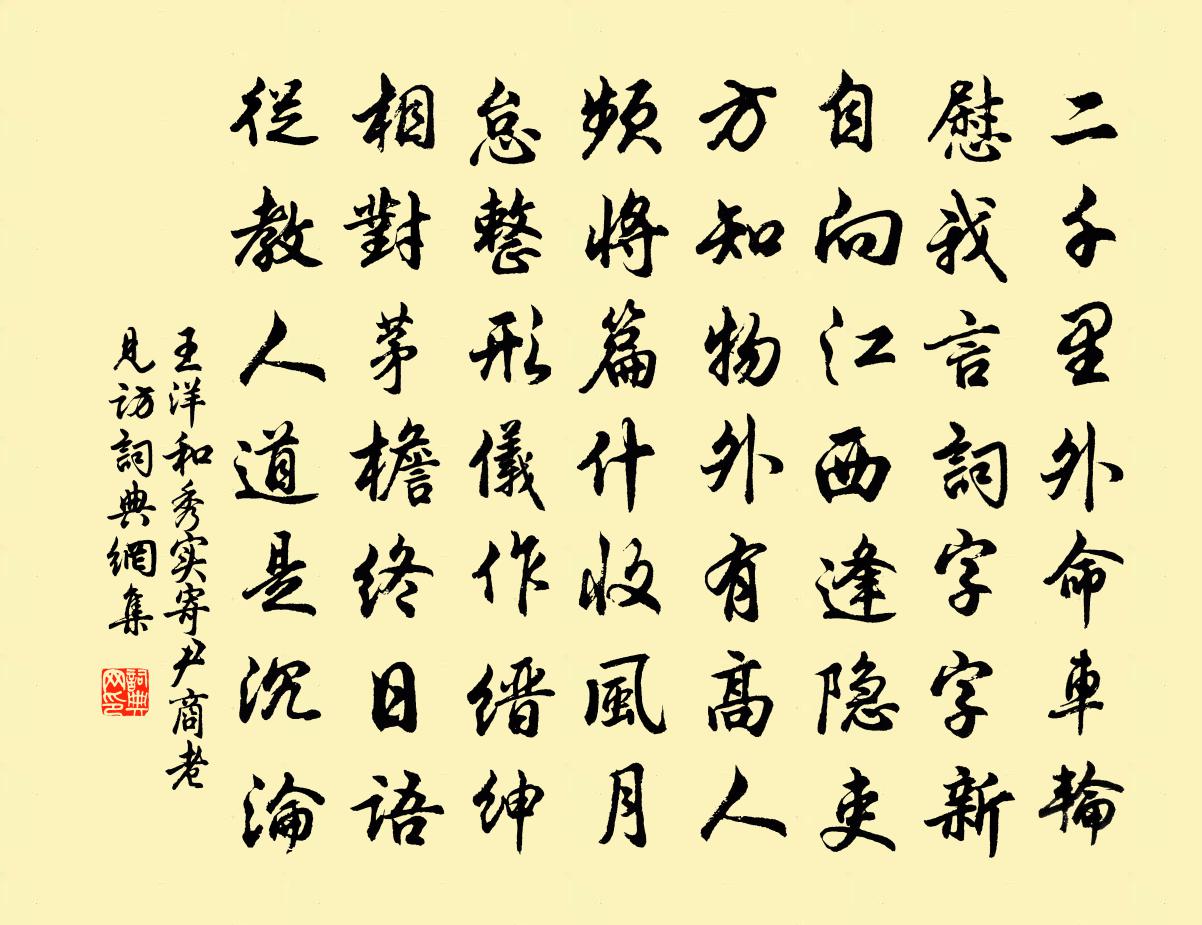 詩詞名句歷史字典書法欣賞書法字典國語詞典說文解字康熙字典古漢語字典標 題 作 者 詩 句 和秀實寄尹商老見訪作者:王洋 朝代:宋代和秀實寄尹商老見訪原文二千里外命車輪,慰我言詞字字新。自向江西逢隱吏,方知物外有高人。頻將篇什收風月,怠整形儀作縉紳。相對茅檐終日文,從教人道是沉淪。詩詞問答問:和秀實寄尹商老見訪的作者是誰?答:王洋問:和秀實寄尹商老見訪寫於哪個朝代?答:宋代王洋和秀實寄尹商老見訪書法欣賞和秀實寄尹商老見訪書法作品詩詞推薦題顏範祠堂喻良能〔宋代〕聖宋神唐兩鉅人,高風勁節許誰倫。闉闍自昔宜雙廟,輪奐於今始一新。破敵威名優魏國,偃藩功業過張巡。後先和真州太守營屋新成之韻三首劉宰〔宋代〕經始南風詠有虞,落成候筦報秋功。連薨盡撤編茅舊,萬灶重新列屋居。千里只今成保障,一廛誰復等蘧廬。何人庚戌歲除強至〔宋代〕薄宦三冬暮,殊方一紀餘。笑歌筋力倦,勳業鬢毛疏。道路紛乘傳,軒墀遝曳裾。無庸看半百,搔首歲雲除。戲題林靈素書像佚名〔宋代〕當日先生在市塵,世人那識是真仙。只因學得飛升後,難犬隨也上天。聞哭者白居易〔唐代〕昨日南鄰哭,哭聲一何苦。雲是妻哭夫,夫年二十五。今朝北里哭,哭聲又何切。雲是母哭兒,兒年十七八。四鄰周尹潛雪中過門不我顧遂登西樓作詩見寄次韻陳與義〔宋代〕堪笑臞仙也耐寒,飛花端合上樓看。深知壯觀增詩律,洗盡元和到建安。米元章有帖雲老弟山林集多於眉陽集然不襲古劉克莊〔宋代〕大令雲亡筆不傳,世無行草已千年。偶然遺下鵝群帖,生出楊風與米顛。敷文閣學士李仁甫輓詞十絕周必大〔宋代〕是是非非口即心,掃除人偽只天真。身全五福仍通貴,造物因公勸善人。兩山間王安石〔宋代〕自予營北渚,數至兩山間。臨路愛山好,出山愁路難。山花如水淨,山鳥與雲閒。我欲拋山去,山仍勸我還。祗應江城子(盆中梅)呂勝己〔宋代〕年年臘後見冰姑。玉肌膚。點瓊酥。不老花容,經歲轉敷腴。向背稀稠如畫裡,明月下、影疏疏。江南有客問征途暑熱白玉蟾〔宋代〕玉友避嫌,竹奴專寵。聽官丐閒,詩勇不將。春秋戰國門子產周曇〔唐代〕為政何門是化源,寬仁高下保全全。如嫌水德人多狎,拯溺宜將猛濟寬。代作五首項安世〔宋代〕晝漏如今天共永,壽辰於此數難量。三千花實桃猶小,五日春秋木未長。羲宅巧占堯火正,娥宮新學羿弦張。兩輪長安秋望杜牧〔唐代〕樓倚霜樹外,鏡天無一毫。南山與秋色,氣勢兩相高。即席陸游〔宋代〕長魚腹腴羊臂臑,饞想久矣無秋毫。今朝林下煨苦筍,更覺此君風味高。趙高徐鈞〔宋代〕閹奴久矣擅秦權,鹿馬欺君亦熱然。輒向望夷行弒逆,此身不殺是無天。春雪四首趙蕃〔宋代〕喔喔雞啼墅,狺狺犬吠村。遇樵微有路,因汲半開門。老子將停軌,輿人請載奔。詰朝如未已,兀坐復奚論。我亦內鄉天春亭邵雍〔宋代〕內鄉有園名天春,春時桃李如彩雲。邑民攜觴連簾幕,或歌或舞何歡欣。縣尹中間意自若,直謂前世無古人。牡丹詠醉楊億〔宋代〕劉伶石五斗,康成三百杯。欹斜星弁側,嵬峨玉山頹。人語蜩螗沸,天形帟幕開。應知是狂藥,何不學顏回。秀州道中游九言〔宋代〕一春煙雨歇空濛,高下川原杳靄中。畢竟春光遮不得,滿村花柳自青紅。名句推薦行高者,名自高。人所重,非貌高。李毓秀《弟子規·泛愛眾》 天蒼蒼,野茫茫。風吹草低見牛羊。佚名《敕勒歌》 欹枕數秋天,蟾蜍下早弦。納蘭性德《菩薩蠻·蕭蕭幾葉風兼雨》 當斷不斷,反受其亂班固《漢書·傳·高五王傳》 蓮朝開而暮合,至不能合,則將落矣王永彬《圍爐夜話·第六九則》 況是清明好天氣,不妨游衍莫忘歸。程顥《郊行即事》 才過斜陽,又是黃昏雨。晏幾道《蝶戀花·笑艷秋蓮生綠浦》 湖闊兼雲霧,樓孤屬晚晴。杜甫《陪裴使君登岳陽樓》 野者上,園者次。陸羽《茶經·一之源》 別離在今晨,見爾當何秋。韋應物《送楊氏女》