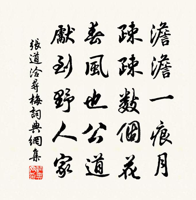 詩詞名句歷史字典書法欣賞書法字典國語詞典說文解字康熙字典古漢語字典標 題 作 者 詩 句 尋梅作者:張道洽 朝代:宋代尋梅原文澹澹一痕月,疎疎數個花。春風也公道,先到野人家。詩詞問答問:尋梅的作者是誰?答:張道洽問:尋梅寫於哪個朝代?答:宋代張道洽尋梅書法欣賞尋梅書法作品詩詞推薦寒食臨川道中陸游〔宋代〕百卉千花了不存,墮溪飛絮看無痕。家人自作清明節,老子來穿綠暗村。日落啼鴉隨野祭,雨余荒蔓上頹垣。道邊澗舖嶺趙蕃〔宋代〕登山自不惡,飛雪況相仍。照映慚非璧,攀援笑引繩。向來聞矻矻,今日上層層。可但長安道,騎驢覓句能。蝶戀花(神仙十首)張掄〔宋代〕碧海沈沈西極遠。閒訪□□,□□□□□。恰值群仙來閬苑。相將□□□□□。□□□□誰得見。五彩□□,□□下第送張霞歸覲江南李洞〔唐代〕此道背於時,攜歸一軸詩。樹沈孤鳥遠,風逆蹇驢遲。草入吟房壞,潮沖釣石移。恐傷歡覲意,半路摘愁髭。感皇恩 癸未重午日,冶頭回轡,得感皇恩一王惲〔元代〕之情也。示秀才鄭彥通流水小橋橫,冶頭沙路。一道清陰轉林塢。滿襟涼潤,猶是夜來新雨。幽禽*客至、如晤語浣溪沙晏幾道〔宋代〕小杏春聲學浪仙。疏梅清唱替哀弦。似花如雪繞瓊筵。腮粉月痕妝罷後,臉紅蓮艷酒醒前。今年水調得人憐。同程九早入中書(一作錢起詩)錢〔唐代〕漢家賢相重英奇,蟠木何材也見知。不意雲霄能自致,空驚鷺忽相隨。臘雪初明柏子殿,春光欲上萬年枝。獨慚皇除夕和唐人張繼張佑即事四絕句程公許〔宋代〕一笑升沉休問天,贊房贏得日高眠。五湖浪透門前港,何不乘風稱放船。餞趙物斛三首吳潛〔宋代〕九折羊腸路險巘,險巘過了始平夷。風霜雨露無非教,菌槿椒蘭各有時。退步元來天地闊,捫心自是鬼神知。莫嫌賜諸州刺史以題座右李隆基〔唐代〕眷言思共理,鑒夢想維良。猗歟此推擇,聲績著周行。賢能既俟進,黎獻實佇康。視人當如子,愛人亦如傷。講學題童壽卿博雅堂王炎〔宋代〕會道莫如約,要識胸中真。講學亦貴博,不廢紙上陳。王充與李邕,世豈無若人。中秘未許見,市肆何所聞。童君秋風李廌〔宋代〕萬籟靜中起,扶搖風怒號。半天鳴劍戟,平地卷波濤。鷁退宋都疾,鵬摶溟海高。賀蘭吹不盡,何用戰蓬蒿。水犀重開史彌寧〔宋代〕不見岩犀整一秋,厭厭對我訴清愁。公筵餘瀝何曾見,兩度開花只暗投。謾題舒邦佐〔宋代〕世網角雄雄,官途爭是非。人方酣蟻戰,吾自送鴻飛。蘇明允宗丈輓辭二首蘇頌〔宋代〕嘗論平陵系,吾宗代有人。源流知所自,道義更相親。痛惜才高世,齎咨涕滿巾。又知餘慶遠,二子志經綸。郊廟歌辭。享太廟樂章。歆和佚名〔唐代〕崇禋已備,粢盛聿修。潔誠斯展,鍾石方遒。秋溪獨坐薛能〔唐代〕黃葉分飛砧上下,白雲零落馬東西。人生萬意此端坐,日暮水深流出溪。送無灰酒周馬師口占三絕劉宰〔宋代〕乞得閒身荷對朝,舊棲佳處日逍遙。卻憐赤壁歸來日,歌舞樽前祗小喬。物外雜題陸游〔宋代〕粉堞臨江渚,朱橋枕市樓。長吟策小蹇,又度一年秋。是非吟邵雍〔宋代〕是短非長,好丹非素。一生區區,未免愛惡。愛惡不去,何由是非。愛惡既去,是非何為。名句推薦忙日苦多閒日少,新愁常續舊愁生。陸游《浣溪沙·和無咎韻》 青青子衿,悠悠我心。佚名《子衿》 對茲佳品酬佳節,桂拂清風菊帶霜。曹雪芹《螃蟹詠》 南朝四百八十寺,多少樓台煙雨中。杜牧《江南春》 塞北梅花羌笛吹,淮南桂樹小山詞。劉禹錫《楊柳枝詞九首·其一》 何事非相思,江上葳蕤竹。吳均《登二妃廟》 淮南皓月冷千山,冥冥歸去無人管。姜夔《踏莎行·自沔東來》 閒倚博山長嘆,淚流沾皓腕。韋莊《歸國遙·春欲晚》 西風惡。數聲新雁,數聲殘角。黃機《憶秦娥·秋蕭索》 在上不驕,高而不危;制節謹度,滿而不溢。孔子及其弟子《孝經·諸侯》