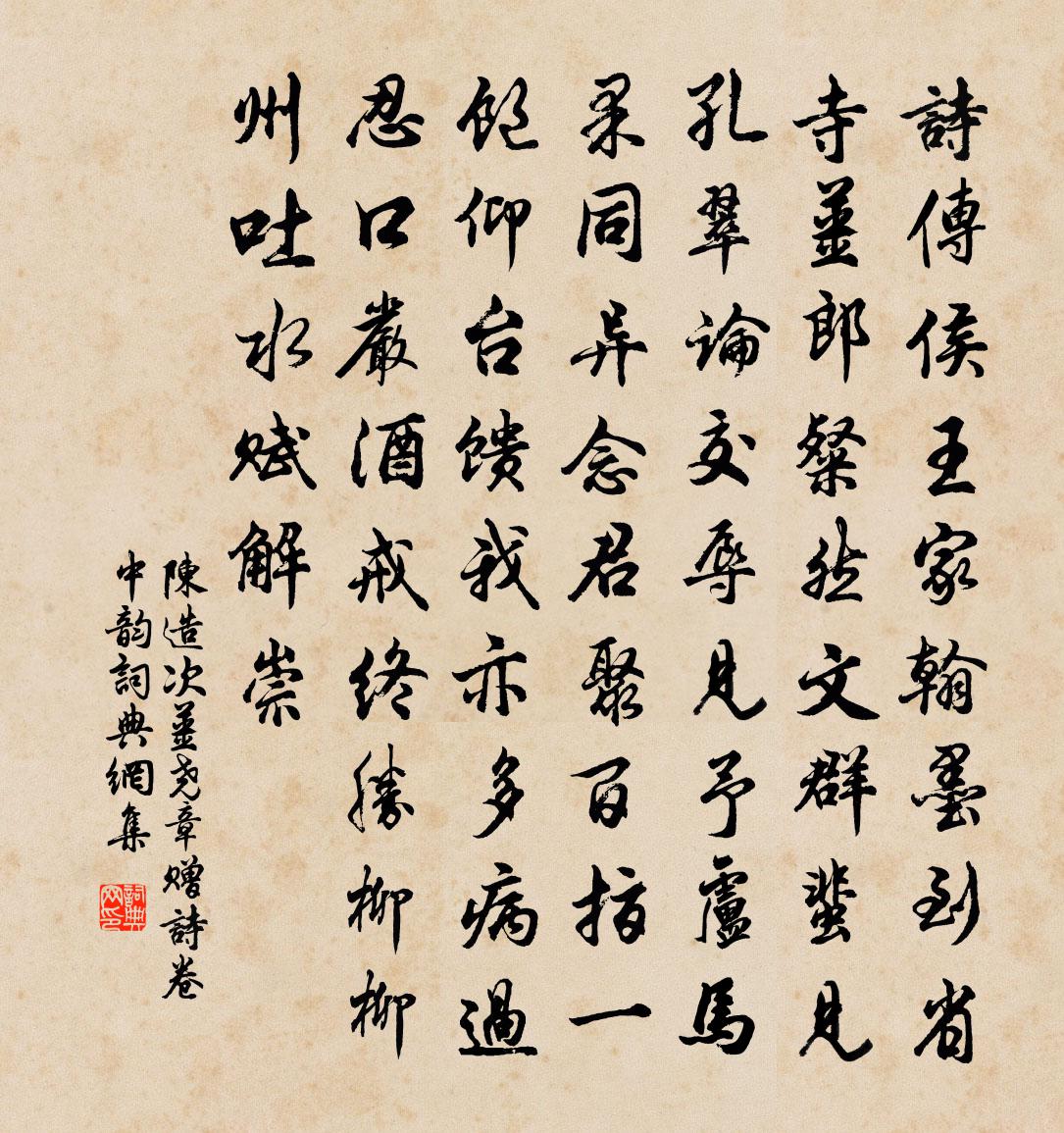 詩詞名句歷史字典書法欣賞書法字典國語詞典說文解字康熙字典古漢語字典標 題 作 者 詩 句 次姜堯章贈詩卷中韻作者:陳造 朝代:宋代次姜堯章贈詩卷中韻原文詩傳侯王家,翰墨到省寺。姜郎粲然文,群蜚見孔翠。論交辱見予,盧馬果同異。念君聚百指,一飽仰台饋。我亦多病過,忍口嚴酒戒。終勝柳柳州,吐水賦解崇。詩詞問答問:次姜堯章贈詩卷中韻的作者是誰?答:陳造問:次姜堯章贈詩卷中韻寫於哪個朝代?答:宋代陳造次姜堯章贈詩卷中韻書法欣賞次姜堯章贈詩卷中韻書法作品詩詞推薦頌古三十三首釋師觀〔宋代〕來說是非者,便是是非人。誠哉是言也,弄物不知名。主人司空見和未開牡丹,輒卻奉和孫魴〔唐代〕把筆臨芳不自怡,首征章句促妖期。已驚常調言多鄙,遽捧高吟愧可知。絕代貞名應愈重,千金方笑更難移。狂歌葉道卿監太平州宋祁〔宋代〕堵波題墨素塵昏,犀棹橫江重黯魂。束帙乍拋三鐵{擿扌換木},將軍兼映兩朱輪。淋漓鷺下秋濤闊,蹀{左足右九日三首蘇轍〔宋代〕解衣換村酒,酒薄不須嫌。節到勿空過,杯行且強拈。得閒身尚健,適意事難兼。醉臥南窗日,誰知酸與甜。和圓機佳作晁說之〔宋代〕官憎詩過好,人亦忌才多。君子自如此,伊人其奈何。單裘千日醉,短髮百年歌。謾納新愁淚,終慚帶女蘿。南歌子王吉昌〔元代〕絕念驅群醜,澄心剿萬緣。內樞橐龠息綿綿。一貫三宮,經緯契周天。火力溫金鼎,明循六百篇。烹成二八體方圓西江月佚名〔宋代〕早歲輕衫短帽。中間圓頂方袍。忽然天賜降宸毫。接引私心入道。可謂一身三教。如今且得逍遙。擎拳稽首拜雲霄散懷陸游〔宋代〕少年已遂遯山林,何況霜毛兩鬢侵。習氣尚存詩入夢,病根未去藥關心。猿知秋近啼先苦,鶴閱年多頂漸深。不忍同吳王送杜秀芝赴舉入京李白〔唐代〕秀才何翩翩,王許回也賢。暫別廬江守,將游京兆天。秋山宜落日,秀水出寒煙。欲折一枝桂,還來雁沼前。壽皇太子趙彥端〔宋代〕二聖多能似仲尼,儲皇家學自庭圍。銀鉤已有淳熙腳,玉句仍傳德壽衣。出江鄭剛中〔宋代〕隨緣禽在籠,觀道蟻旋磨。忽此作江行,開窗得虛坐。回首城邑卑,極目天地大。千山雨後綠,瘴煙不敢涴。古木同李十二醉飲王氏牡丹園二首張耒〔宋代〕東風窮巷只埃塵,誰見城南萬朵新。不問主人聊一飲,為攜佳客送余春。比君意氣三年老,貸我疏狂一味真。醉里寄謝新安豐守胡達孝見遺近詩一軸便呈甘叔異趙蕃〔宋代〕向子識損益,揚雄愛清靜。我行蕭灘上,二宅駕輒命。而於酬唱中,又得胡安豐。詩作文選體,字有眉山蹤。掃門舉葦航適安飲陳起〔宋代〕觥籌交錯舞傞傞,延得嫦娥泛醁波。客謂平生無此樂,二章聊繼飲中歌。放言王禹偁〔宋代〕人生唯問道如何,得喪升沉總是虛。寧可飛鳥隨四皓,未能魚腹葬三閭。傅岩偶夢誰調鼎,彭澤高歌自荷鋤。不向望蓬萊 紙旗上書王哲〔元代〕邊境靜,乞覓得便宜。戰鼓復為韶樂鼓,征旗還作化緣旗。便見太平時。那減舍,第一莫遲遲。王哲害風無憂子,浣溪沙姚述堯〔宋代〕乳酒初頒菊正黃。去年高宴近清光。朝回猶帶御爐香。暫向花封陪客醉,已聞芝檢促歸裝。昌黎寧許到潮陽。資水橋張方〔宋代〕二里橋頭車馬行,靈龜背後玉龍橫。漲瀧往日驚河伯,砥柱千年要石兄。資水右旋江會合,天台西直卦文明。吾心雨後游大愚蘇轍〔宋代〕風光四月尚春余,淫雨初乾積潦除。寺蕭條仍負郭,閒官疏散亦肩輿。摘茶戶外烝黃葉,掘筍林中間綠蔬。一飽人南柯子 再用前韻袁易〔元代〕綠酒忘年友,黃花入幕賓。狂歌鼓腹混堯民。冷笑世間,名利細如塵。二妙真無敵,千篇轉逼人。蛟龍驚避噤無神名句推薦為有書來與我期,便從蘭杜惹相思。莊棫《定風波·為有書來與我期》 故人何處。帶我離愁江外去。呂本中《減字木蘭花·去年今夜》 憶昔花間相見後,只憑縴手,暗拋紅豆。歐陽炯《賀明朝·憶昔花間相見後》 暖風熏得遊人醉,直把杭州作汴州。林升《題臨安邸》 芳草平沙,斜陽遠樹,無情桃葉江頭渡。張翥《踏莎行·芳草平沙》 白頭宮女在,閒坐說玄宗。元稹《行宮》 不戚戚於貧賤,不汲汲於富貴。陶淵明《五柳先生傳》 吾所以有大患者,為吾有身,及吾無身,吾有何患?老子《老子·道經·第十三章》 曉風催我掛帆行,綠漲春蕪岸欲平。查慎行《曉過鴛湖》 那堪更被明月,隔牆送過鞦韆影。張先《青門引·春思》