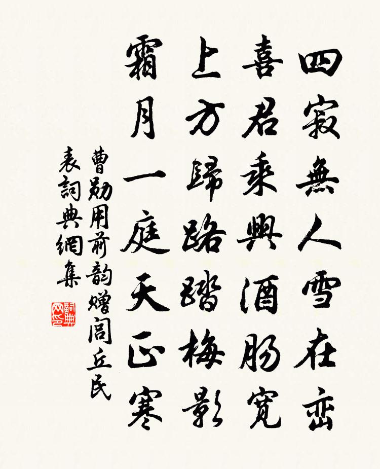 詩詞名句歷史字典書法欣賞書法字典國語詞典說文解字康熙字典古漢語字典標 題 作 者 詩 句 用前韻贈閭丘民表作者:曹勛 朝代:宋代用前韻贈閭丘民表原文四寂無人雪在巒,喜君乘興酒腸寬。上方歸路踏梅影,霜月一庭天正寒。詩詞問答問:用前韻贈閭丘民表的作者是誰?答:曹勛問:用前韻贈閭丘民表寫於哪個朝代?答:宋代曹勛用前韻贈閭丘民表書法欣賞用前韻贈閭丘民表書法作品詩詞推薦冬至陸游〔宋代〕老遇陽生海上村,川雲漠漠雨昏昏。鄰家祭徹初分胙,賀客泥深不到門。萬卷縱橫忘歲月,百年行止村乾坤。明朝次韻十絕修養樓鑰〔宋代〕聞道壺中別有天,能將俄頃比千年。千年俄頃俱成夢,只任天真卻晏然。瞿唐峽李石〔宋代〕我行江南上峽來,繫舟夜泊雲雨台。行到西川一萬里,杜鵑聲急桃花開。西江月佚名〔宋代〕 * 掀騰波浪,一堂慶會風雲。快乘霹靂化龍門。頭角人中有分。誰狀箇中佳致,須還筆掃千軍。是他畫手亦通神句朱公綽〔宋代〕諫草焚來應見史,橐金散盡只留書。滿庭芳 劉公索賢王哲〔元代〕智慧皆全,痴頑總至,兩般自是殊方。一能明哲,一個性迷荒。儘是靈中分定,各分別、此理昭彰。還知否,上人山居述懷薛嵎〔宋代〕山瓢動瀑冰,一枕曲肱清。未遇勤求日,非沽隱逸名。梅邊月在水,寒夜酒如兵。悟得乘除數,貧中心自平。謁趙東野羅椅〔宋代〕水樹搖窗榻見天,空花換盡我依然。吟情豁處因聞道,隱趣深來頗入禪。不以耳聽何用洗,且無琴在底須弦。未知次韻黃侍郎滄江海棠六絕魏了翁〔宋代〕妙處東皇可得知,溶溶生意不停機。雨寒日暴渾無賴,憑仗陽和為解圍。雜題陸游〔宋代〕黃庭兩卷伴身閒,盤篆香殘日未殘。泛泛孤身似萍葉,始知天地不勝寬。聞高侍御卒貶所李敬方〔唐代〕西京高院長,直氣似吾徒。走馬論邊備,飛聲感廟謨。官移人未察,身沒事多符。寂寞他年後,名編野史無。過李楫宅王維〔唐代〕閒門秋草色,終日無車馬。客來深巷中,犬吠寒林下。散發時未簪,道書行尚把。與我同心人,樂道安貧者。一罷謁金門朱雍〔宋代〕春太早。十二玉樓初曉。半額試妝深院悄。相逢何草草。臨水幽香縹緲。彷佛淡妝窺照。恰值日邊人未到。紛紛縈複次前韻四首呈二袁君並王君申祿方回〔宋代〕今代王摩詰,詩機織錦雲。高棋饒算數,善射較毫分。泥屨難相過,殘樽愧獨醺。何時重握手,星聚應天文。過家留一夕曹丈復和韻再作章甫〔宋代〕賢聖何曾時一中,扁舟但困打頭風。按田外嘆裹糧乏,還舍內嗟瓶粟空。論事時遭瞋目視,催科隔絕滿堂烘。匆匆贈別崔純亮孟郊〔唐代〕食薺腸亦苦,強歌聲無歡。出門即有礙,誰謂天地寬。有礙非遐方,長安大道傍。小人智慮險,平地生太行。鏡破和三四弟韻方岳〔宋代〕清明乍佳游,適與元巳並。但有松葉醪,寧須杏花餳。漁逢半篙綠,煙雨涵幽情。緬懷蘭亭人,高冢亦已平。空餘清洛張耒〔宋代〕清洛西風急,遙知故國秋。羇游成歲月,疏放合淹留。地迥驚身老,山高更旅愁。登臨有詞賦,不減在荊州。酒泉子 龍潭暮雲(在縣西通越門外三里)吳鎮〔元代〕旱則祈於此,風濤可畏)。三塔龍潭,古龍祠下千年跡,幾番殘*喜猶存。靜勝獨歸僧。陰森一徑松陰直。樓閣層西塞山下作韋莊〔唐代〕西塞山前水似藍,亂雲如絮滿澄潭。孤峰漸映湓城北,片月斜生夢澤南。爨動曉煙烹紫蕨,露和香蒂摘黃柑。他年名句推薦春路雨添花,花動一山春色。秦觀《好事近·夢中作》 兒童相見不相識,笑問客從何處來。賀知章《回鄉偶書二首·其一》 既秉上皇心,豈屑末代誚。謝靈運《七里瀨》 寒雨連天夜入吳,平明送客楚山孤。王昌齡《芙蓉樓送辛漸二首》 外內表里,自相副稱。王充《論衡·卷十三·超奇篇》 天下熙熙,皆為利來;天下攘攘,皆為利往。司馬遷《史記·貨殖列傳》 丹青不知老將至,富貴於我如浮雲。杜甫《丹青引贈曹將軍霸》 致虛極;守靜篤。萬物並作,吾以觀復。老子《老子·道經·第十六章》 試問閒愁都幾許?賀鑄《青玉案·凌波不過橫塘路》 金谷園中柳,春來似舞腰。李益《上洛橋》