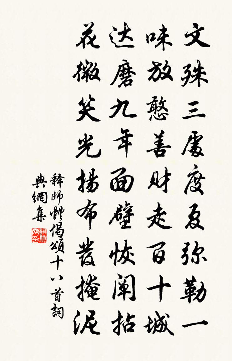 詩詞名句歷史字典書法欣賞書法字典國語詞典說文解字康熙字典古漢語字典標 題 作 者 詩 句 偈頌十八首作者:釋師體 朝代:宋代偈頌十八首原文文殊三處度夏,彌勒一味放憨。善財走百十城,達磨九年面壁。恢闡拈花微笑,光揚布發掩泥。詩詞問答問:偈頌十八首的作者是誰?答:釋師體問:偈頌十八首寫於哪個朝代?答:宋代釋師體偈頌十八首書法欣賞偈頌十八首書法作品詩詞推薦次韻奉答諸公汪大猷〔宋代〕衰年已過縱心期,安得聰明及往時。既老固應全晚節,雖貧豈暇計留資。元非矯飾求為異,自是行藏要合宜。曾記桐趙與□〔宋代〕晚來狂索酒,量大酒無功。窗豁能容月,樓高易得風。碎聲聞蟋蟀,疎影舞梧桐。夜半成清夢,江硝垂釣翁。滿江紅(和李穎士)趙善括〔宋代〕傳語風光,須少駐、共君流轉。誰忍見、綠肥紅瘦,鮮歡多感。澤國千絲煙雨暗,江成一帶雲山遠。看新荷、泛水和茅亦山韻二首黃庚〔宋代〕愛靜吟成僻,耽書近欲痴。事多因錯省,節不為貧移。長物新添畫,生涯舊有詩。窮通系天命,知命復何疑。同賈島宿無可上人院雍陶〔唐代〕何處銷愁宿,攜囊就遠僧。中宵吟有雪,空屋語無燈。靜境唯聞鐸,寒床但枕肱。還因愛閒客,始得見南能。長乾塔曾極〔宋代〕十丈祥光起相輪,鐵浮屠鎮法王墳。只愁西哉神僧至,夜捧長乾剎入雲。雜曲歌辭熱戲樂張祜〔唐代〕熱戲爭心劇火燒,銅槌暗執不相饒。上皇失喜寧王笑,百尺幢竿果動搖。雜曲歌辭。楊柳枝白居易〔唐代〕六么水調家家唱,白雪梅花處處吹。古歌舊曲君休聽,聽取新翻楊柳枝。陶令門前四五樹,亞夫營里百千條。何似贈畫士林堯卿游彥舉〔宋代〕古稱名畫顧丹青,遺蹟遠紹難其人。邇來忽覩林堯卿,繪像工無殊絕倫。解後俾爾寫吾形,妙處一筆奪天真。始知贈律師院朱慶餘〔唐代〕粉壁通蓮徑,扁舟到不迷。葦聲過枕上,湖色滿窗西。但見修行苦,誰論夏臘低。閒看種來樹,已覺與身齊。復用前韻且約攜琴尋花下之盟楊冠卿〔宋代〕吟箋寫就訊難通,人在千岩紫翠中。談笑尊罍有餘樂,交遊氣概壓群公。忘年許締金蘭好,佳處何妨杖履同。我欲念奴嬌(端午酒邊)陳著〔宋代〕雨簾高卷,見榴花、應怪風流人老。是則年年佳節在,無奈閒心悄悄。巧扇風輕,香羅雪濕,夢裡曾看了。如今溪題墳庵壁四首陳造〔宋代〕損益才通理洞明,不應知死異知生。惜無人把宣尼語,說似當年尚子平。送錢駕部知邛州梅堯臣〔宋代〕細雨梅初熟,輕寒麥已秋。路危趨劍道,夢穩過刀州。秦栗非吳食,巴粳類越疇。當壚無復舊,試似長卿永。十四日二首趙蕃〔宋代〕梅開在高岡,仰望不可攀。微風一動搖,落片紛斕斑。下者隱幽閟,叢然榛棘間。著根近谿流,墮地即水灣。是物閒十詠仇遠〔宋代〕珠簾玉柵綺羅叢,猶有承平京洛風。飲罷歸來游騎少。一庭明月夜方中。景禪人求頌釋正覺〔宋代〕混處還須轉側看,底時妙在一絲端。閒雲卷雨秋空闊,明月流輝夜水寒。棹破波光華細碎,夢驚蓬曉影團圞。真機早發故山作馬戴〔唐代〕雲門夾峭石,石路蔭長松。谷響雲相應,山深水復重。餐霞人不見,採藥客猶逢。獨宿靈潭側,時聞岳頂鍾。春日同諸公過兵部王尚書林園權德輿〔唐代〕休沐君相近,時容曳履過。花間留客久,台上見春多。松色明金艾,鶯聲雜玉珂。更逢新酒熟,相與藉庭莎。頌古三十九首釋道樞〔宋代〕犯重比生清淨行,平等性中無捐益。水裹不用覓魚蹤,天邊何處觀鳥跡。名句推薦文人之筆,勸善懲惡也。王充《論衡·卷二十·佚文篇》 今年春淺臘侵年。冰雪破春妍。蘇軾《一叢花·今年春淺侵年》 池塘生春草,園柳變鳴禽。謝靈運《登池上樓》 鄉書何處達?歸雁洛陽邊。王灣《次北固山下》 碧窗斜月藹深暉,愁聽寒螿淚濕衣張仲素《秋閨思二首》 磧里征人三十萬,一時回向月明看。李益《從軍北征》 善作者,不必善成;善始者,不必善終。劉向《戰國策·燕二·昌國君樂毅為燕昭王合五國之兵而攻齊》 雨後寒輕,風前香軟,春在梨花。仲殊《柳梢青·吳中》 故園渺何處,歸思方悠哉。韋應物《聞雁》 草木秋死,松柏獨在劉向《說苑·談叢》