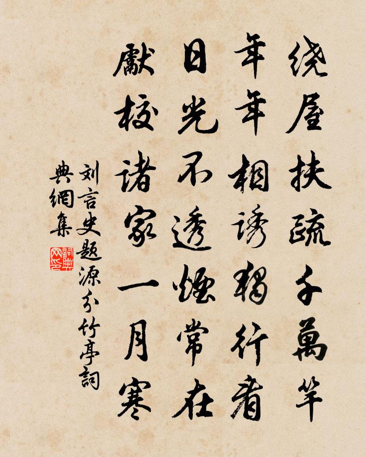 詩詞名句歷史字典書法欣賞書法字典國語詞典說文解字康熙字典古漢語字典標 題 作 者 詩 句 題源分竹亭作者:劉言史 朝代:唐代題源分竹亭原文繞屋扶疏千萬竿,年年相誘獨行看。日光不透煙常在,先校諸家一月寒。詩詞問答問:題源分竹亭的作者是誰?答:劉言史問:題源分竹亭寫於哪個朝代?答:唐代問:題源分竹亭是什麼體裁?答:七絕劉言史題源分竹亭書法欣賞題源分竹亭書法作品注釋全唐詩:卷468-39詩詞推薦即事陸游〔宋代〕小閣憑欄望遠空,天河橫貫鬥牛中。他年鼓角榆關路,馬上遙看與此同。雨中花(睢陽途中小雨見桃李盛開作以下奉使途中作)葛立方〔宋代〕壯歲嬉遊,樂事幾經,青門紫陌芳春。未見廉纖,膏雨浥花塵。濯錦寶絲增艷,洗妝玉頰尤新。向韶光濃處,點染病中雜興五言十首劉克莊〔宋代〕跌盪四千首,流行宇宙間。國風幾曾熄,聖筆不能刪。孅阿一絕蘇籀〔宋代〕不瑕彭澤願言中,都治姿年慧則通。揭調郡齋賓孺子,孅阿茜粲駐芳蹤。金城宮薛逢〔唐代〕憶昔明皇初御天,玉輿頻此駐神仙。龍盤藻井噴紅艷,獸坐金床吐碧煙。雲外笙歌岐薛醉,月中台榭后妃眠。自從端州別高六戩張說〔唐代〕異壤同羈竄,途中喜共過。愁多時舉酒,勞罷或長歌。南海風潮壯,西江瘴癘多。於焉復分手,此別傷如何。喜雨口號九首呈潘侯劉克莊〔宋代〕雖擁朱幡只澤臞,孕魚丹荔免苞苴。未應旱魃無分別,更把秋陽懊惱渠。送錢使者三首李新〔宋代〕翠羽頒書出紫皇,殘春岐路日初長。花容帖雨蜂兒靜,麥浪翻風燕子涼。八葉世家方越古,二王振鷺已成行。行行藤樽蘇洵〔宋代〕苦藤生幽谷,蹙縮似無材。不意猶為累,刳中作酒杯。君知我好異,贈我酌村醅,衰意方多感,為君當數開。藤樽次張節推山字韻詩留其行陳造〔宋代〕紅塵嘆我賓士久,空谷逢君夢寐間。政使公榮可無飲,風江驚浪涌銀山。白雪歌送武判官歸京岑參〔唐代〕北風捲地白草折,胡天八月即飛雪。忽如一夜春風來,千樹萬樹梨花開。散入珠簾濕羅幕,狐裘不暖錦衾薄。將軍次秋出月上人韻周暕〔宋代〕十指曾彈月下琴,已知太古有遺音。三乘四諦無非道,萬法千門只此心。得句何妨聞鼓□,□機不復有魔侵。近來十六夜玩月杜甫〔唐代〕舊挹金波爽,皆傳玉露秋。關山隨地闊,河漢近人流。谷口樵歸唱,孤城笛起愁。巴童渾不寢,半夜有行舟。夏夜對月陸游〔宋代〕薄雲歸欲盡,殘雨久猶滴。月入疏林間,庭戶粲珠璧。梅天苦蒸郁,爽氣始此夕。豈無一舴艋,放浪江天碧。散發送道士於千齡游南嶽崔塗〔唐代〕物外與誰期,人間又別離。四方多事日,高岳獨游時。猿狖瀟湘樹,煙波屈宋祠。無因陪此去,空惜鬢將衰。哭柏岩禪師李益〔唐代〕遍與傍人別,臨終盡不愁。影堂誰為掃,坐塔自看修。白日鍾邊晚,青苔缽上秋。天涯禪弟子,空到柏岩游。天目山李師中〔宋代〕壞壁摩娑少舊題,高情應怪賞音稀。煙霞正自無今古,雲水從教遠是非。丹井金龍藏洞府,杞叢花犬盪霞扉。登臨禪人並化主寫真求贊釋正覺〔宋代〕發皚皚而雪山,目湛湛而秋潭。杖拂老伴,叢林飽參。萬全非一有,二破卻成三。門門虛而正受,物物各自禪談。憶梅李龍高〔宋代〕飄蓬萬里隔風沙,夢到江南未到家。料得夜深霜月苦,幾人揮淚說梅花。釣台方信孺〔宋代〕釣得神魚金作鱗,廢台百尺漫嶙峋。絲綸不入非熊夢,當日何人老渭濱。名句推薦艷歌餘響,繞雲縈水蘇軾《水龍吟·黃州夢過棲霞樓》 德不孤,必有鄰。孔子弟子《論語·里仁篇》 兒女紛紛夸結束,新樣釵符艾虎。劉克莊《賀新郎·端午》 春來遍是桃花水,不辨仙源何處尋。王維《桃源行》 弱冠弄柔翰,卓犖觀群書。左思《詠史八首·其一》 昨別今已春,鬢絲生幾縷。韋應物《長安遇馮著》 大丈夫相時而動。曹雪芹《紅樓夢·第四回》 長風蕭蕭渡水來,歸雁連連映天沒。盧思道《從軍行》 靜夜沉沉,浮光靄靄,冷浸溶溶月。丘處機《無俗念·靈虛宮梨花詞》 西窗下,風搖翠竹,疑是故人來。秦觀《滿庭芳·碧水驚秋》