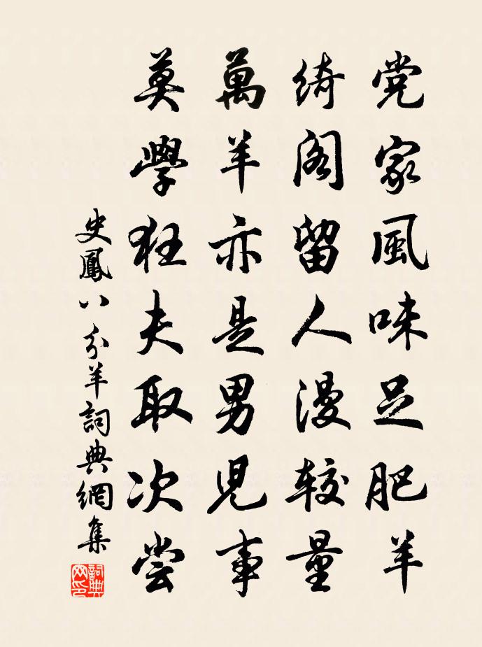 詩詞名句歷史字典書法欣賞書法字典國語詞典說文解字康熙字典古漢語字典標 題 作 者 詩 句 八分羊作者:史鳳 朝代:唐代八分羊原文党家風味足肥羊,綺閣留人漫較量。萬羊亦是男兒事,莫學狂夫取次嘗。詩詞問答問:八分羊的作者是誰?答:史鳳問:八分羊寫於哪個朝代?答:唐代問:八分羊是什麼體裁?答:七絕史鳳八分羊書法欣賞八分羊書法作品注釋全唐詩:卷802-31詩詞推薦和本齋止酒牟巘五〔宋代〕酒名具一妙形容,方法傳來玉局翁。搖動天關出瓊液,澄然不比小槽紅。雜興張鎡〔宋代〕小圃秋光不世情,蠹枝枯卉忽重青。凌晨灌銀床水,居士新看種樹經。愚溪陳與義〔宋代〕小閣當喬木,清溪抱竹林。寒聲日暮起,客思雨中深。行李妨幽事,欄乾試獨臨。終然遊子意,非復昔人心。詩王粲〔魏晉〕吉日簡清時。從君出西園。方軐策良馬。並馳厲中原。北臨清漳水。西看柏楊山。迴翔游廣囿。逍遙波渚間。廳事落成致語口號陳造〔宋代〕向晚簾櫳上玉鉤,縣人應指小瀛洲。龍蘭煙外調宮羽,羅綺香中擁獻酬。百祀規模新莊觀,一時文武極風流。月明和酒禁趙希逢〔宋代〕井田未壞軍民一,去古堪嗟此意衰。守望扶持無復有,一杯也自立藩籬。聖節有感黃彥平〔宋代〕漫說南風入舜弦,傷時撫事益悽然。愔愔新綠愁鴝鵒,悄悄殘紅拜杜鵑。心折更聞胡部曲,眼明那復御爐煙。蒜山梧桐樹牧常晁〔元代〕早修竹,聽勸諭。綠鬢朱顏易變故。光景流如注。妻兒金寶暫相遇。到了何曾將得去。不用縈懷慮。送穆上人歸鳳山兼簡仲深釋行海〔宋代〕客亭楊柳思悠悠,隔岸青山是越州。風急片帆飛鳥外,一江煙雨結春愁。贈碧眼相士文天祥〔宋代〕蒼蒼垂天雲,靈照行下土。秋江浸草木,魚暇歷可數。眉山老 * ,偷入此阿堵。 * 只點頭,從人道吾瞽。招張仲宗陳與義〔宋代〕北風日日吹茅屋,幽子朝朝只地爐。客里賴詩增意氣,老來唯懶是工夫。空庭喬木無時事,殘雪疏籬當畫圖。亦有谷城山下作陳藻〔宋代〕遠來便見兩山睽,一大隆高一小低。及到近看如合璧,壺公祗與谷城齊。贈道者劉威〔唐代〕道帔輕裾三島雲,綠髯長占鏡中春。高風已駕祥鸞馭,浮世休驚野馬塵。過海獨辭王母面,度關誰識老聃身。儒生搗練子 贈文登馬彥高馬鈺〔元代〕長壽酒,安樂杯。能醫百病正當時。助清吟,樂道歸。將進酒,鳳銜杯。香山會上惜芳時。醉仙吟,月下歸。雨過閒步楊公遠〔宋代〕霏微雨過不成泥,小步何妨曳杖藜。半露好山雲斷續,輕籠淡日樹高低。池塘有夢春生草,桃李無言下自蹊。政此青玉案(春暮)趙長卿〔宋代〕天涯目斷江南路。見芳草、迷風絮。綠暗花梢春幾許。小桃寂寞,海棠零亂,飛盡胭脂雨。子規聲里山城暮。月掛詩一首李淑〔宋代〕多羅四十年,偶未識摩氈。近有王宣政,時時與紙錢。偈頌一百零一首釋慧性〔宋代〕十五日已前,風吹不入。十五日已後,水灑不著。正當十五日,月中仙桂和根拔,海底泥牛把角牽。過臨平張良臣〔宋代〕兒時曾憶此登臨,細說窮途有述征。四十九年蘧伯玉,月明人靜過臨平。和范倅十首曹勛〔宋代〕海邊草芥一冬新,況復冬溫接畛春。從此近城花漸好,不妨閒作惜花人。名句推薦風嗥雨嘯,昏見晨趨。鮑照《蕪城賦》 樓船夜雪瓜洲渡,鐵馬秋風大散關。陸游《書憤五首·其一》 細草微風岸,危檣獨夜舟。杜甫《旅夜書懷》 貧賤非辱,貧賤而諂求於人者為辱王永彬《圍爐夜話·第三一則》 先到為君,後到為臣。佚名《增廣賢文·上集》 謂學不暇者,雖暇亦不能學矣。劉安及其門客《淮南子·說山訓》 大江流日夜,客心悲未央。謝朓《暫使下都夜發新林至京邑贈西府同僚》 自春來、慘綠愁紅,芳心是事可可。柳永《定風波·自春來》 一簾鳩外雨,幾處閒田,隔水動春鋤。張炎《渡江雲·山陰久客一再逢春回憶西杭渺然愁思》 百二禁兵辭象闕,三千宮女下龍舟。許渾《汴河亭》