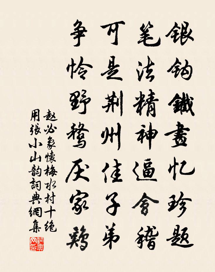 詩詞名句歷史字典書法欣賞書法字典國語詞典說文解字康熙字典古漢語字典標 題 作 者 詩 句 懷梅水村十絕用張小山韻作者:趙必象 朝代:宋代懷梅水村十絕用張小山韻原文銀鉤鐵畫憶珍題,筆法精神逼會稽。可是荊州佳子弟,爭憐野鶩厭家雞。詩詞問答問:懷梅水村十絕用張小山韻的作者是誰?答:趙必象問:懷梅水村十絕用張小山韻寫於哪個朝代?答:宋代趙必象懷梅水村十絕用張小山韻書法欣賞懷梅水村十絕用張小山韻書法作品詩詞推薦皇帝合春帖子趙湘〔唐代〕早鶯啼滑知寒薄,午馬休遲覺晝長。四海歡康幾務暇,簫韶時奉萬年觴。寄龍井辯才法師三絕蘇轍〔宋代〕山色青冥葉未紅,湖光凝碧曉無風。行窮上下兩天竺,望斷南山龍井龍。綠萼梅姜夔〔宋代〕黃雲隨襪知何處,招得冰魂付北枝。金谷樓高愁欲墜,斷腸誰把玉龍吹。岳陽樓雜詠十二絕胡寅〔宋代〕有時風浪戰城西,何啻漁陽萬鼓鼙。狎水蚩蚩忘墊溺,誰人能續偃虹堤。初到陳州二首蘇轍〔宋代〕久愛閒居樂,茲行恐遂不。上官容碌碌,飽食更悠悠。枕畔書成癖,湖邊柳散愁。疏慵愧韓子,文字化潮州。秋思陸游〔宋代〕秋來情味更堪論,身寄城南五畝園。委轡看山無鐵獺,拾樵煎茗有青猿。陂塘夜雨添新漲,原野煙蕪減舊痕。豈是至滑州隔河望黎陽憶丁三寓王維〔唐代〕隔河見桑柘。藹藹黎陽川。望望行漸遠。孤峰沒雲煙。故人不可見。河失復悠然。賴有政聲遠。時聞行路傳。沁園春(過天下第一江山呈何守)趙孟堅〔宋代〕許大江山,鎮臨彈壓,豈小任哉。從潘冢導漾,東傾注海,截然限止,南北天開。試向中流,回觀鐵瓮,萬石層棱晚飯寶應張耒〔宋代〕晚風吹古柏,落照明空山。深行得寶剎,崖嶺相迴環。人遠草木邃,境幽魚鳥閒。道人掃華堂,延我具晚餐。齋庖青門引 題古陽關 靜齊至正直記卷一佚名〔宋代〕憑雁書遲,化蝶夢速,家遙夜永,翻然已到。稚子歡呼,細君迎迓,拭去故袍塵帽。問我假使萬里封侯,何如歸早苦雨遣興劉宰〔宋代〕老去身何有,時危念苦深。朝陽方借暖,宿靄又所陰。梁楚安巢少,關河去鳥沉。誰歌出塞曲,慷慨百年心有旨放八月朔參孔武仲〔宋代〕八月大明宮,朝班放會同。天時郁殘暑,聖語似清風。蕙帳便秋睡,沙堤緩曉驄。葵心終不已,長望日升東。戲遣老懹陸游〔宋代〕清羸正怯倚闌乾,紗帽還驚半指寬。日漏雲端才欲暖,風催梅信又成寒。尋僧竹院逢茶熟,引鶴溪橋及雪殘。只道歷代詩三皇五帝楊簡〔宋代〕混沌鑿開吞幾歲,洪荒莫考傳承裔。但聞前史載三皇,伏義神農及黃帝。三皇之後五帝傳,少昊顓頊高辛繼。唐堯奉陪張燕公登南樓尹懋〔唐代〕君子每垂眷,江山共流眄。水遠林外明,岩近霧中見。終日西北望,何處是京縣。屢登高春台,徒使淚如霰。醉眠亭四首晁端佐〔宋代〕瀟灑松陵江上亭,醉來一夢傲雲屏。生前笑語君須惜,世事紛紛不用醒。過眉山謁鄉耆宿李八丈提刑程公許〔宋代〕憶昔下吳會,拜公古渝州。別來忽星紀,不知幾三為。豈不願舂糧,占烏渠渠屋。良期苦難儷,千里勞遠目。公家靈隱寺宋之問〔唐代〕鷲嶺郁岧嶢,龍宮鎖寂寥。樓觀滄海日,門對浙江潮。桂子月中落,天香雲外飄。捫蘿登塔遠,刳木取泉遙。霜薄贈尅擇徐吉甫文天祥〔宋代〕東望會稽山,穆陵郁岧嶢。卜壤藏劍履,伯也昭其勞。昔者遊仙人,龍耳致君王。君家世其傳,芳踵疇可量。青囊望思台鄭還古〔唐代〕讒語能令骨肉離, * 難測事堪悲。何因掘得江充骨,搗作微塵祭望思。名句推薦故人離別盡,淇上轉驂騑。王維《送魏郡李太守赴任》 布帛尋常,庸人不釋。韓非及後人《韓非子·五蠹》 成事莫說,覆水難收。佚名《增廣賢文·上集》 虜騎聞之應膽懾,料知短兵不敢接,車師西門佇獻捷。岑參《走馬川行奉送出師西征 / 走馬川行奉送封大夫出師西征》 千年史冊恥無名,一片丹心報天子。陸游《金錯刀行》 以五十步笑百步。孟子《孟子·梁惠王章句上·第三節》 世情薄,人情惡,雨送黃昏花易落。唐婉《釵頭鳳·世情薄》 俱懷逸興壯思飛,欲上青天攬明月。李白《宣州謝朓樓餞別校書叔雲》 家山何在,雪後園林,水邊樓閣。辛棄疾《瑞鶴仙·賦梅》 搖落深知宋玉悲,風流儒雅亦吾師。杜甫《詠懷古蹟五首·其二》