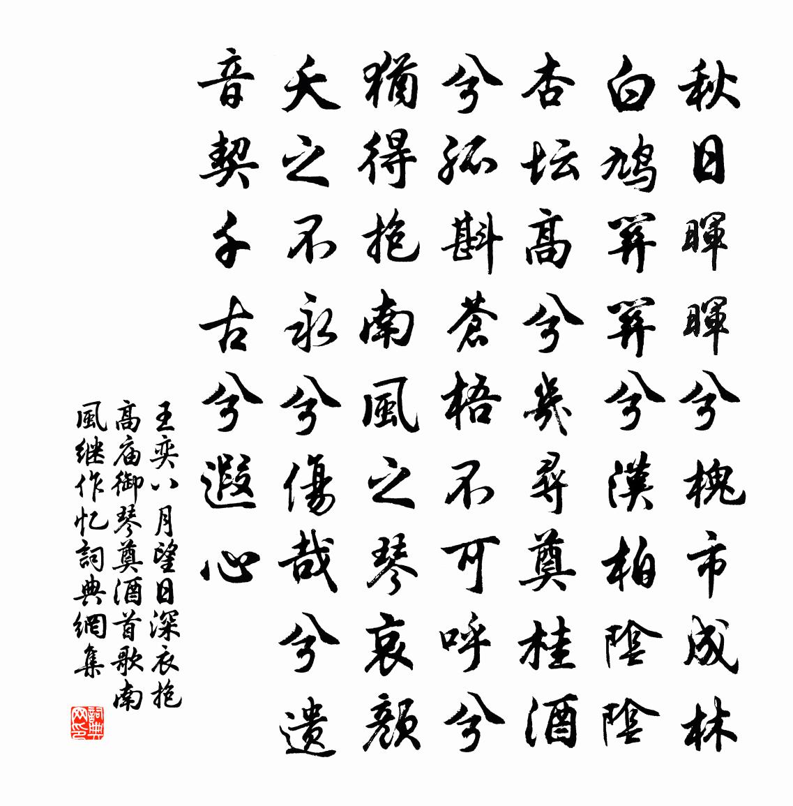 詩詞名句歷史字典書法欣賞書法字典國語詞典說文解字康熙字典古漢語字典標 題 作 者 詩 句 八月望日深衣抱高廟御琴奠酒首歌南風繼作憶作者:王奕 朝代:宋代原文秋日暉暉兮槐市成林,白鳩關關兮漢柏陰陰。杏壇高兮幾尋,奠桂酒兮孤斟。蒼梧不可呼兮猶得抱南風之琴。哀顏夭之不永兮,傷哉兮遺音,契千古兮遐心。詩詞問答問:《八月望日深衣抱高廟御琴奠酒首歌南風繼作憶》的作者是誰?答:王奕問:該詩寫於哪個朝代?答:宋代書法欣賞八月望日深衣抱高廟御琴奠酒首歌南風繼作憶書法作品詩文賞析【原題】:八月望日深衣抱高廟御琴奠酒首歌南風繼作憶顏三氏諸孫環立以聽為杏壇一時之盛千古之下令人憮然作歌雲詩詞推薦送張司直入單于(一作送客游邊)於鵠〔唐代〕若過并州北,誰人不憶家。寒深無伴侶,路盡有平沙。磧冷唯逢雁,天春不見花。莫隨征將意,垂老事輕車。鷓鴣天佚名〔宋代〕臘月初開一莢蓂。祥開崧岳慶生申。歲晚陸游〔宋代〕歲晚城隅車馬稀,偷閒聊得掩荊扉。征蓬滿野風霜苦,多稼連雲雁騖肥。報國有心空自信,結茅無地竟安歸?浣花系樂府十二首古遺嘆元結〔唐代〕古昔有遺嘆,所嘆何所為。有國遺賢臣,萬事為冤悲。所遺非遺望,所遺非可遺。所遺非遺用,所遺在遺之。嗟嗟贈文雅度大士宋祁〔宋代〕高臘頷髭霜,棲閒寄寶坊。秘園金側布。薰夾字旁行。賜服恩華重,分燈祖意長。祗陀學久遍,餘力在雕章。酬朱元順參議王之道〔宋代〕舟來自金沙,敢避江路繞。計程逾五月,書勞比三考。湖陰見君處,取別殊草草。因思會面難,相從意彌好。新詩虞美人(春愁)陳亮〔宋代〕東風蕩漾輕雲縷,時送蕭蕭雨。水邊畫榭燕新歸,一口香泥濕帶、落花飛。海棠糝徑鋪香繡,依舊成春瘦。黃昏庭寄晁應之二首張耒〔宋代〕強讀詩書嘆白頭,一官飄泊寄東周。匏瓜有系身難去,人足無音境更幽。晚接賢豪寬病思,老將文字寫離憂。相思紫溪莊舍讀癸丑壁間舊題轉眼忽十八年同游十劉學箕〔宋代〕吁嗟人生,年不滿百。天地囿形,百代過客。去日苦多,來日苦窄。我曷不樂,慨念疇昔。自巴陵略平江臨湘入通城無日不雨至黃龍奉謁黃庭堅〔宋代〕山行十日雨沾衣,幕阜峰前對落暉。野水自添田水滿,晴鳩卻喚雨鳩歸。靈源大士人天眼,雙塔老師諸佛機。白髮歲暮度朋山嶺登山庵追慕先人不勝悲愴因用楊蒲壽宬〔宋代〕歲寒霜露感,況復度高深。雲木猶如此,苔磯不忍臨。溪流一線碧,門對兩山岑。含涕危亭曲,遺言尚可尋。次韻謝尉公靖同游北園五首韓維〔宋代〕陰陰喬木交,竦竦修竹翠。黃花與丹實,夾路何瑣細。是辰雨新足,支策問田事。一感孤征鴻,淚落衣襟際。啟帳黃滔〔唐代〕得人憎定繡芙蓉,愛鎖嫦娥出月蹤。侍女莫嫌抬素手,撥開珠翠待相逢。偈頌一百零二首釋慧遠〔宋代〕彎彎初生如櫜弓,團團次第漾懸鏡。人間起舞爭清輝,影落秋江驗邪正。圓也缺也烏足論,體也用也誰能分。潦倒憩全節鋪愛其稱為駐馬久之宗澤〔宋代〕回車勝母避柏人,不飲貪泉惡其名。道逢一鋪榜全節,擊馬呼獎臣子情。金剛隨機無盡頌莊嚴淨土分第十釋印肅〔宋代〕莊嚴諸佛土,我道無門戶。清淨表莊嚴,未達人多悞。許州西湖蘇軾〔宋代〕西湖小雨晴,灩灩春渠長。來從古城角,夜半傳新響。使君欲春遊,浚沼役千掌。紛紜具畚鍤,鬧若蟻運壤。夭桃鴛鴦湖棹歌 之四十六朱彝尊〔清代〕龍香小柄琵琶彎,切玉玲瓏約指環。試按花深深一曲,海棠開後望郎還。江城子(外舅作梅玻因壽日作此)盧祖皋〔宋代〕小山初築自天成。架危亭。與雲平。面面梅花,闌檻十分清。喚得長淮春意滿,香暗度,月微明。數枝長憶傍岩扃和子華湖上書事韓維〔宋代〕清霜雕遠木,潩水溢西陂。畫鷁凌空界,鳴鷗矯翠漪。菊殘猶可折,竹密不容窺。物我同真際,誰當憚四知。名句推薦疏籬下、試覓重陽,醉擘青露菊。吳文英《一寸金·秋感》 桑野就耕父,荷鋤隨牧童。孟浩然《田家元日》 地中有山,謙;君子以裒多益寡,稱物平施。佚名《易傳·象傳上·謙》 紫燕一雙嬌語碎,翠屏十二晚峰齊,夢魂消散醉空閨。毛熙震《浣溪沙·花榭香紅煙景迷》 君行四月草萋萋,柳花桃花半委泥。納蘭性德《送蓀友》 鴛鴦俱是白頭時,江南渭北三千里。賀鑄《惜余春·急雨收春》 江心雲帶蒲帆重,樓上風吹粉淚香。嚴仁《鷓鴣天·惜別》 樸實渾厚,初無甚奇,然培子孫之元氣者,必此人也。王永彬《圍爐夜話·第十九則》 桃花三十六陂,鮫宮睡起,嬌雷乍轉。吳文英《瑞龍吟·德清清明競渡》 今夕不登樓,一年空過秋。高觀國《菩薩蠻·何須急管吹雲暝》