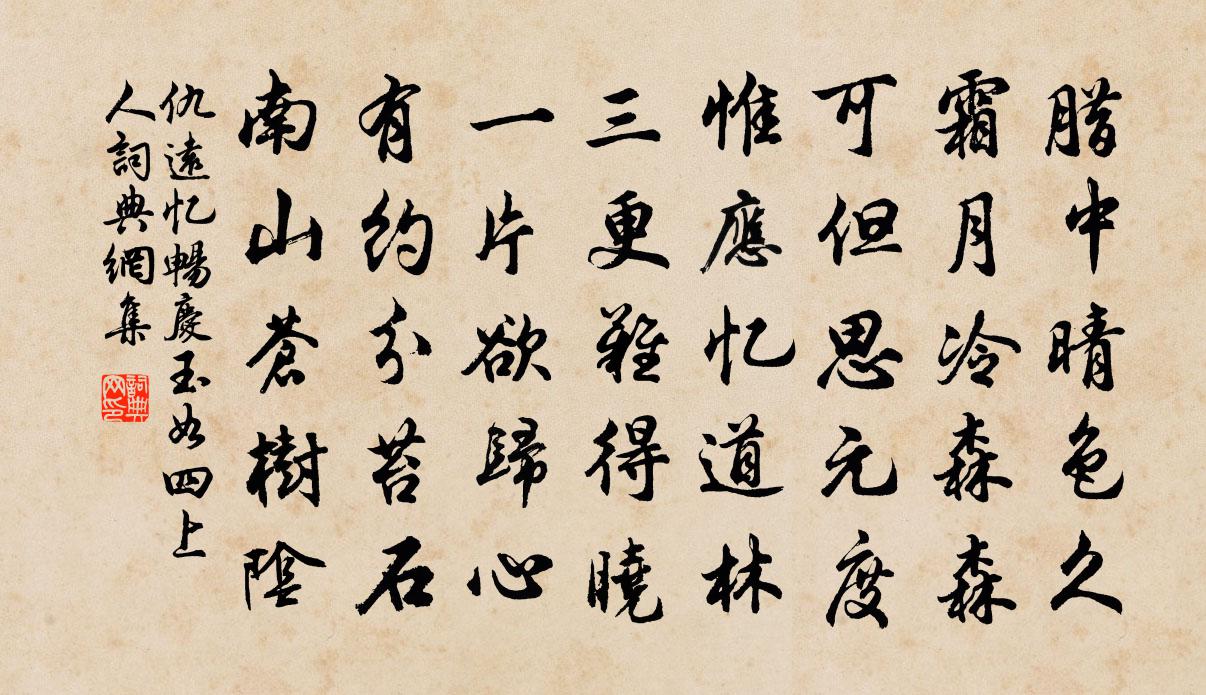 詩詞名句歷史字典書法欣賞書法字典國語詞典說文解字康熙字典古漢語字典標 題 作 者 詩 句 憶暢慶玉如四上人作者:仇遠 朝代:宋代憶暢慶玉如四上人原文臘中晴色久,霜月冷森森。可但思元度,惟應憶道林。三更難得曉,一片欲歸心。有約分苔石,南山蒼樹陰。詩詞問答問:憶暢慶玉如四上人的作者是誰?答:仇遠問:憶暢慶玉如四上人寫於哪個朝代?答:宋代仇遠憶暢慶玉如四上人書法欣賞憶暢慶玉如四上人書法作品詩詞推薦用賒韻簡賈新之趙蕃〔宋代〕洛陽人物舊傳夸,殊縣相依得賈鼓。魯殿獨余多劫火,玄都看盡幾番花。寓懷不但篇章好,評古猶多論議嘩。問我浪淘沙侯置〔宋代〕曉日掠輕雲。霜瓦鱗鱗。六朝山色儼如新。家在洞庭南畔住,身在江濱。華發照烏巾。無意尋春。空將兩袖拂飛塵偈頌一百二十三首釋祖欽〔宋代〕丁一卓二,見三下三。和盤掇轉,地覆天翻。墨梅三絕張子文〔宋代〕筆端喚醒玉梅魂,滿袖春風不見痕。未許捲簾新月上,卻教煙雨惱黃昏。句游酢〔宋代〕青山控野雙門壯,白浪排空萬馬來。宮詞一百首岳珂〔宋代〕升龍門內屋千楹,玉宇金題映紫庭。卷帙異書三十萬,至今光彩動奎星。夏夜坐游李左藏園常父子駿明叔毅父元忠時新孔武仲〔宋代〕王城雖多賢,相過每希闊。今夕復何夕,共此青天月。鄰園初鏟築,咫尺夷且潔。胡床占勢便,漫不就行列。素華長台途中唐仲友〔宋代〕沖曉入山去,行行遵遠途。灘頭橫略彴,林表出浮圖。麥飯田家餉,松醪野店酤。紅塵自擾擾,心與白雲孤。幽居書事陸游〔宋代〕安命知天更不疑,幽居最愛早寒時。手中書墮初酣枕,窗下燈殘正劇棋。鮮鯽每從溪女買,香菰時就釣船炊。山陰陪曾吉甫游中山韓元吉〔宋代〕去天尺五城南寺,目極層軒得此游。山闊雨收雲點綴,江清日淡柳風流。僧扉繚繞牛鳴地,樓閣參差斗大州。公自別趙運使二首彭龜年〔宋代〕君子豈無欲,有欲未足憂。百計護此短,此心尚可求。向來畏人言,言者不肯休。不畏固未可,無言我誰尤。事當果山春郊即事七首吳泳〔宋代〕檐花夜落曉還晴,應為農祥一展顰。慚愧青裙南畝婦,犁頭能得幾多春。郊廟歌辭。祭汾陰樂章。壽和蘇頲〔唐代〕禮物斯具,樂章乃陳。誰其作主,皇考聖真。對越在天,聖明佐神。窅然汾上,厚澤如春。送澶淵李太傅宋祁〔宋代〕左契銅魚照綬囊,上頭車騎冠東方。三交薦技中軍戲,一割牛心右客嘗。烽靜塞垣宵燐滅,橋橫河曲暮虹長。歸來記乙丑十月一日夜夢陸游〔宋代〕旋糴街頭米數升,黃昏看上店身燈。明朝山路聞饒石,買得烏騾喜不勝。幽居葛天民〔宋代〕遠懷日與靜相宜,山色窺簾澗撼扉。野草自花聊獻笑,重雲不雨謾垂衣。人間事業難爭長,睡里工夫獨造微。卻怪荷亭倚欄楊萬里〔宋代〕魚跳龜戲不曾閒,萍盡荷生尚未繁。水面圓紋亂相入,玻璃盆旋玉連環。將使有詩許移廚雙溪次其韻王炎〔宋代〕艤舟柳岸載清尊,招我花邊一賞春。莫笑看花人已老,白頭曾是少年人。壽李悅齋五首和三勞使尹使君韻程公許〔宋代〕國鎮重雙璧,寵光均一時。姱修甘俗改忤,忠憤倚天知。聞徵環急,難忘側席思。分明調鼎味,梅熟雨垂垂。臘前二日見青梅桃花喻良能〔宋代〕潭國寒多春事遲,南來地暖意都迷。城陰雨過臘初近,梅子青青桃滿蹊。名句推薦未知鹿死誰手房玄齡《晉書·載記·第五章》 羊腸白道穿雲出,雁齒紅橋亞水低。許德溥《西橋柳色》 歲月匆匆留不住,鬢已星星堪鑷。吳淵《念奴嬌·我來牛渚》 天上人間何處去,舊歡新夢覺來時,黃昏微雨畫簾垂。張曙《浣溪沙·枕障薰爐隔繡帷》 鎮日思歸歸未得,孤負殷勤杜宇。王瀾《念奴嬌·避地溢江書於新亭》 眼覷著災傷教我沒是處,只落得雪滿頭顱。張養浩《一枝花·詠喜雨》 楊花落盡子規啼,聞道龍標過五溪。李白《聞王昌齡左遷龍標遙有此寄》 即從巴峽穿巫峽,便下襄陽向洛陽。杜甫《聞官軍收河南河北》 楊枝飄泊,桃根嬌小,獨自個思量。項鴻祚《太常引·客中聞歌》 知君獨坐青軒下,此時結念同所懷。李白《早秋單父南樓酬竇公衡》