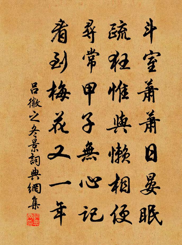 詩詞名句歷史字典書法欣賞書法字典國語詞典說文解字康熙字典古漢語字典標 題 作 者 詩 句 冬景作者:呂徽之 朝代:宋代冬景原文斗室蕭蕭日晏眠,疏狂惟與懶相便。尋常甲子無心記,看到梅花又一年。詩詞問答問:冬景的作者是誰?答:呂徽之問:冬景寫於哪個朝代?答:宋代呂徽之冬景書法欣賞冬景書法作品詩詞推薦題黎榷院詩軸李曾伯〔宋代〕別二十三年,來呼激峽船。昨遊春夢爾,故友曉星然。廉譽盈詩卷,忠謀在奏編。阿蒙頑自若,應笑老窮邊。爛柯石孟郊〔唐代〕仙界一日內,人間千載窮。雙棋未遍局,萬物皆為空。樵客返歸路,斧柯爛從風。唯餘石橋在,猶自凌丹虹。水調歌頭 送俞時王結〔元代〕眾里識中散,野鶴自昂藏。螢窗雪屋十載,南國秀孤芳。河漢胸中九策,風雨筆頭千字,畫省姓名香。文采黑頭掾鑑湖徐僑〔宋代〕箇中岩壑欠相羊,秋色無邊古興長。寒盡鑑湖僅荷浦,靈遺禹廟尚梅梁。追尋游舫空千載,物色先賢但一堂。征□滿江紅呂勝己〔宋代〕慘慘枯梢,初疑似、真酥點滴。見深紅蒂萼,方認早梅訊息。粉艷牽連春意動,冰姿照映霜華白。伴蒼松、修竹似祈澤寺見許堅題詩王安石〔宋代〕藹藹春風入水村,森森喬木映朱門。高人遺蹟空佳句,誰識旌陽後世孫。生查子(木香)高觀國〔宋代〕春籠雲潤香,露濕青蛟瘦。偷學漢宮妝,舞徹霓裳後。 * 紫領巾,冰翦柔荑手。有意入羅囊,不肯成春酒。登騎石山黃汝嘉〔宋代〕江城樓閣辟嵯峨,如此隨風燕雀何。古木望中松柏少,好花開處杏桃多。徐殷舊宅僧為主,褚氏閒亭鶴占坡。花落頌古六首釋崇岳〔宋代〕大機圓應,大用直截。雪峰雲門,只得一橛。畢竟如何,不說不說。途中口號孫逖〔唐代〕鄴城東北望陵台,珠翠繁華去不回。無復新妝艷紅粉,空餘故壟滿青苔。擬古雜言黃庭堅〔宋代〕雁雁隨春風,過鄉縣。煙雨昏,行不亂。同安樂,共憂患。雲重重,不相見。日昳晡,下平湖。十十五五依黃蘆,雜曲歌辭。起夜半聶夷中〔唐代〕念遠心如燒,不覺中夜起。桃花帶露泛,立在月明里。和崔中丞中秋月張南史〔唐代〕秋夜月偏明,西樓獨有情。千家看露濕,萬里覺天清。映水金波動,銜山桂樹生。不知飛鵲意,何用此時驚。五音曲 徵引沈約〔南北朝〕執衡司事。宅離方。滔滔夏日。火德昌。八音備舉。樂無疆。贛學鄉飲禮成二首李昴英〔宋代〕無嘩觀者也深衣,古典如迂效頗奇。放出曦輪行事日,飛來捷幟序賓時。俎陽便覺春流暢,拜爵潛教俗轉移。此禮和士特南浦詩劉子翬〔宋代〕羽檄分兵控上流,時傳烽火過鄰州。樓船半渡旌旗曉,胡馬欲來江漢秋。淝水投鞭真流語,幄中借箸有奇謀。吾儒先天易吟三十首方回〔宋代〕心法先天易,盍於離位求。儻非明出地,長夜使人愁。贈月堂徐相士姚勉〔宋代〕衡門選龍首,摸索未容易。龍首許黃扉,卻亦非難事。濟物乃素心,好爵豈予志。時來亦不辭,焉用早諛媚。楮先生宋伯仁〔宋代〕先生邂逅龍亭日,多少雲仍滿世間。千古典謨文獨記,九流毫髮事相關。代庖阿堵名尤重,制甲防邊職未閒。只與遊學射觀次壁間詩韻陸游〔宋代〕走遍人間鬢尚青,爾來樂事滿余齡。傍潭秋爽鉏甘菊,豋岳春暄采茯苓。閒倚松蘿論劍術,靜臨窗幾勘丹經。嚴光名句推薦嘴甜心苦,兩面三刀,上頭一臉笑,腳下使絆子,明是一盆火,暗是一把刀。曹雪芹《紅樓夢·第六十五回》 野橋經雨斷,澗水向田分。劉長卿《碧澗別墅喜皇甫侍御相訪》 腸斷月明紅豆蔻,月似當時,人似當時否?納蘭性德《鬢雲松令·枕函香》 已恨碧山相阻隔,碧山還被暮雲遮。李覯《鄉思》 權,然後知輕重;度,然後知長短。物皆然,心為甚。孟子《孟子·梁惠王章句上·第八節》 故大人之務,將在於眾賢而已。墨子《墨子·08章 尚賢(上)》 三年遇寒食,盡在洛陽城。白居易《洛橋寒食日作十韻》 靡不有初,鮮克有終。佚名《盪》 落葉人何在,寒雲路幾層。李商隱《北青蘿》 扶桑已在渺茫中,家在扶桑東更東。韋莊《送日本國僧敬龍歸》