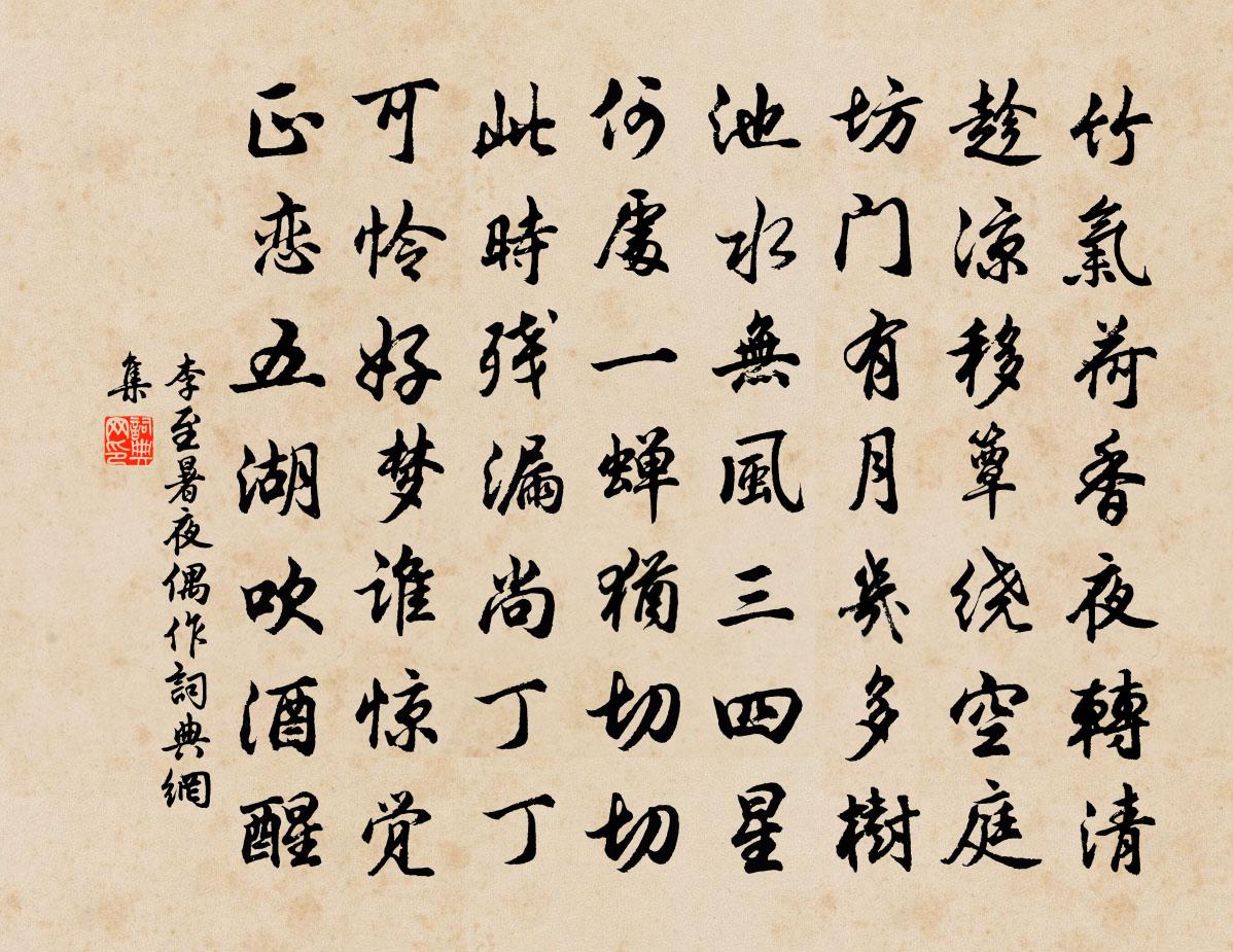 詩詞名句歷史字典書法欣賞書法字典國語詞典說文解字康熙字典古漢語字典標 題 作 者 詩 句 暑夜偶作作者:李至 朝代:宋代暑夜偶作原文竹氣荷香夜轉清,趁涼移簟繞空庭。坊門有月幾多樹,池水無風三四星。何處一蟬猶切切,此時殘漏尚丁丁。可憐好夢誰驚覺,正戀五湖吹酒醒。詩詞問答問:暑夜偶作的作者是誰?答:李至問:暑夜偶作寫於哪個朝代?答:宋代李至暑夜偶作書法欣賞暑夜偶作書法作品詩詞推薦題畫廿四首唐寅〔明代〕系水接天三萬頃,晚山連樹一千重。呼它小艇過湖去,臥看斜陽江上峰。野寺後池寄友張籍〔唐代〕佛寺連野水,池幽夏景清。繁木蔭芙蕖,時有水禽鳴。通溪岸暫斷,分渚流復縈。伴僧鐘磬罷,月來池上明。友人偶見夏英公與文莊公書雲秋序始涼師門尚遠又晁說之〔宋代〕前輩終身知學植,今人得意諱師門。如新幾帖英公字,可但吾家禮數尊。偈頌七十一首釋了惠〔宋代〕星在天上,眼在眉下。星無暗明,眼無書夜。密密綿綿無縫罅。黑山釋紹曇〔宋代〕佛祖仰望不及處,暗昏昏地悄巍巍。放開閃電光中路,拶著全身陷鐵圍。送吳夢大監稅赴潮州圃灣二首王邁〔宋代〕一命官無小,心思及物同。高風超俗見,只手救人窮。宦路梅花白,親庭萱草紅。賢明尤易事,最喜遇南豐。野步陸游〔宋代〕場圃農功畢,村鄰醉叟多。野風吹慘澹,海氣起嵯峨。婦女窺籬看,兒童拾穗歌。身閒不自樂,如此暮年何!題處士居鄭獬〔宋代〕高臥太湖石,自嫌名利腥。網羅當道路,鴻鵠出青冥。氣貯秋琴淡,心蟠古劍靈。我來閒劇論,山鬼不須聽。謝李平叔郎中問疾陸游〔宋代〕吏部朝回早,幽人病始蘇。過門迂問訊,欹枕聽傳呼。緣瘦重裁帽,因衰學染須。投詩發公笑,試想此形模。除夕徐集孫〔宋代〕一歲驚心忽已除,宦遊尚自客西湖。漫題桃板標茅屋,旋買梅花插瓦壺。俸薄倖無賒酒債,官閒卻有索詩逋。明朝壬戌孫覽右司同年以詩見寄用韻和酬張舜民〔宋代〕孫郎臥省正當年,曾奏嘉謀玉扆邊。事契且論龍虎榜,行藏休問孝廉船。從軍脫略矜橫槊,禦魅遷流喜執鞭。莫怪故司徒兼侍中贈太傅北平王輓詞權德輿〔唐代〕授律勛庸盛,居中鼎鼐和。佐時調四氣,盡力淨三河。忽訪天京兆,空傳漢伏波。今朝麟閣上,偏軫聖情多。過景陵李商隱〔唐代〕武皇精魄久仙升,帳殿淒涼煙霧凝。俱是蒼生留不得,鼎湖何異魏西陵。宿金山院程公許〔宋代〕犯暑驅車潑面塵,招提暝色喚休程。竹風滿院涼無價,最好移床就月明。竹枝歌孫嵩〔宋代〕峽山削出青嵯峨,峽水勻成綠不波。屯平山林未能得,奈此猿聲朝夕何。得貓於近村以雪兒名之戲為作詩陸游〔宋代〕似虎能緣木,如駒不伏轅。但知空鼠穴,無意為魚餐。薄荷時時醉,氍毹夜夜溫。前生舊童子,伴我老山村。建安語佚名〔唐代〕龍門一半在閩川。得都下八月書報蒙恩牧敘州陸游〔宋代〕鳳城書到錦江邊,故里歸期愈渺然。掌上山川初入夢,壺中日月尚經年。方輪落落難推谷,倦馬駸駸怕著鞭。未佩句晃逈〔宋代〕芃芃麥壠驚翬起,灼灼桃園舞蝶來。解嘲繆鑒〔宋代〕莫笑詩翁懶出門,詩公樂事在山村。鶯啼楊柳金歌舞,蝶宿梨花雪夢魂。罨書丹青分曙色,壓醅醽醁漲溪痕。燕簾名句推薦奴為出來難,教君恣意憐。李煜《菩薩蠻·花明月暗籠輕霧》 聖人自知不自見;自愛不自貴。老子《老子·德經·第七十二章》 一場愁夢酒醒時,斜陽卻照深深院。晏殊《踏莎行·小徑紅稀》 佇久河橋欲去,斜陽淚滿。吳文英《三姝媚·過都城舊居有感》 矜偽不長,蓋虛不久。韓非及後人《韓非子·難一》 西塞山前白鷺飛,桃花流水鱖魚肥。張志和《漁歌子·西塞山前白鷺飛》 三日柴門擁不開,階平庭滿白皚皚。柳宗元《酬王二十舍人雪中見寄》 愛之欲其生,惡之欲其死。釋原妙《偈頌六十七首》 無情燕子,怕春寒、輕失花期。晁沖之《漢宮春·梅》 飛鳥盡,良弓藏;狡兔死,走狗烹。司馬遷《史記·越王勾踐世家》