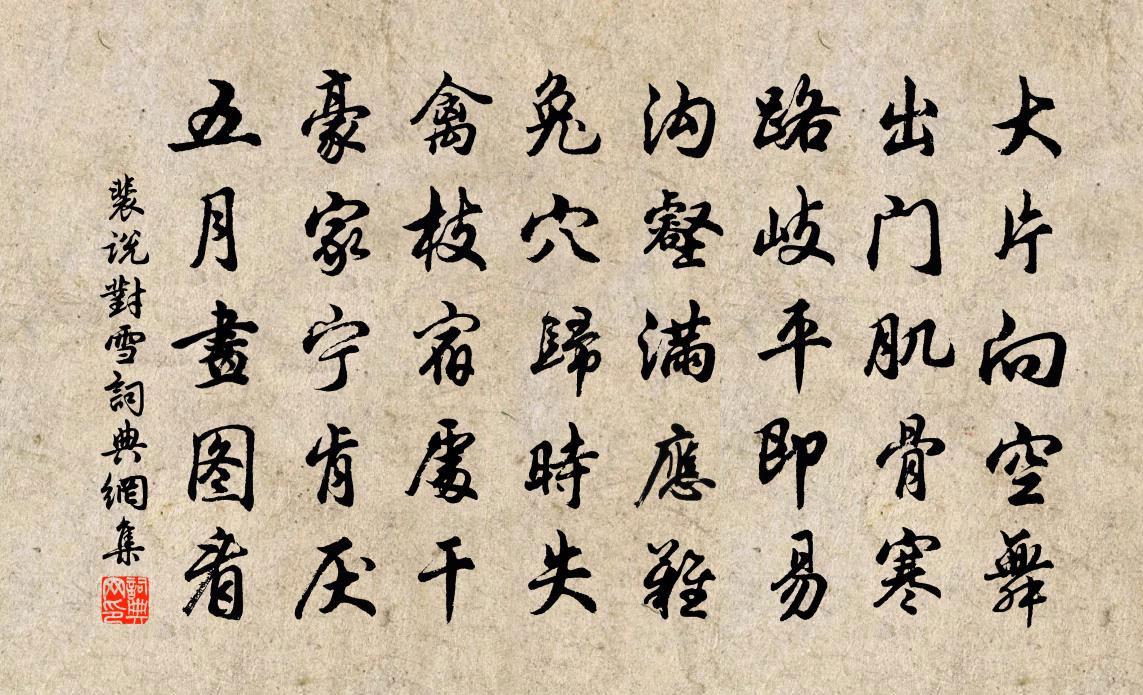 詩詞名句歷史字典書法欣賞書法字典國語詞典說文解字康熙字典古漢語字典標 題 作 者 詩 句 對雪作者:裴說 朝代:唐代對雪原文大片向空舞,出門肌骨寒。路岐平即易,溝壑滿應難。兔穴歸時失,禽枝宿處乾。豪家寧肯厭,五月畫圖看。詩詞問答問:對雪的作者是誰?答:裴說問:對雪寫於哪個朝代?答:唐代問:對雪是什麼體裁?答:五律裴說對雪書法欣賞對雪書法作品注釋全唐詩:卷720-18詩詞推薦送李大夫渡口阻風戴叔倫〔唐代〕浪息定何時,龍門到恐遲。輕舟不敢渡,空立望旌旗。射亭王安石〔宋代〕因射構茲亭,序賢仍閱兵。庶民觀禮教,群寇避威聲。城壘前相壯,溪山勢盡傾。宜哉百里地,浮鼓未嘗鳴。如夢令范成大〔宋代〕罨畫屏中客住。水色山光無數。斜日滿江聲,何處撐來小渡。休去。休去。驚散一舟鷗鷺。送山陰姚丞攜妓之任兼寄山陰蘇少府韓翃〔唐代〕東風香草路,南客心容與。白皙吳王孫,青蛾柳家女。都門數騎出,河口片帆舉。夜簟眠橘洲,春衫傍楓嶼。山陰浣溪沙(與客賞山茶,一朵忽墮地,戲作)辛棄疾〔宋代〕酒面低迷翠被重。黃昏院落月朦朧。墮髻啼妝孫壽醉,泥秦宮。試問花留春幾日,略無人管雨和風。瞥向綠珠樓下伍相廟周南〔宋代〕封域依神保,遺哀記屬鏤。荒庭垂白露,古屋換爰烏。配食虛神果,除壇欠闔閭。向來存二廟,猶得慰三吳。千頃山章槱〔宋代〕一池春水應江潮,中起沙鷗數尺高。誰謂風雲遠朝市,亂山深處亦波濤。五色雀金君卿〔宋代〕晨氛澄霽海風調,彩絢珍禽入絳霄。聞說舜庭方作樂,可容飛舞聽簫韶。金谷行楊奐〔元代〕洛陽園池天下無,金谷近在西城隅。晉時花草不復見,野人猶解談齊奴。齊奴豪奢誰比數,酒醒愛擊珊瑚株。後堂偈公六十五首釋鹹傑〔宋代〕滿目紛紛呈瑞雪,填溝塞壑誰辨別。文殊無處頓渾身,普賢失卻真妙訣。烏鴉變作白頭鴉,鐵樹翻成銀線結。報諸段元衡出示與晦翁九日登紫霄峰詩及手帖並及趙蕃〔宋代〕季承新寄嶠南詩,君亦南遊吊楚累。冰水玉山元自好,蠻煙蜑雨只生悲。庚子祈雨蔣山贈月老李曾伯〔宋代〕欲知計寺金谷吏,便是鐘山粥飯頭。爾欲朝朝動魚鼓,我期日日飽貔貅。幾為曉灶炊煙喜,又作秋田渴雨憂。自有藍溪次曾狀元韻林伯春〔宋代〕羊腸路入最高峰,倦倚東風點瘦筇。芳草有情春意遠,青山依舊暮雲重。新來梵閣添奇觀,前度時人帶老容。寄我下第別友人楊至之許渾〔唐代〕花落水潺潺,十年離舊山。夜愁添白髮,春淚減朱顏。孤劍北游塞,遠書東出關。逢君話心曲,一醉灞陵間。句徐似道〔宋代〕暖分煨芋火,明借績麻燈。與講師互謔佚名〔唐代〕甘桃不結實,苦李壓低枝。 ——釋元康輪後九首劉克莊〔宋代〕吾今垂老示疾,君昔與人作緣。尚能續華佗傳,何敢負宋清錢。憶舊遊 重到金陵張翥〔元代〕悵麟殘廢井,鳳去荒台。煙樹*斜。再到登臨處,渺秦淮自碧,目斷雲沙。後庭謾有遺曲,玉樹已無花。向宛寺裁古路楊萬里〔宋代〕我生倦行路,此行欣不辭。我豈與人異,厭閒樂驅馳。王事當有行,忘身那自知。閩盜入吾部,梅川作潢池。白羽教學退作二首陳著〔宋代〕昔年堂上來三鱣,今日溪頭領隊魚。方信卜居初意好,要教同里識詩書。名句推薦為有雲屏無限嬌,鳳城寒盡怕春宵。李商隱《為有》 裊裊城邊柳,青青陌上桑。張仲素《春閨思》 時不可再,機不可失魏徵《隋書·列傳·卷三》 夫因兵死守蓬茅,麻薴衣衫鬢髮焦。杜荀鶴《山中寡婦 / 時世行》 擢擢當軒竹,青青重歲寒。呂太一《詠院中叢竹》 歸來三徑重掃,松竹本吾家。葉夢得《水調歌頭·秋色漸將晚》 沙上並禽池上暝。雲破月來花弄影。張先《天仙子·水調數聲持酒聽》 紅蓼渡頭秋正雨,印沙鷗跡自成行,整鬟飄袖野風香。薛昭蘊《浣溪沙·紅蓼渡頭秋正雨》 最是倉皇辭廟日,教坊猶奏別離歌,垂淚對宮娥。李煜《破陣子·四十年來家國》 一生之內, 當無愧古人姚察、姚思廉《梁書·列傳·卷二十九》