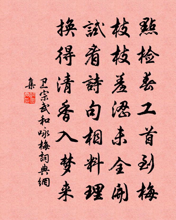 詩詞名句歷史字典書法欣賞書法字典國語詞典說文解字康熙字典古漢語字典標 題 作 者 詩 句 和詠梅作者:衛宗武 朝代:宋代和詠梅原文點檢春工首到梅,枝枝羞澀未全開。試看詩句相料理,換得清香入夢來。詩詞問答問:和詠梅的作者是誰?答:衛宗武問:和詠梅寫於哪個朝代?答:宋代衛宗武和詠梅書法欣賞和詠梅書法作品詩詞推薦夜與鄰幾持國歸梅堯臣〔宋代〕紅塵夜不息,橫衢若煙霧。朝見車馬來,暮見車馬去。車中目炯炯,馬上情遽遽。交相知是誰,飛先無覓處。踏莎行石孝友〔宋代〕釵鳳搖金,髻螺分翠。銖衣穩束宮腰細。綠柔紅小不禁風,海棠無力貪春睡。剪水精神,怯春情意。霓裳一曲當時老君廟溫庭筠〔唐代〕紫氣氤氳捧半岩,蓮峰仙掌共巉巉。廟前晚色連寒水,天外斜陽帶遠帆。百二關山扶玉座,五千文字閟瑤緘。自憐賀新郎辛棄疾〔宋代〕濮上印看垂釣。印更風流、印羊裘澤畔,精神孤矯。楚漢黃金公卿印,比著漁竿誰小。但過眼、才堪一笑。惠子焉送蔡希曾都尉還隴右,因寄高三十五書記杜甫〔唐代〕蔡子勇成癖,彎弓西射胡。健兒寧斗死,壯士恥為儒。官是先鋒得,材緣挑戰須。身輕一鳥過,槍急萬人呼。雲幕蕭山縣下遇雨二首周弼〔宋代〕悠悠心厭出江沙,過得丘亭轉落斜。村店自知行客倦,勸嘗新酒賣甜瓜。清明輦下懷金陵王安石〔宋代〕春陰天氣草如煙,時有飛花舞道邊。院落日長人寂寂,池塘風慢鳥翩翩。故園回首三千里,新火傷心六七年。青蓋別袁州司戶司馬行二首彭龜年〔宋代〕四海司馬氏,大州從事賢。剸裁無劇務,抑鬱已三年。人在甘棠里,夢回春草邊。知音有當路,何日踐英躔。與宗上人同飲陳藻〔宋代〕同年同月又同時,邂逅僧房把酒卮。五十年來未相識,鄰州兩舍賀生兒。判府曹宣徽生日朱長文〔唐代〕星杓指未月增弦,神選良時協半千。恭慎動遵長樂意,法清能紹冀王賢。緩垂相印淹公論,堅請州符避劇權。四十說無生話圖贊釋心月〔宋代〕收拾山雲海月情,團欒鼻直眼眉橫。龜毛拂子兔角杖,敲得虛空啵啵聲。賀同年林簿同卿龜從新婚王邁〔宋代〕知君雅志厭奢豪,富貴相尋可得逃。雲母屏間穿雀目,銷金帳下醉羊羔。養生早悟眉為斧,侍立須驚手有刀。老我頌古釋道顏〔宋代〕三腳驢子忒{左日右煞}好,長放後園教喫草。等閒牽出向人前,踢倒湖南瞎長老。賦南墅竹衛宗武〔宋代〕物得氣之清,鍾秀莫如竹。是謂東南美,群植可奴僕。虛心而獨立,勁節不回曲。傍屋著數插,能洗塵萬斛。截之採桑子何〔宋代〕百花叢里花君子,取信東君。取信東君。名策花中第一勛。結成寶鼎和羹味,多謝東君。多謝東君。香遍還應號令楊廷秀送牛尾貍侑以長句次韻周必大〔宋代〕江南十月方肅霜,小槽初滴鵝兒黃。頗思指動異味嘗,門正張羅誰末將。披綿強來推不去,枯蝦欲進止之戶。羊膻謝兄編言仁求詩方岳〔宋代〕孟子言仁惟一字,曾子言仁惟一唯。風霆霜露天何言,吾夫子言非得已。六經在天如北斗,尚多不經聖人手。杏花依韻和楊直講九日有感梅堯臣〔宋代〕也持 * 蕊,時望白衣人。苜蓿從來厭,茱萸卻乍親。護霜雲不散,吹帽客何貧。莫要悲搖落,秋花更勝春。初夏出遊陸游〔宋代〕泥黦棕鞋雨墊巾,閒遊又送一年春。長歌聊對聖賢酒,羸病極知朝暮人。廢堞荒郊閒弔古,朱櫻青杏正嘗新。桃源陋居五詠竹澗汪莘〔宋代〕散發篁竹中,濯足寒澗流。太陽正徘徊,心與爽氣游。活活走龍鱗,鏘鏘韻天球。於焉種荷花,遙剪西湖秋。亦思名句推薦正江令恨別,庾信愁賦劉辰翁《蘭陵王·丙子送春》 灞橋煙柳,曲江池館,應待人來。陸游《秋波媚·七月十六日晚登高興亭望長安南山》 東風力,快將雲雁高送。吳文英《宴清都·送馬林屋赴南宮分韻得動字》 法之善惡,莫以文也,乃其行焉;刑之本哉,非罰罪也,乃明罪焉。來俊臣《羅織經·問罪卷第十》 人不能不樂,樂則不能無形,形而不為道,則不能無亂。荀子《荀子·樂論》 來歲花前。又是今年憶去年。呂本中《減字木蘭花·去年今夜》 明日復明日,明日何其多。錢福《明日歌》 白日登山望烽火,黃昏飲馬傍交河。李頎《古從軍行》 黃河落天走東海,萬里寫入胸懷間。李白《贈裴十四》 教子弟求顯榮,不如教子弟立品行。王永彬《圍爐夜話·第四五則》
