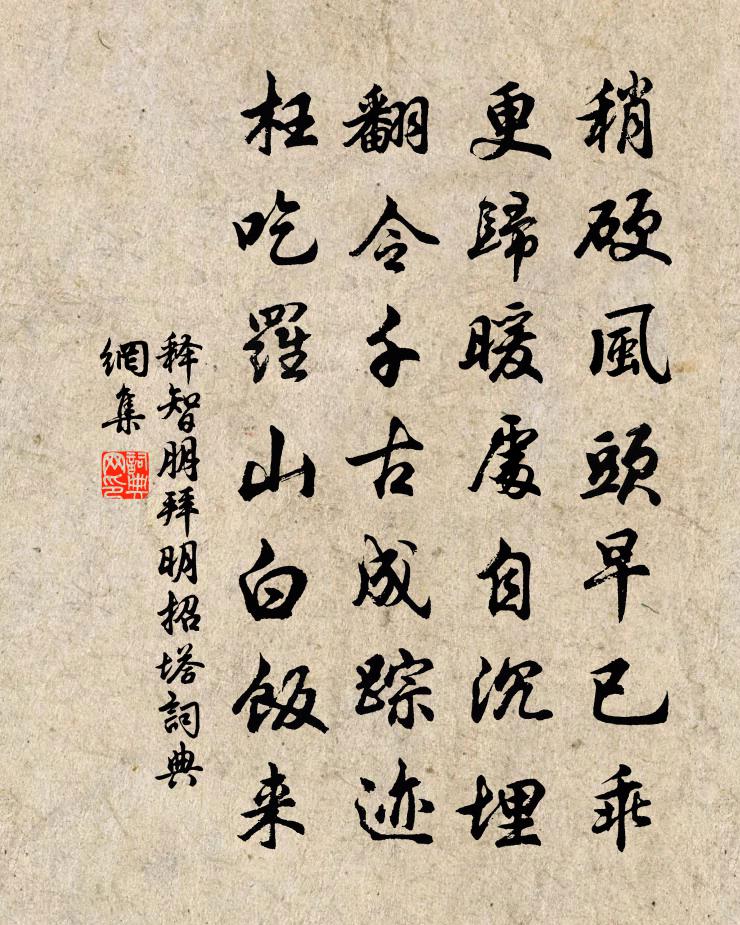 詩詞名句歷史字典書法欣賞書法字典國語詞典說文解字康熙字典古漢語字典標 題 作 者 詩 句 拜明招塔作者:釋智朋 朝代:宋代拜明招塔原文稍硬風頭早已乖,更歸暖處自沉埋。翻令千古成蹤跡。枉吃羅山白飯來。詩詞問答問:拜明招塔的作者是誰?答:釋智朋問:拜明招塔寫於哪個朝代?答:宋代釋智朋拜明招塔書法欣賞拜明招塔書法作品詩詞推薦減字木蘭花 贈龍虎夫人尹志平〔元代〕昏昏默默。世智聰明孰可測。默默昏昏。無欲能開眾妙門。全真抱朴。無慮無思無做作。抱朴全真。人聖超凡只在春日園中作陸游〔宋代〕杏花開過尚輕寒,盡日無人獨倚闌。久別名山憑夢到,每思舊友取書看。塵埃幸已賒腰折,富貴深知欠麵團。老去吳興苦雨王洋〔宋代〕黃流渾渾彌川瀆,此邦不求長自足。人家蠶治怕桑寒,階下決明隨意綠。朝來橫急如少上,忙憂車溝畎秧水。還君和憶弟妹趙希逢〔宋代〕行行弔影建溪南,舉眼何人共急難。同氣蜂飛緣蜜剖, * 蚋聚為醯酸。荊山那得枝和合,豆泣堪傷肉自剜。杜老瑞鶴仙 壽丘提刑方岳〔宋代〕一年寒盡也。問秦沙、梅放未也。幽尋者誰也。有何郎佳約,歲雲除也。南枝暖也。正同雲、商量雪也。喜東皇,送彭大老提舶泉南孫應時〔宋代〕一時人物到如今,人望先生日已深。願以蒼生置懷抱,勿因空谷有遐心。水調歌頭(十之七)夏元鼎〔宋代〕要躡天仙步,金丹是法身。不知謂氣,須還識後自然真。大道從花孕子,點出箇中陰魄,烏兔合陽魂。北斗隨罡轉思遠人(一作寄遠客)張籍〔唐代〕野橋春水清,橋上送君行。去去人應老,年年草自生。出門看遠道,無信向邊城。楊柳別離處,秋蟬今復鳴。竹枝詞九首·其九劉禹錫〔唐代〕山上層層桃李花,雲間煙火是人家。銀釧金釵來負水,長刀短笠去燒畲。恭人強氏輓詞樓鑰〔宋代〕祠部源流遠,來嬪曲阜孫。事夫終婦道,訓子大吾門。頒誥恩光渥,升堂笑語溫。相期送丹旐,馬鬣近周原。橫山劉倓〔宋代〕石鏡當年始發祥,皎如秋月弄寒光。山川精彩無人識,付與樵夫敲斲傷。送王十八歸山寄題仙遊寺白居易〔唐代〕曾於太白峰前住,數到仙遊寺里來。黑水澄時潭底出,白雲 * 洞門開。林間暖酒燒紅葉,石上題詩掃綠苔。惆悵次韻陳秀才二首陳造〔宋代〕七字開緘粲陸離,元非劍氣燭圜扉。夜光信出老蚌殼,錦段遽分鄰女機。庭賦繼今行北闕,市娼過眼忽南威。蜚騰望江南/憶江南陳朴〔宋代〕丹九轉,純一太初顏。內外無為常抱朴,縱橫海外與人間。功行積丘山。青闕詔,玉簡賜金環。飲罷刀圭乘羽駕,馬詩二十三首·其三李賀〔唐代〕忽憶周天子,驅車上玉山。鳴騶辭鳳苑,赤驥最承恩。寄契盈上人許渾〔唐代〕何處是西林,疏鍾復遠砧。雁來秋水闊,鴉盡夕陽沉。婚嫁乖前志,功名異夙心。湯師不可問,江上碧雲深。贈僧釋智圓〔宋代〕諸祖參尋遍,消搖發未華。舊房扃海外,孤跡寄天涯。琢句秋窗月,觀空晚砌華。時來說高趣,終去隱煙霞。寄韓丈項安世〔宋代〕送別扁舟上,相望一水間。酒杯思共把,棋局定長閒。雅量容陂闊,私心豈石頑。夢隨漚鳥去,時過紫金山。吳參政輓詩三首高斯得〔宋代〕造化千年秀,皇家數世仁。功名光慶佑,人物輩乾淳。犖犖旂常紀,睽睽鼎鼐新。憖留天不許,國步痛斯頻。垂虹俞桂〔宋代〕松江一景是虹橋,欲約騷人釣巨鰲。吳越封疆知幾夢,只今人物壯三高。雪天斫膾莎煙冷,秋月漁歌劍氣豪。收拾名句推薦關河無限清愁,不堪臨鑒岳珂《祝英台近·北固亭》 鄉心新歲切,天畔獨潸然。劉長卿《新年作》 嗟余聽鼓應官去,走馬蘭台類轉蓬。李商隱《無題·昨夜星辰昨夜風》 且欲近尋彭澤宰,陶然共醉菊花杯。崔曙《九日登望仙台呈劉明府容》 倩何人喚取,紅巾翠袖,搵英雄淚!辛棄疾《水龍吟·登建康賞心亭》 見而不見,聞而不聞,知而不知。韓非及後人《韓非子·主道》 莫見長安行樂處,空令歲月易蹉跎。李頎《送魏萬之京》 金風飄菊蕊,玉露泫萸枝。韋安石《奉和九日幸臨渭亭登高應制得枝字》 歸雲一去無蹤跡,何處是前期?柳永《少年游·長安古道馬遲遲》 寒眼亂空闊,客意不勝秋。楊炎正《水調歌頭·登多景樓》