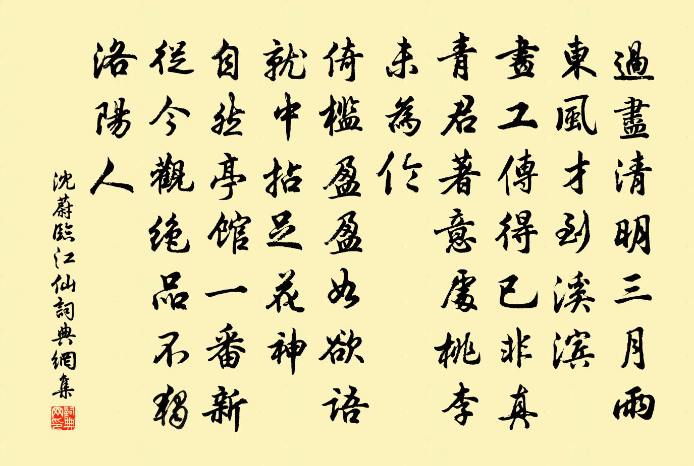 詩詞名句歷史字典書法欣賞書法字典國語詞典說文解字康熙字典古漢語字典標 題 作 者 詩 句 臨江仙作者:沈蔚 朝代:宋代臨江仙原文過盡清明三月雨,東風才到溪濱。畫工傳得已非真。青君著意處,桃李未為倫。倚檻盈盈如欲語,就中拈足花神。自然亭館一番新。從今觀絕品,不獨洛陽人。詩詞問答問:臨江仙的作者是誰?答:沈蔚問:臨江仙寫於哪個朝代?答:宋代問:臨江仙是什麼體裁?答:詞沈蔚臨江仙書法欣賞臨江仙書法作品詩詞推薦說之方憂韓公表大夫疾遽致仕乃蒙傳視送陳州晁說之〔宋代〕末宦從遠役,沈痾得此心。願言麴神降,何用官鬼臨。幽興落醴浦,清夢繞崧岑。使我既慚昔,柰何復愧今。方明古免喪西上山陰賀鑄方回以詩送行非敢贈賀鑄〔宋代〕西上遲遲誰挽留,了君方寸慕松楸。三年既盡亦當起,五斗有餘非所求。早歲向風勞企羨,殘生指日願依投。得官雪後六言范成大〔宋代〕雨後和深巷屐,風力到短檠燈。可惜滴殘檐雪,從教漂盡河冰。邀人賞薔薇孟郊〔唐代〕蜀色庶可比,楚叢亦應無。醉紅不自力,狂艷如索扶。麗蕊惜未掃,宛枝長更紆。何人是花侯,詩老強相呼。頌古三十一首釋安永〔宋代〕不放溪東西,隨分納些兒。冷暖只自知,分明說向誰。陪諸公游故江西韋大夫通德湖舊居有感…韋大夫舊僚也元稹〔唐代〕高墉行馬接通湖,巨壑藏舟感大夫。塵壁暗埋悲舊札,風簾吹斷落殘珠。煙波漾日侵頹岸,狐兔奔叢拂坐隅。唯有大晟府擬撰釋奠十四首佚名〔宋代〕[黃環為宮]大哉宣聖,道德尊崇。維持王化,斯民是宗。典祀有常,精純業隆。神其來格,於昭盛容。以前韻再繼五絕王洋〔宋代〕夜發前村君莫惜,曉與天花比真色。爭先不是壓群芳,祗恐群芳心自息。偈頌一百零一首釋慧性〔宋代〕鳥牙絕頂,結制安居。包羅萬有,吞卻十虛。切忌從它覓,迢迢與我疏。峽水袁燮〔宋代〕峽石險而怪,峽水清且湍。伊誰剪蒙密,發此奇偉觀。兩龍會為一,激烈不可士。蜿蜒潄鳴玉,千古甘以寒。誰雲大晟府擬撰釋奠十四首佚名〔宋代〕[應鐘為羽]聖王生知,闡迺儒規。詩書文教,萬世昭垂。良日惟丁,靈承不爽。揭此精虔,神其來鄉。偈頌七十八首釋正覺〔宋代〕黃櫱傳來,臨際用底,定上座觸著關捩。廓然一念忘緣,泊爾十方無寄。現前不用安排,直下何勞擬議。不風流處秋晚園中二首孫岩〔宋代〕籬落園秋色,株梢罥晚暉。菊花供麴盡,桐葉飼魚稀。宿吉州永慶寺徐照〔宋代〕古邑溪邊寺,吟人愛寂寥。少僧齋室廢,乞食釣鄉遙。鍾韻含霜氣,樓檐近斗杓。漢時銅鑄佛,瞻禮到今朝。偈頌七十六首釋子益〔宋代〕 * 輪,輕撥轉。日出中天,雲開岳面,如優曇花時一現。山隱見梅錢時〔宋代〕萬竹林端滿樹春,略無一點世間塵。年年相見年年好,轉覺梅花是故人。對月了殘經贊釋了惠〔宋代〕好念脫空經,不如山月轉。將謂了多時,猶有者一卷。浣溪沙范成大〔宋代〕十里西疇熟稻香。槿花籬落竹絲長。垂垂山果掛青黃。濃霧知秋晨氣潤,薄雲遮日午陰涼。不須飛蓋護戎裝。悼承天月禪老強至〔宋代〕祖意生來達,詩心老去專。傳燈與誰子,絕筆在何篇。朝客散談席,野禽窺法筵。唯應軒北石,秋後自依然。酹江月/念奴嬌衛宗武〔宋代〕暮雲凝凍,聳玉樓、拈斷冰髯知幾。今歲天公慳破白,未放六霙呈瑞。瘞馬發祥,妖麋應禱,終解從人意。臘前三名句推薦瑕不掩瑜、瑜不掩瑕戴聖《禮記·聘義》 人面不知何處去,桃花依舊笑春風。崔護《題都城南莊》 仍憐故鄉水,萬里送行舟。李白《渡荊門送別》 以近知遠,以一知萬,以微知明。荀子《荀子·非相》 錢財如糞土,仁義值千金。馮夢龍《醒世恆言·卷十七》 林花掃更落,徑草踏還生。孟浩然《春中喜王九相尋 / 晚春》 愁與西風應有約,年年同赴清秋。史達祖《臨江仙·閨思》 獨行潭底影,數息樹邊身。賈島《送無可上人》 喧啾百鳥群,忽見孤鳳凰。韓愈《聽穎師彈琴》 國之興也,天遺之賢人與極言之士;國之亡也,天遺之亂人與善諛之士。呂不韋《呂氏春秋·覽·先識覽》