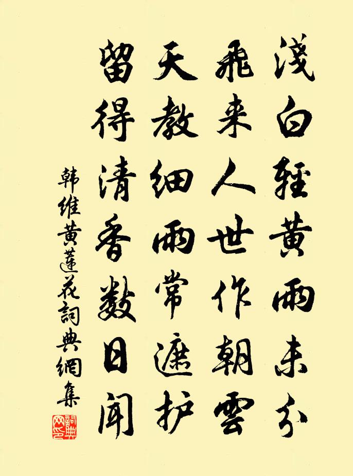 詩詞名句歷史字典書法欣賞書法字典國語詞典說文解字康熙字典古漢語字典標 題 作 者 詩 句 黃蓮花作者:韓維 朝代:宋代黃蓮花原文淺白輕黃雨未分,飛來人世作朝雲。天教細雨常遮護,留得清香數日聞。詩詞問答問:黃蓮花的作者是誰?答:韓維問:黃蓮花寫於哪個朝代?答:宋代韓維黃蓮花書法欣賞黃蓮花書法作品詩詞推薦曉出古岩呈宗偉、子文范成大〔宋代〕曉風生小寒,嵐潤浥巾屨。宿雲埋樹黑,奔溪轉山怒。東方動光彩,晃晃金鉦吐。千峰森隱現,一氣澹回互。平生行香子(山居客至)辛棄疾〔宋代〕白露園蔬。碧水溪魚。笑先生、網釣還鋤。小窗高臥,風展殘書。看北移山,盤谷序,輞川圖。白飯青芻。赤腳長閒遊陸游〔宋代〕柴車去去度橫陂,正是春殘入夏時。果熟多藏新密葉,鶯啼偏占最高枝。迷途每就傭耕問,薄飯時從逆旅炊。隨意和國子夏主簿李花司馬光〔宋代〕儒宮岑寂覺春閒,仙李繁花重壓欄。碎錦不飛蒙樹合,素雲欹亞舉枝難。能詩此日當推謝,捧賜他年足繼桓。更約和戒首座韻釋法薰〔宋代〕兩目瞠瞠視碧霄,生吞佛祖氣雄豪。石潭誰得知深淺,盡日金風鼓怒濤。依韻奉和司徒侍中壬子九日強至〔宋代〕虛堂飛閣席頻移,肯對茱萸憶賜枝。詩集元精尤唱絕,歌翻新曲更相宜。登臨晚日曾誰怨,醉倒秋風不自知。一種題劉直卿崇蘭軒楊萬里〔宋代〕風亦何須過,林仍不厭深。莫將春色眼,來看歲寒心。政坐香通國,端令佩滿襟。楚人更饒舌,得免世間尋次韻和晁無咎學士相迎蘇軾〔宋代〕少年酒獨識晁新酒城,閉門酒卻掃卷旆酒旌。胸中自有談天口,坐卻秦軍發墨守。有子不為謀置錐,虹霓吞吐忘寒寄楊溥子趙蕃〔宋代〕昔聞許劭月旦評,人生倚以分重輕。當時初非徇虛名,往往夷考其學行。今人誰復持此柄,鄉評亦復無公論。故當過池陽,舟中望九華山楊萬里〔宋代〕役役催行邁,忽忽過此春。杯翻五湖月,箏掃九華雲。不是風煙好,何緣句子新。茲游四千里,今日過三分。粉蝶兒長筌子〔元代〕欲說天機,奈塵寰、世人不信。只因他夙緣無分。戀浮華,貪火院,氣神虧損。販屍骸,迷了本來心印。悟後回頭和制帥效謝康樂體孫應時〔宋代〕讀書在雪屋,長嘯亦蝸廬。茲晨從遠役,不柰為飢驅。夕棹悄煙月,朝帆暖菰蒲。情欣秋風至,體愜袢暑徂。拾魚雜歌謠辭。古歌薛維翰〔唐代〕美人怨何深,含情倚金閣。不嚬復不語,紅淚雙雙落。美人閉紅燭,燭坐裁新錦。頻放翦刀聲,夜寒知未寢。西津夜泊周棐〔元代〕孤帆夜落石橋西,橋外青山入會稽。臥聽海 * 地轉,起看江月向人低。一春衰謝憐皮骨,萬國艱虞厭鼓鼙。何處淳熙二年發太上皇帝太上皇后冊寶十一首佚名〔宋代〕重翟出房,社衣被躬。委委佗佗,河潤山容。聖皇臨軒,聖母在宮。定受鴻名,興天無窮。相和歌辭。白頭吟張籍〔唐代〕請君膝上琴,彈我白頭吟。憶昔君前嬌笑語,兩情宛轉如縈素。宮中為我起高樓,更開華池種芳樹。春天百草秋始偈頌一百四十一首釋師範〔宋代〕這兩個老凍儂,頑處似牛皮,爛處如壞絮。雖然各有機關,爭奈渾無展處。只麽低頭懡?歸,不知忘卻來時路。鷓鴣天姬翼〔元代〕雲散風清雨後天。新荷擎露碎珠圓。清泉汩汩流塵外,白石岩岩賴醉眠。山色里,水聲邊。留連風月話重玄。溪童古意謝榛〔明代〕青山無大小,總隔郎行路。遠近生寒雲,愁恨不知數。示阿泰三首陳造〔宋代〕官上依然四壁空,訟庭人寂每從容。看家不為穿窬計,老去登臨分外慵。名句推薦爐火照天地,紅星亂紫煙。李白《秋浦歌十七首》 落葉人何在,寒雲路幾層。李商隱《北青蘿》 忙忙如喪家之狗,急急如漏網之魚。馮夢龍《醒世恆言·卷十七》 月上柳梢頭,人約黃昏後。歐陽修《生查子·元夕》 人有喜慶,不可生妒忌心;人有禍患,不可生喜幸心。朱柏廬《朱子家訓·全文》 歷冰霜、不變好風姿,溫如玉。陸容《滿江紅·詠竹》 浮生只合尊前老。雪滿長安道。舒亶《虞美人·寄公度》 靖安宅里當窗柳,望驛台前撲地花。白居易《望驛台》 止戈為武。左丘明《左傳·宣公·宣公十二年》 置將不善,壹敗塗地司馬遷《史記·高祖本紀》