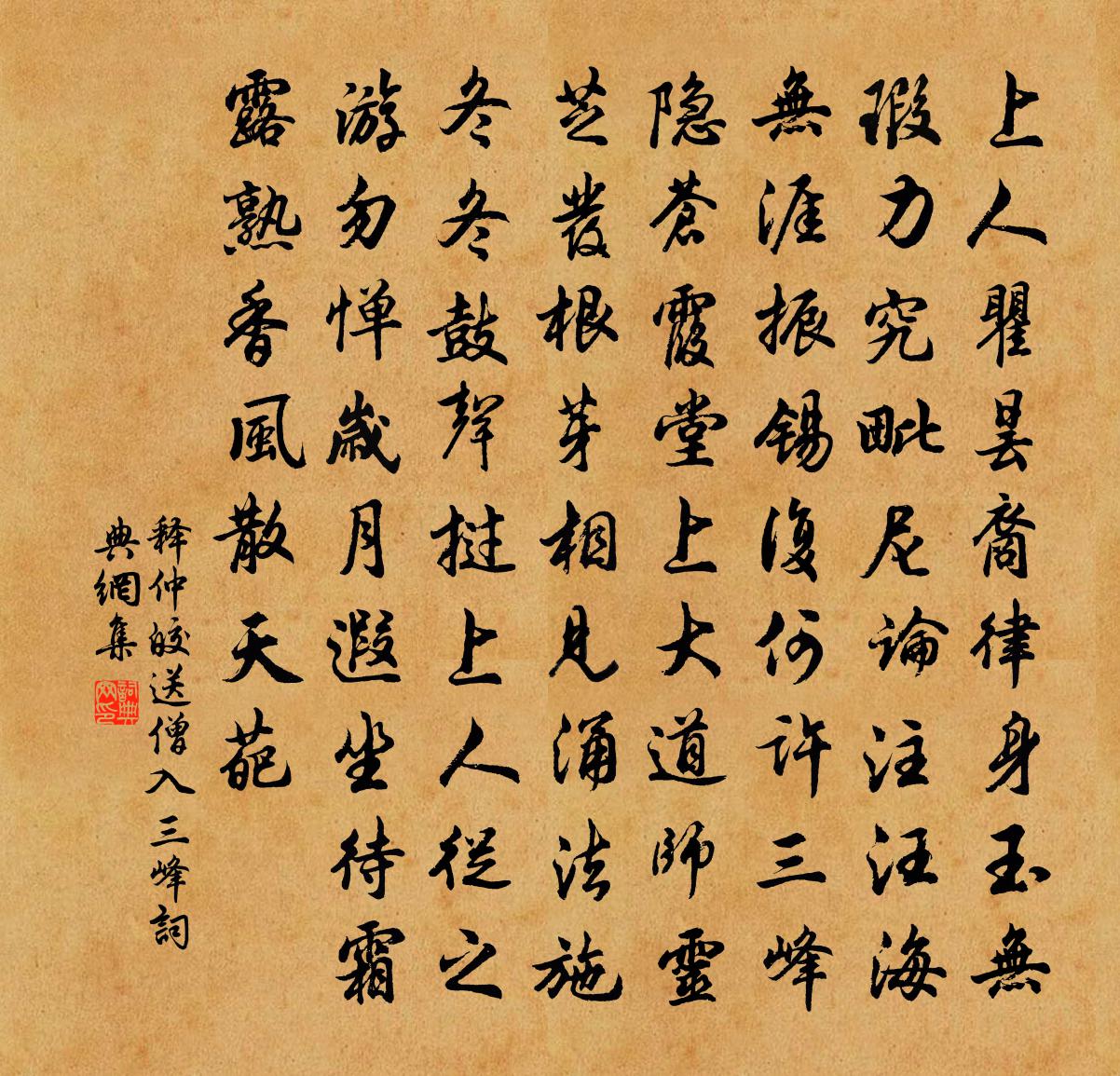 詩詞名句歷史字典書法欣賞書法字典國語詞典說文解字康熙字典古漢語字典標 題 作 者 詩 句 送僧入三峰作者:釋仲皎 朝代:宋代送僧入三峰原文上人瞿曇裔,律身玉無瑕。力究毗尼論,注汪海無涯。振錫復何許,三峰隱蒼霞。堂上大道師,靈芝髮根芽。相見涌法施,鼕鼕鼓聲撾。上人從之游,勿憚歲月遐。坐待霜露熟,香風散天葩。詩詞問答問:送僧入三峰的作者是誰?答:釋仲皎問:送僧入三峰寫於哪個朝代?答:宋代釋仲皎送僧入三峰書法欣賞送僧入三峰書法作品詩詞推薦雨後對月釋永頤〔宋代〕清夜不復寐,蕭然據胡休。對此九天上,陰魄含虛光,光飛激洞戶,彩瑩棲雲塘。芙蓉雜羽蓋,暗水流瑤芳。景異冬日早行連文鳳〔宋代〕客裹間關去路賒,輕衫短帽朔風斜。青霜委地疑行雪,紅葉成林當落花。渡口馬嘶驚睡犬,田頭鹿過散飢鴉。閉門題開元寺閣薛能〔唐代〕一閣見一郡,亂流仍亂山。未能終日住,尤愛暫時閒。唱棹吳門去,啼林杜宇還。高僧不可羨,西景掩禪關。次宋省齋七夕雨楊公遠〔宋代〕織女河邊渡鵲橋,風吹仙袂舉飄飄。洗車一夜滂沱雨,圖得人間起旱苗。張以道歸自甬東先餉土物兩詩為謝張鎡〔宋代〕梨柿魚鹽來海上,殷勤持送與閒官。緣何似得千金贈,明日重親語笑歡。梅兄李龍高〔宋代〕花萼相輝暗遞香,豈無難弟伴元方。水仙只可供奴隸,合得詩人作雁行。卜運算元陳師道〔宋代〕纖軟小腰身,明秀天真面。淡畫修眉小作春,中有相思怨。背立向人羞,顏破因誰倩。不比陽台夢裡逢,親向尊前再答文潛蔡肇〔宋代〕羌兵昔出皋蘭路,欲鏟新城無聚土。煙烽照夜氣如霞,鐵馬連群歕成雨。東西兩關同日破,股掌嬰兒絕哺乳。鼓聲紹興祀先農攝事七首佚名〔宋代〕旨具百味,酌德三疇。貳觴既結,禮洽意周。庶幾嘉鄉,格神之幽。盯我檣事,錫以有秋。靈岩寺二首羅公升〔宋代〕馬嵬錦襪戰塵中,辱頸空餘頸血紅。卻是西施偏命好,國亡猶得嫁朱公。春詞絕句五首秦觀〔宋代〕風驅白雨洗園林,蔽地飛花一寸深。狂紫浪紅俱已矣,老春雖在亦何心。偈頌十首釋德光〔宋代〕說佛說祖,泥中洗土。談妙談玄,十萬八千。現成公案,已落言詮。提起衲僧拄杖子,渾家送上渡頭船。靈隱全提晚步利登〔宋代〕住在山塘深更深,門前落葉與階平。高人聽鶴來相過,野老因樵熟識名。一水欲流山影去,斷雲時伴燒痕生。翛然靈棋卜洪皓〔宋代〕苦樂迎春詠四愁,詔書未暇蔽要囚。已知行止關天命。暫卜窮通聽鬼謀。移監窖幽餐鼠草,奉春械擊易羊裘。何時送人之軍賀知章〔唐代〕常經絕脈塞,復見斷腸流。送子成今別,令人起昔愁。隴雲晴半雨,邊草夏先秋。萬里長城寄,無貽漢國憂。晚憩聞雷王之道〔宋代〕湖外山光入座來,水晶宮闕翠屏開。纖纖細落催花雨,隱隱輕鳴啟蟄雷。次韻張中白元日方回〔宋代〕瓣香清曉肅冠紳,戶外遙山展翠顰。瘦影自憐耽醉叟,歡聲何限喜晴人。匆匆節序梅花老,袞袞塵埃世事新。自有同化光陪寧極之滍陽城韓維〔宋代〕不踏南溪路,於今五換春。能來再聯騎,還是舊遊人。置酒真乘興,談經或入神。歡余不無愧,林壑未還身。晨起二首張耒〔宋代〕窮居無遠念,暇日親庖廚。澤國富滋味,春江出嘉魚。鬻市有懸羔,擷園得嘉蔬。雖無五鼎烹,薦俎頗有餘。導和岳陽樓周弼〔宋代〕憑高望盡寂寥天,與我閒情共渺然。平展暮雲三百里,積停春水二千年。沙洲橫渡荊江雨,石塔遙分嶽麓煙。老我名句推薦山路元無雨,空翠濕人衣。王維《山中》 微陽下喬木,遠色隱秋山。馬戴《落日悵望》 香幃風動花入樓,高調鳴箏緩夜愁。王昌齡《青樓怨》 紅粉佳人休使老,風流浪子莫教貧。佚名《增廣賢文·上集》 嘴甜心苦,兩面三刀,上頭一臉笑,腳下使絆子,明是一盆火,暗是一把刀。曹雪芹《紅樓夢·第六十五回》 可憐報國無路,空白一分頭。楊炎正《水調歌頭·登多景樓》 今日樓台鼎鼐,明年帶礪山河辛棄疾《西江月·堂上謀臣尊俎》 隱約遙峰,和淚謝娘眉嫵。史達祖《綺羅香·詠春雨》 命由我作,福自己求。袁黃《了凡四訓·立命之學》 晝短苦夜長,何不秉燭游!佚名《生年不滿百》