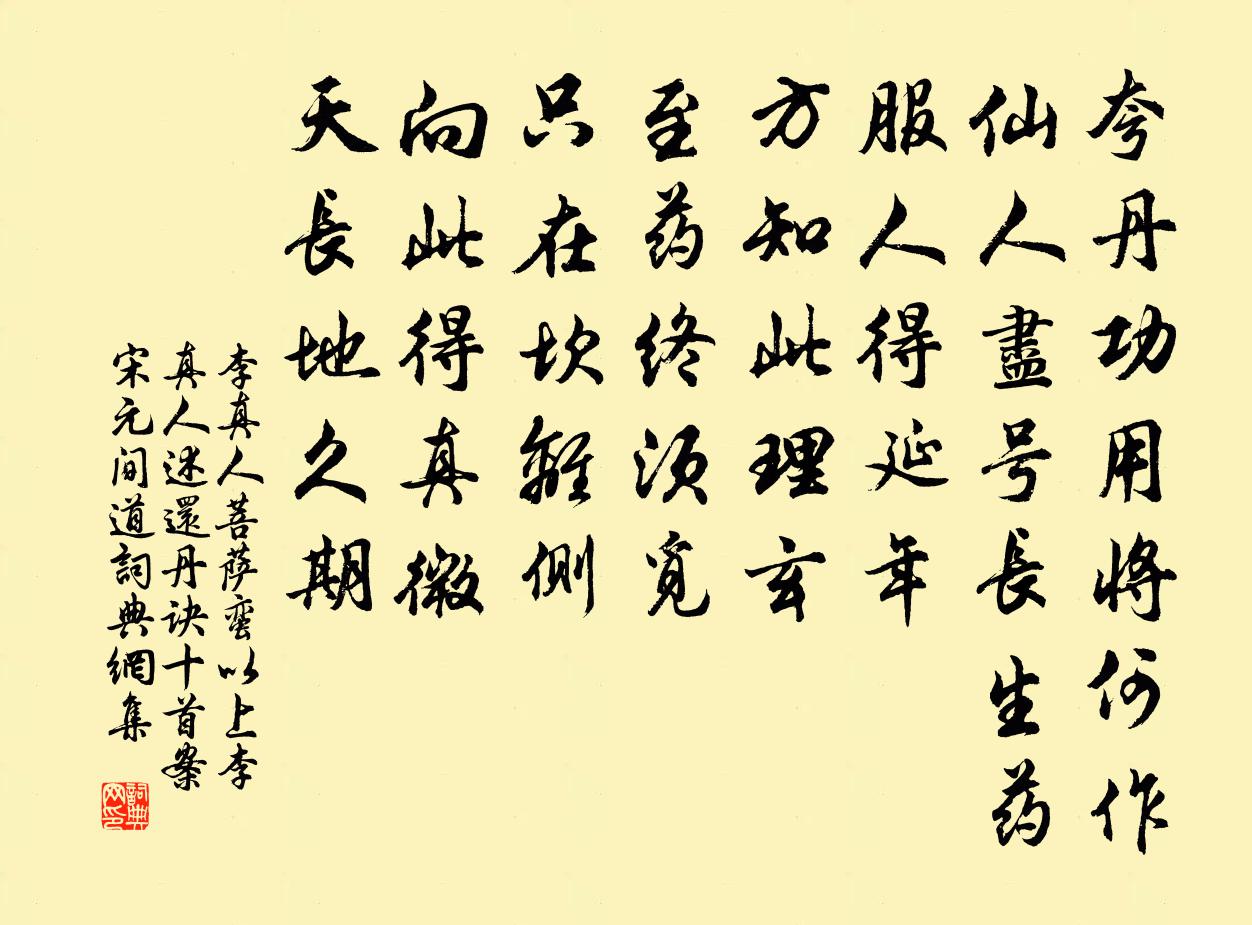 詩詞名句歷史字典書法欣賞書法字典國語詞典說文解字康熙字典古漢語字典標 題 作 者 詩 句 菩薩蠻 以上李真人述還丹訣十首案宋元間道作者:李真人 朝代:元代原文夸丹功用將何作。仙人盡號長生藥。服人得延年。方知此理玄。至藥終須覓。只在坎離側。向此得真微。天長地久期。詩詞問答問:《菩薩蠻 以上李真人述還丹訣十首案宋元間道》的作者是誰?答:李真人問:該詩寫於哪個朝代?答:元代問:該詩是什麼體裁?答:詞書法欣賞菩薩蠻 以上李真人述還丹訣十首案宋元間道書法作品詩詞推薦小重山趙佶〔宋代〕羅綺生香嬌上春。金蓮開陸海,艷都城。寶輿回望翠峰青。東風鼓,吹下半天星。萬井賀昇平。行歌花滿路,月隨題江樂陳氏江亭程公許〔宋代〕漁艇間撐過水東,亂雲含雨晚溟濛。絕憐郊野依林壑,更拓軒窗貯竹風。剩與煙波開靄杳,卻須菑翳略疏通。間居宮詞王仲修〔宋代〕三伏金藏暑正隆,火雲萬里日輪紅。禁中自有清涼地,不借 * 避暑宮。出歌孫楚〔魏晉〕茱萸出芳樹顛。鯉魚出洛水泉。白鹽出河東。美豉出魯淵。薑桂茶荈出巴蜀。椒橘木蘭出高山。蓼蘇出溝渠。精{較藝將畢和禹玉梅堯臣〔宋代〕窗前高樹有棲鵲,記取明朝飛向東。家布望春門外住,身居華省信難通。夜聞相府催張牓,曉聽都堂議奏中。龍閣夏日絕句楊萬里〔宋代〕不但春妍夏亦佳,隨緣花草是生涯。鹿蔥解插纖長柄,金鳳仍開最小花。贈潘天游衛宗武〔宋代〕乾以健而運,如轂不停息。周流遍六虛,升降靡差忒。故能權四序,而以轉萬物。茲其氣之游,造化由是出。一元滿庭芳佚名〔宋代〕鳳閣祥煙,龍城佳氣,明禋恭謝時豐。綺羅爭看,簾幕卷南風。十里仙儀寶仗,暖紅翠、玉碾玲瓏。鑾回也,簫韶次韻謝鬍子遊學二首方回〔宋代〕泮宮分席佐邦侯,免使詩人諷不求。九轉定應能點鐵,一泓何可著吞舟。稍知今是山林晚,獨奈吾衰歲月流。徑欲蝶釋行海〔宋代〕三三兩兩舞春暄,玉翅香須更可憐。拂草巡花情未定,又隨風絮過鞦韆。至夜讀子肅詩卷帖趙蕃〔宋代〕應接有不暇,幽憂能頓除。明當增短日,後且愴離居。恨我平生友,翻成咫尺疏。為生端不易,作客又何如。天山雪歌送蕭治歸京岑參〔唐代〕天山雪雲常不開,千峰萬嶺雪崔嵬。北風夜卷赤亭口,一夜天山雪更厚。能兼漢月照銀山,復逐胡風過鐵關。交河北風曾鞏〔宋代〕北風動地江翻天,我坐極浦維空船。浮雲冥冥下無日,老樹自擺相樛纏。薰琴空聞不可見,應已久絕朱絲弦。遂令次韻子瞻秋雪見寄二首蘇轍〔宋代〕平時出處常聯袂,文翰叨陪舊服膺。自信老兄憐弱弟,豈關天下少良朋。何時杯酒看浮白,清夜餚蔬粗滿登。離思霜花腴吳文英〔宋代〕翠微花路窄,醉花晚風、憑花誰為整敧花冠。霜飽花腴,燭消人瘦,秋光作也都難。病懷強寬。恨雁聲、偏落歌前野息趙蕃〔宋代〕覆之茅三重,樹以不加斲。野息若規模,規模如是作。次兩知縣韻四首陳造〔宋代〕老去棲遲八品官,劍賾深悔誚田單。東鄰未省吟髭斷,笑擲牙牌命肉盤。送趙吏部釋善珍〔宋代〕千家煮蔗漿,萬里隨風桅。谷少蔗愈多,荒歲不療飢。初聞下令嚴,巨賈頗不怡。至今訓農文,可配七月詩。城中書事林逋〔宋代〕一門深掩得閒權,純白遺風要獨全。強接俗庸中反道,敢嫌貧病是欺天。圍形古寺諳尋鶴,照蘚秋廊擬疏玄。從此偈頌二十五首釋道璨〔宋代〕仰山撼樹,溈山良久。說體說用,互揚家醜。名句推薦多情只有春庭月,猶為離人照落花。張泌《寄人》 海記憶體知己,天涯若比鄰。王勃《送杜少府之任蜀州 / 送杜少府之任蜀川》 神閒氣靜,智深勇沉,此八字是幹大事的本領。王永彬《圍爐夜話·第一七六則》 燎沉香,消溽暑。周邦彥《蘇幕遮·燎沉香》 報導先生歸也,杏花春雨江南。虞集《風入松·寄柯敬仲》 桂林風景異,秋似洛陽春。宋之問《始安秋日》 千載琵琶作胡語,分明怨恨曲中論。杜甫《詠懷古蹟五首·其三》 何須急管吹雲暝,高寒灩灩開金餅。高觀國《菩薩蠻·何須急管吹雲暝》 君子所,其無逸佚名《尚書·周書·無逸》 相思血,都沁綠筠枝。姜夔《小重山令·賦潭州紅梅》