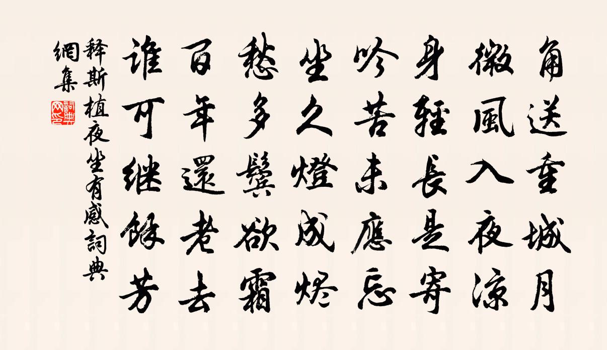 詩詞名句歷史字典書法欣賞書法字典國語詞典說文解字康熙字典古漢語字典標 題 作 者 詩 句 夜坐有感作者:釋斯植 朝代:宋代夜坐有感原文角送重城月,微風入夜涼。身輕長是寄,吟苦未應忘。坐久燈成燼,愁多鬢欲霜。百年還老去,誰可繼余芳。詩詞問答問:夜坐有感的作者是誰?答:釋斯植問:夜坐有感寫於哪個朝代?答:宋代釋斯植夜坐有感書法欣賞夜坐有感書法作品詩詞推薦參政大資毗陵張公輓詩十首周麟之〔宋代〕淝上英游遠,江南慶系長。二卿雙戟貴,七葉一門光。早負鵬天闊,先分桂籍香。中興誰第一,勛烈在旗常。雜曲歌辭。太和第一佚名〔唐代〕國門卿相舊山莊,聖主移來宴綠芳。簾外輾為車馬路,花間踏出舞人場。竟陵遇晝公齊己〔唐代〕高跡何來此,遊方漸老身。欲投蓮岳夏,初過竟陵春。錫影離雲遠,衣痕拂蘚新。無言即相別,此處不迷津。浣溪沙陳克〔宋代〕淡墨花枝掩薄羅。嫩藍裙子窣湘波。水晶新樣碾風荷。問著似羞還似惡,惱來成笑不成歌。芙蓉帳里奈君何。和洪司令梅花吳泳〔宋代〕結綺臨春貯麗華,吹香偶到野人家。霜明月白紗窗淨,但見梅詩不見花。子夜四時歌:冬歌李白〔唐代〕明朝驛使發,一夜絮征袍。素手抽針冷,那堪把剪刀。裁縫寄遠道,幾日到臨洮。次韻天平觀文龐相公以久留塞下見寄宋祁〔宋代〕昔駕軺封北護邊,已慚星鬢久凋年。御爐香外拋晨謁,刁斗聲中廢夜眠。梁雪送殘他日賦,郭舟誰共此時仙。思歸送賀某赴興化任陳起〔宋代〕壺山邈千里,旌旗拂搖空。是邦足文物,教宜先泮宮。嗟余病十載,置身藥裹中。追送不能遠,望望晝錦紅。欹松漪顧況〔唐代〕湛湛碧漣漪,老松欹側臥。悠揚綠蘿影,下拂波紋破。松窗用杜句為韻和以棋酒為意十首曹勛〔宋代〕紅塵舊老我,青秧新插為。寧幸田畯喜,何能屬車鴟。菊花唐寅〔明代〕故園三徑吐幽叢,一夜玄霜墜碧空。多少天涯未歸客,盡借籬落看秋風。無夢令馬鈺〔元代〕三鼓孤眠內守。重把玄門頻扣。喚覺箇中人,自是玉關無漏。無漏。無漏。奼女嬰兒攜手。酬吏部竇郎中直夜見寄羊士諤〔唐代〕解巾侍雲陛,三命早為郎。復以雕龍彩,旋歸振鷺行。玉書期養素,金印已懷黃。茲夕南宮詠,遐情愧不忘。題雲海亭王諶〔宋代〕二十年前曾到此,重來又是晚春時。蘆因水長全然短,山被雲遮分外奇。漁艇添成古圖畫,雁行點破碧瑠璃。布衣句諶祜〔宋代〕王侯蟻穴青青草,鼓吹蛙廬焱焱鐙。和邵雍〔宋代〕君家樑上年時燕,過社今年尚未回。請罰誤君凝竚久,萬花深處小車來。和曾通判招飲後見貽韓維〔宋代〕竹際松間構小堂,高眠客榻燕華觴。每詢濁酒頻加釀,不問余金幾在囊。自愧效陶無好語,敢煩凌杜發新章。慶門晦庵先生遺墨汪炎昶〔宋代〕久遠知誰更解珍,即今獨見墨如新。難懷白壁歸秦國,尚喜烏嘷屬楚人。和關彥遠秋風吹我衣晁補之〔宋代〕海中群魚化黃雀,林烏移巢避歲惡。鄴王城上秋風驚,昔時城中鄴王第。只今蔓草無人行,但見黃河咆哮奔碣石,雜述林泳〔宋代〕徐無黨注歐史,黃仙鶴刻邕書。身外誰為知己,眼前我正是渠。名句推薦名豈文章著,官應老病休。杜甫《旅夜書懷》 書無不可讀者!魏徵《隋書·列傳·卷四十一》 何時更杯酒,再得論心胸。李白《魏郡別蘇明府因北游》 人孰無親,罪人慎察其宗。來俊臣《羅織經·固榮卷第六》 青天蜀道難,紅葉吳江冷。張可久《普天樂·秋懷》 柳鎖鶯魂,花翻蝶夢,自知愁染潘郎史達祖《夜合花·柳鎖鶯魂》 子路,人告之以有過則喜。禹聞善言則拜。孟子《孟子·公孫丑章句上·第八節》 槲葉落山路,枳花明驛牆。溫庭筠《商山早行》 時人不識凌雲木,直待凌雲始道高。杜荀鶴《小松》 龜靈未免刳腸患,馬失應無折足憂。白居易《放言五首·其二》