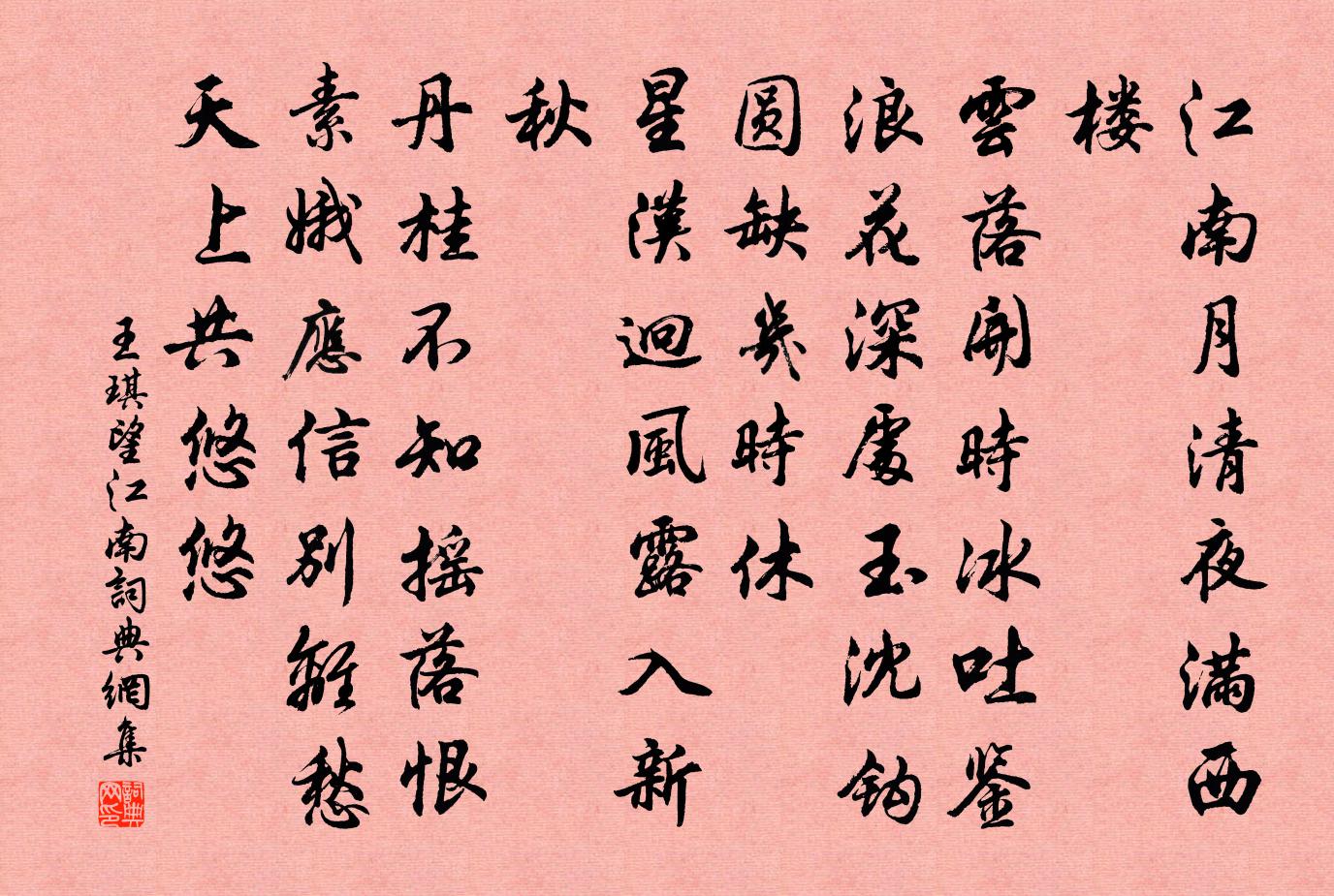 起句“江南月,清夜滿西樓”,寫一個天朗氣清的秋夜,明亮的月光灑滿了西樓。“雲落開時冰吐鑒,浪花深處玉沉鉤。”月升月落,月圓月缺,不知重複了多少次。上句寫天上月,雲堆散開之時,圓月如冰鑒(鏡)高懸天宇;下句寫江中月,浪花綻放深處,缺月似玉鉤沉落江心。前句“鑒”寫月圓,後句“鉤”寫月缺:“冰吐鑒”、“玉沉鉤”,句式新穎別致。本應是“冰鑒”、“玉鉤”為詞,作者以動詞“吐”、“沉”隔開名詞詞組“冰鑒”、“玉鉤”,這樣冰、玉狀月色的皎潔;鑒、鉤描明月的形態,不僅句式有頓挫峭撥之妙,而且詞意上也頗具匠心。上片結句“圓缺幾時休”,既承接收攏了前兩句,又以月圓月缺何時了的感慨,十分自然地開啟了下片。