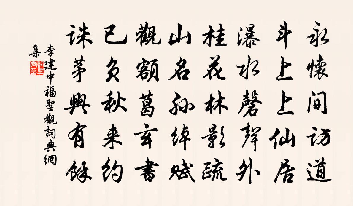 詩詞名句歷史字典書法欣賞書法字典國語詞典說文解字康熙字典古漢語字典標 題 作 者 詩 句 福聖觀作者:李建中 朝代:宋代福聖觀原文永懷間訪道,斗上上仙居。瀑水磬聲外,桂花林影疏。山名孫綽賦,觀額葛玄書。已負秋來約,誅茅興有餘。詩詞問答問:福聖觀的作者是誰?答:李建中問:福聖觀寫於哪個朝代?答:宋代李建中福聖觀書法欣賞福聖觀書法作品詩詞推薦送房元直赴北京嚴維〔唐代〕猶道樓蘭十萬師,書生匹馬去何之。臨岐未斷歸家目,望月空吟出塞詩。常欲激昂論上策,不應憔悴老明時。遙知寄隱靜山懷賢長老梅堯臣〔宋代〕山有枇杷樹,樹多獼猴群。高僧心不著,一似五峰雲。隨飈來溪口,石上起氤氳。果熟獼猴去,自向瀑澗分。寄亳州何郎中二首陳師道〔宋代〕西原追送未成旬,赫赫傳聲已迫人。剩欲抄詩寄來使,尚能拂席致佳賓。孰知簡易歸劉向,誰使循良作寇恂。他日拜年文徵明〔明代〕不求見面惟通謁,名紙朝來滿敝廬。我亦隨人投數紙,世情嫌簡不嫌虛。友梅吳編校壽宮之側築庵曰全歸有詩十詠敬次楊公遠〔宋代〕達人謀事豈躊躇,壽域天開不費鉏。結得庵成無點俗,栽梅時竹當幽居。徽宗齋會呂岩〔唐代〕高談闊論若無人,可惜明君不遇真。陛下問臣來日事,請看午未丙丁春。題牟節叟介壽堂和劉左史韻魏了翁〔宋代〕兒大詩書敵富強,婦供滫瀡養尊章。照盤曉日龍為炙,介壽春風玉作堂。禮物皆由天賦分,家榮亦使里生光。人生再賦荔枝樓陸游〔宋代〕只道文書撥不開,未妨高處獨徘徊。山橫瓦屋披雲出,水自牂牁裂地來。暝入簾陰吹細雨,涼生樓角轉輕雷。痴頑餞潘吳二察院去國五首劉黻〔宋代〕生節雷聲午夜殘,囊封一疏奪冰寒。先生此去非沽譽,留與時人作樣看。贈四子二首陳造〔宋代〕峨峨冰港僅通舟,策策霜風透重裘。良為予來真好事,小留君住得銷憂。可無譚笑傳觴處,剩有煙雲灑筆頭。保社宿猿洞和程師孟韻福州運判〔宋代〕曉來人語□□驚,空有三元□□亭。凍酒點唇浮白蟻,穠桃迷眼落紅星。地名小酉神仙窟,天設湘 * 墨屏。蘊藉元宵微雨十六夜雨止見月仲並〔宋代〕燈火千門競是日,出戶黃昏雲抹漆。夜光乘暗何處投,冷淡行人悵如失。明朝風清天動色,雲陰初若龜兆坼。須臾雜曲歌辭別離曲張籍〔唐代〕行人結束出門去,馬蹄幾時踏門路。憶昔君初納彩時,不言身屬遼陽戍。早知今日當別離,成君家計良為誰。男兒獻鄭都官虛中〔唐代〕早晚辭班列,歸尋舊隱峰。代移家集在,身老詔書重。藥秘仙都訣,茶開蜀國封。何當答群望,高躡傅岩蹤。柳枝朱敦儒〔宋代〕江南岸,江北岸。折送行人無盡時。恨分離。酒一杯,淚雙垂。君到長安百事違。幾時歸。醉落魄/一斛珠周紫芝〔宋代〕雲深海闊。天風吹上黃金闕。酒醒不記歸時節。三十年來,往事無人說。浮生正似風中雪。丹砂豈是神仙訣。世間冬夜宿余正字靜恭里閒居喻鳧〔唐代〕每來多便宿,不負白雲言。古木朔風動,寒城疏雪翻。微燈懸刻漏,舊夢返湘沅。先是琴邊起,知為閣務繁。偈傾一百三十三首釋法薰〔宋代〕達磨不會禪,夫子不識字。第一莫將來,將來不相似。生查子·含羞整翠鬟歐陽修〔宋代〕含羞整翠鬟,得意頻相顧。雁柱十三弦,一一春鶯語。嬌雲容易飛,夢斷知何處。深院鎖黃昏,陣陣芭蕉雨。鏡齋相士求詩二首姚勉〔宋代〕鵠袍待對滿京華,剛許癯儒作探花。性淡不知花可探,班頭獨立紫宸衙。名句推薦近鄉情更怯,不敢問來人。宋之問《渡漢江》 枯楊枯楊爾生稊,我獨七十而孤棲。李白《雉朝飛》 醉翁之意不在酒,在乎山水之間也。歐陽修《醉翁亭記》 不為小害善,故有大名;不蚤見示,故有大功。韓非及後人《韓非子·喻老》 長風萬里送秋雁,對此可以酣高樓。李白《宣州謝朓樓餞別校書叔雲 / 陪侍御叔華登樓歌》 無肉令人瘦,無竹令人俗。蘇軾《於潛僧綠筠軒》 東風吹雨過青山,卻望千門草色閒。盧綸《長安春望》 亂山殘雪夜,孤燭異鄉人。崔塗《除夜 / 巴山道中除夜書懷 / 除夜有懷》 背若泰山,翼若垂天之雲。莊周《逍遙遊(節選)》 何人解賞西湖好,佳景無時。歐陽修《採桑子·何人解賞西湖好》