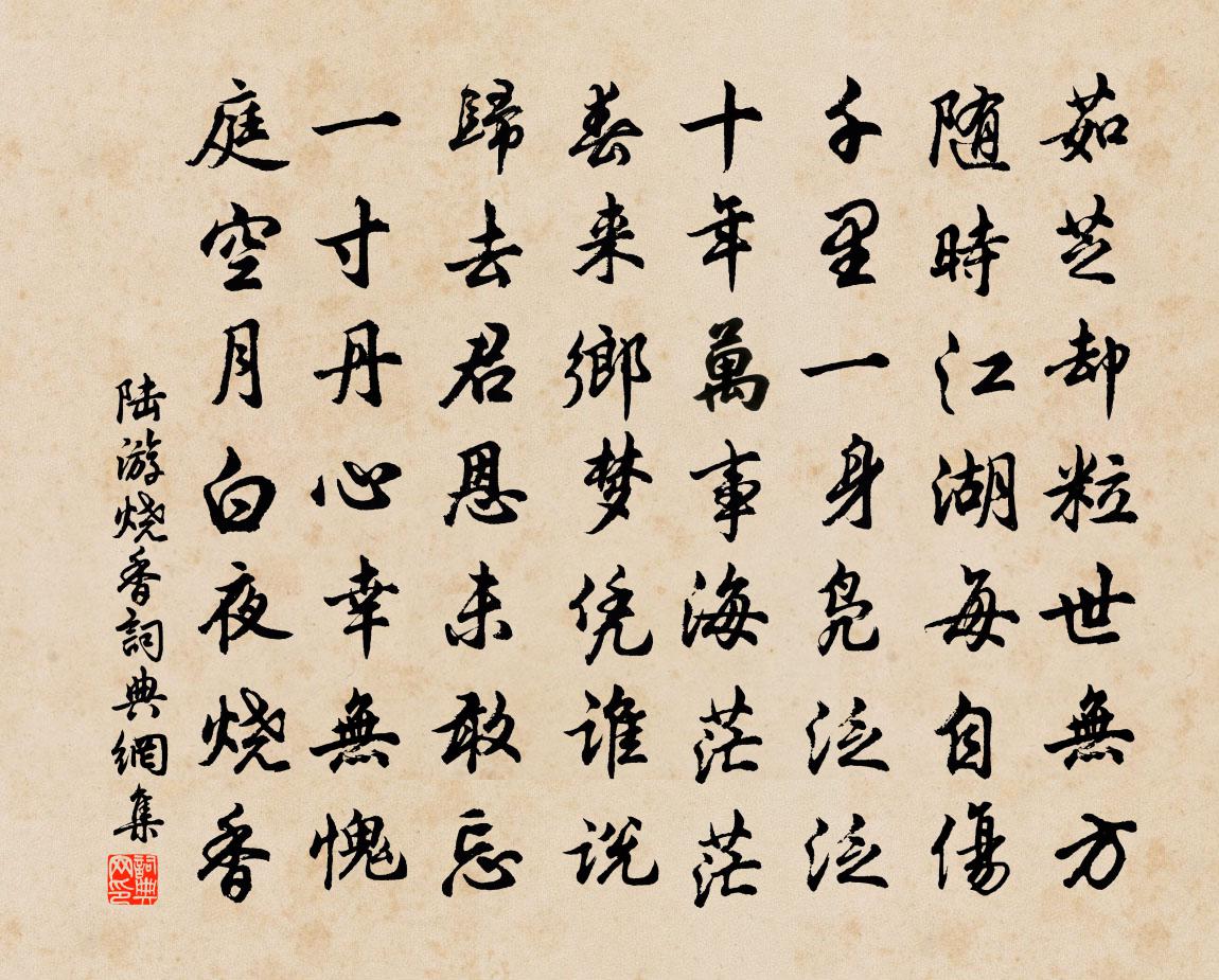 詩詞名句歷史字典書法欣賞書法字典國語詞典說文解字康熙字典古漢語字典標 題 作 者 詩 句 燒香作者:陸游 朝代:宋代燒香原文茹芝卻粒世無方,隨時江湖每自傷。千里一身鳧泛泛,十年萬事海茫茫。春來鄉夢憑誰說,歸去君恩未敢忘。一寸丹心幸無愧,庭空月白夜燒香。詩詞問答問:燒香的作者是誰?答:陸游問:燒香寫於哪個朝代?答:宋代問:陸游的名句有哪些?答:陸游名句大全陸游燒香書法欣賞燒香書法作品詩詞推薦總宜園董嗣杲〔宋代〕望極湖變幻奇秒,萬千光景自紛披。妙分西子爭妍態,絕想東坡得句時。柳徑曲埋兜率寺,花陰直接放生池。內官又贈筠仙一幅曾國藩〔清代〕人生有乖隔,咫尺成關山。我心田百轉,從來輸石頑。日吞語戴侯,君在張李間。為君畫新竹,幽淡不容攀。我家十六日夜月色可愛病體怯風欹枕看窗影殊佳舒岳祥〔宋代〕此夜月明勝月半,可憐衰病自欹眠。窗前樹子如人影,渺渺羈雌叫渚田。登一鑒亭有懷亡弟老成下世李呂〔宋代〕半年懶向此經行,上巳重來雨乍晴。三徑就荒春草合,一亭依舊暮山橫。悵懷丘壑空陳跡,極目園林不勝情。老境贊歷代天師第二十二代諱善字長元白玉蟾〔宋代〕參遍名山謁洞天,相逢卻是活神仙。歸來換骨回陽日,屈指人間九十年。菩薩蠻(和韻)盧炳〔宋代〕夢回小枕敧寒玉。博山香暖沈煙續。帷薄怯輕紗。風牽幌帶斜。夜窗雲影細。月送花陰至。身世在陶唐。閒愁不掛達理歌釋印肅〔宋代〕普庵識心達理,不是胡言亂語。教化三千大千,個個透泥入水。應無所住生心,更不祭神拜鬼。時中淨念法身,何詠史詩孟津胡曾〔唐代〕秋風颯颯孟津頭,立馬沙邊看水流。見說武王東渡日,戎衣曾此叱陽侯。初貶官過望秦嶺(自此後詩江州路上作)白居易〔唐代〕草草辭家憂後事,遲遲去國問前途。望秦嶺上回頭立,無限秋風吹白須。七月二十八日夜與王鄭二秀才聽雨後夢作李商隱〔唐代〕初夢龍宮寶焰然,瑞霞明麗滿晴天。旋成醉倚蓬萊樹,有個仙人拍我肩。少頃遠聞吹細管,聞聲不見隔飛煙。逡巡潮陽謁靈山大顛禪師白玉蟾〔宋代〕天地神只不可誣,小人君子費分疎。我無其事初何卹,自揆於心或未如。豈是大顛留乃服,只聞刺史造吾廬。誰能次韻答景仁喜雨韓維〔宋代〕涼雲四向復,沴氣一消沉。上天垂景貺,高秋沾喜霖。槁苗變新實,時菊抽芳心。聆君得意句,起我掉頭吟。答通判張太博賀雪應期宋祁〔宋代〕親祝星魚裂繪綃,再旬方見瑞英飄。陰連臘底寒威在,潤壓春頭癘氣銷。碎粒有聲欺瓦屋,亂花無次惱林條。府中馬上值牧兒姜夔〔宋代〕馬背何如牛背,短衣落日空山。只麽身歸盤谷,未須名滿人間。過張邯鄲莊姚合〔唐代〕客行長似病,煩熱束四肢。到君讀書堂,忽若逢良醫。堂前水交流,堂下樹交枝。兩門延風涼,洗我昏濁肌。與子漁父詞十三首蒲壽宬〔宋代〕萬里長江一釣絲,蕭蕭蓬鬢任風吹。微雨過,片帆欹。青山農淡更多奇。偶作白居易〔唐代〕籃舁出即忘歸舍,柴戶昏猶未掩關。聞客病時慚體健,見人忙處覺身閒。清涼秋寺行香去,和暖春城拜表還。木雁禪人並化主寫真求贊釋正覺〔宋代〕湛乎性源,游乎度門。動靜出礙,方圓不痕。寒木得春晚,雪窗亡夜昏。通塞也虛離實坎,變化也連乾斷坤。六和題軫師房二首張耒〔宋代〕銅瓶布衲出塵埃,疏瘦風標日一齋。門徑蕭然更無事,出螢飛鴿及時來。向湖邊(江緯讀書堂)江緯〔宋代〕退處鄉關,幽棲林藪,舍宇第須茅蓋。翠巘清泉,啟軒窗遙對。遇等閒、鄰里過從,親朋臨顧,草草便成幽會。策名句推薦擊鼓其鏜,踴躍用兵。佚名《擊鼓》 竹里繰絲挑網車,青蟬獨噪日光斜。李賀《南園十三首》 五月雖熱麥風清,檐頭索索繰車鳴。王建《田家行》 春陰垂野草青青,時有幽花一樹明。蘇舜欽《淮中晚泊犢頭》 撥雪尋春,燒燈續晝。暗香院落梅開後。毛滂《踏莎行·元夕》 霜輕未殺萋萋草,日暖初乾漠漠沙。白居易《早冬》 四邊伐鼓雪海涌,三軍大呼陰山動。岑參《輪台歌奉送封大夫出師西征》 度德而處之,量力而行之左丘明《左傳·隱公·隱公十一年》 近鄉情更怯,不敢問來人。宋之問《渡漢江》 何須急管吹雲暝,高寒灩灩開金餅。高觀國《菩薩蠻·何須急管吹雲暝》