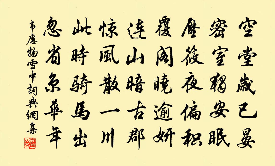 詩詞名句歷史字典書法欣賞書法字典國語詞典說文解字康熙字典古漢語字典標 題 作 者 詩 句 雪中作者:韋應物 朝代:唐代雪中原文空堂歲已晏,密室獨安眠。壓筱夜偏積,覆閣曉逾妍。連山暗古郡,驚風散一川。此時騎馬出,忽省京華年。詩詞問答問:雪中的作者是誰?答:韋應物問:雪中寫於哪個朝代?答:唐代問:雪中是什麼體裁?答:五律問:韋應物的名句有哪些?答:韋應物名句大全韋應物雪中書法欣賞雪中書法作品注釋全唐詩:卷193_40詩詞推薦龍花寺主家小尼(郭代公愛姬薛氏幼嘗為尼小名仙人子)白居易〔唐代〕頭青眉眼細,十四女沙彌。夜靜雙林怕,春深一食飢。步慵行道困,起晚誦經遲。應似仙人子,花宮未嫁時。宿東林寺陳杰〔宋代〕遠公招隱處,宿我上方雲。夜永地只出,谷虛天籟聞。挑燈過雁盡,得句曉窗分。不寐關何事,幽棲意自欣。春日即事崔櫓〔唐代〕一百五日又欲來,梨花梅花參差開。行人自笑不歸去,瘦馬獨吟真可哀。杏酪漸香鄰舍粥,榆煙將變舊爐灰。畫橋里中杜黎廷瑞〔宋代〕蘚石莓牆屋數楹,年年來賽社公靈。兒童趁節歡如沸,父老傷春涕欲零。海燕邊鴻何日了,夏松殷柏為誰青。村醪次韻何廉昉太守感懷述事十六首曾國藩〔清代〕溢觴初引一泓泉,流出蛟龍萬丈淵。從古精誠能破石,薰天事業不貪錢。腐儒封拜稱詩伯,上策屯耕在現田。巨海晚秋農家陸游〔宋代〕豢犬使警夜,畜雞用司旦;徹警盜所窺,失旦固吾患。豈無糠粞費,施報不可緩。家居亦為政,發我中夜嘆。贈別謝茂直趙蕃〔宋代〕江東何許上饒郡,置吏能淹謝法曹。與世相逢腰漫折,對山吟詠首頻搔。誰憐老去斗升祿,未博平生燈火勞。我自三鴛鴦篇譚嗣同〔清代〕轆轤鳴,秋風晚,寒日荒荒下秋苑。轆轤鳴,井水寒,三更絡繹啼井欄。鴛鴦憔悴不成雙,兩雌一雄鳴鏗鏘。哀鳴贈易秀才李白〔唐代〕少年解長劍,投贈即分離。何不斷犀象,精光暗往時。蹉跎君自惜,竄逐我因誰。地遠虞翻老,秋深宋玉悲。空摧廢宅釋文珦〔宋代〕昔年夸富貴,磨滅等流塵。應是重歸燕,難尋舊主人。徑莎空泣露,門柳不成春。唯有同遊客,經過感慨頻。奉和魯望上元日道室焚修皮日休〔唐代〕明真台上下仙官,玄藻初吟萬籟寒。飆御有聲時杳杳,寶衣無影自珊珊。蕊書乞見齋心易,玉籍求添拜首難。端簡九日無酒仍不見菊唯岩桂一瓶伴此岑寂喻良能〔宋代〕白衣不至酒難賒,兀坐晴窗獨飲茶。今日重陽對岩桂,昔年百本看黃花。懷古堂前小梅漸開四首楊萬里〔宋代〕絕艷元非著粉團,真香亦不在須端。何曾天上冰玉質,卻怕人間霜雪寒。枝似去年仍轉瘦,花於來歲定誰看。老夫李通判休日約僚屬追涼於淨因已復酌於芙蕖館趙蕃〔宋代〕野寺依林木,官園帶芰荷。飯蔬朝共集,尊酒晚成過。歲月記游勝,禮容寬俗苛。公能數傾倒,我得慰蹉跎。示師文 其二王冕〔元代〕悵望倚門久,月光清滿天。念家情切切,為客鬢娟娟。細草荒山徑,游雲過石田。安能攜爾輩?飽飯老林泉。和襲美醉中先起次韻張賁〔唐代〕何事桃源路忽迷,惟留雲雨怨空閨。仙郎共許多情調,莫遣重歌濁水泥。減字木蘭花蔡伸〔宋代〕彤庭龍尾。禮備天顏知有喜。九奏初傳。耳冷人間十七年。盈成持守。仁德如春漸九有。三輔名州。好整笙歌結勝贈太素庵軻律師陳師道〔宋代〕枕帳清寒夜色空,琉璃明淨晚燈紅。定知城市無窮事,盡在山人冷眼中。嘉泰三年皇后冊寶十三首佚名〔宋代〕茂建坤極,容典聿新。天命所贊,慈訓是遵。肅涓彀旦,躬御紫宸。鴻禧累福,駢麥翕臻。謝湯生惠酒和來韻劉宰〔宋代〕聞道吾猶及老成,高秋離索不勝情。朋緘已喜賢從事,二缶那堪對曲生。多病吾今同退鷁,壯懷君同掣長鯨。能來名句推薦西門秦氏女,秀色如瓊花。李白《秦女休行》 凡治天下,必因人情。韓非及後人《韓非子·八經》 良辰當五日,偕老祝千年。權德輿《端午日禮部宿齋有衣服彩結之貺以詩還答》 逕直夫何細!橋危可免扶?楊萬里《寒食上冢》 歡笑情如舊,蕭疏鬢已斑。韋應物《淮上喜會梁川故人 / 淮上喜會梁州故人》 白下有山皆繞郭,清明無客不思家。高啟《清明呈館中諸公》 月傍苑樓燈影暗,風傳閣道馬蹄回。王守仁《元夕二首》 山從人面起,雲傍馬頭生。李白《送友人入蜀》 說詩者,不以文害辭,不以辭害志。以意逆志,是為得之。孟子《孟子·萬章章句上·第四節》 世人結交須黃金,黃金不多交不深。張謂《題長安壁主人》