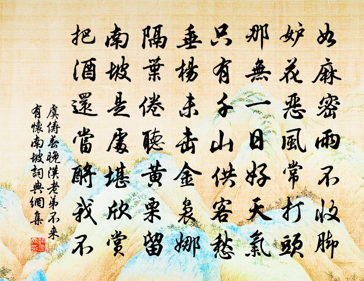 詩詞名句歷史字典書法欣賞書法字典國語詞典說文解字康熙字典古漢語字典標 題 作 者 詩 句 春晚漢老弟不來有懷南坡作者:虞儔 朝代:宋代春晚漢老弟不來有懷南坡原文如麻密雨不收腳,妒花惡風常打頭。那無一日好天氣,只有千山供客愁。垂楊未擊金裊娜,隔葉倦聽黃栗留。南坡是處堪欣賞,把酒還當酹我不。詩詞問答問:春晚漢老弟不來有懷南坡的作者是誰?答:虞儔問:春晚漢老弟不來有懷南坡寫於哪個朝代?答:宋代虞儔春晚漢老弟不來有懷南坡書法欣賞春晚漢老弟不來有懷南坡書法作品詩詞推薦封建論柳宗元〔唐代〕天地果無初乎?吾不得而知之也。生人果有初乎?吾不得而知之也。然則孰為近?曰:有初為近。孰明之?由封建賦秋鴻送劉衡州梅堯臣〔宋代〕秋鴻整羽翮,去就自因時。往春南方來,遂止天泉池。天泉水清泚,鴛鷺日追隨。蒲藻豈不樂,江湖信所宜。今朝書隱者壁蒲壽宬〔宋代〕鵑啼花落春已非,秧老蠶眠雨初霽。牛衣夢覺山日高,風前猶是巢由世。和劉中書仙詩沈約〔南北朝〕清旦發玄洲。是暮宿丹丘。崑山西北映。流泉東南流。霓裳拂流電。雲車委輕霰。崢嶸上不覩。寥廓下無見。懷怡雲平老三首劉應時〔宋代〕柔桑已密吳蠶老,簾幙低垂燕子飛。想見石欄倒閉點筆,海雲深重濕山衣。六月六日倪{奧下加山}庵坐雨陳著〔宋代〕山外黃塵不到門,南風松竹翠紛紛。暗中有虎村嗥合,夜半聞雞老睡分。帶得兒來同坐雨,飛歸家去欲排雲。收書菩薩蠻·牡丹含露真珠佚名〔宋代〕牡丹含露真珠顆,美人折向庭前過。含笑問檀郎,花強妾貌強?檀郎故相惱,須道花枝好。一面發嬌嗔,碎挪花打相見歡(見月聞笛八月五夜)李處全〔宋代〕新涼襟袂冷然。乍晴天。風送誰家羌管、月便娟。雲散盡,秋空碧,玉鉤懸。洗耳時聽三弄、等團圓。龍潭山黃溍〔元代〕二月清江照眼明,避風舟楫滿回汀。斷雲挾雨時時黑,密葉藏花樹樹青。習隱未成陶令賦,行歌聊共屈原醒。碧潭過證道寺董嗣杲〔宋代〕證道山門曠,延僧草座禪。不知為額始,曾記有歌傳。驛路橋樑壞,沙溪石蘚填。往來荒廨近,時可托清眠。酬劉員外月下見寄章八元〔唐代〕夜涼河漢白,卷箔出南軒。過月鴻爭遠,辭枝葉暗翻。獨謠聞麗曲,緩步接清言。宣室思前席,行看拜主恩。金門寺中見李西台與二錢唱和四絕句,戲用其蘇軾〔宋代〕西台妙跡繼楊風,無限龍蛇洛寺中。一紙清詩吊興廢,塵埃零落梵王宮。長相思·以書寄西泠諸友即題其後吳錫麒〔清代〕說相思,問相思,楓落吳江雁去遲。天寒二九時。怨誰知?夢誰知?可有梅花寄一枝?雪來翠羽飛。東園張耒〔宋代〕浮雲蔽亭午,白日成蕭森。余涼入坐隅,蕭灑散煩襟。孟夏愛吾屋,秀木成佳陰。眾果頗已成,永日鳴山禽。杖履病起二首陳造〔宋代〕吏民兩兩議公痴,簿領空勤笑語稀。元亮有詩新止酒,休文多病不勝衣。飛塵懶拂孤三絕,止水初澄悟百非。窗度聞石湖海棠盛開亟攜家過之三絶范成大〔宋代〕東風花信十分開,細意留連待我來。開過十分風不動,更無一片點蒼苔。往年因讀岳王傳嘗為之賦今過東林睹其遺像感黃文雷〔宋代〕將軍英爽冠人豪,眼底山河累寶刀。青女護香天亦悞,黑龍飲渭數何逃。當時僧說松楸犯,今日人推閥閱高。珍重同鄂州都統制司登壓雲亭袁說友〔宋代〕一帶城頭四望全,壓雲亭上更無邊。手攀北斗輕飛肉,目盼南樓僅及肩。城郭千年高復下,江湖萬里後還先。平生宿山寺賈島〔唐代〕眾岫聳寒色,精廬向此分。流星透疏木,走月逆行雲。絕頂人來少,高松鶴不群。一僧年八十,世事未曾聞。頌古二十八首釋道川〔宋代〕語不邪,笑不來。拙鋪設,巧安排。猢猻將板拍,野老舞三台。名句推薦防民之口,甚於防川。左丘明《國語·周語·邵公諫厲王弭謗》 小快害義,小慧害道,小辨害治,苟心傷德。劉向《說苑·談叢》 清夜何湛湛,孤燭映蘭幕。江淹《銅爵妓》 攜壺酌流霞,搴菊泛寒榮。李白《九日》 一半黃梅雜雨晴,虛嵐浮翠帶湖明,閒雲高鳥共身輕。鄭文焯《浣溪沙·從石樓石壁往來鄧尉山中》 目妄視則淫,耳妄聽則惑,口妄言則亂。劉安及其門客《淮南子·主術訓》 心事孤山春夢在,到思量、猶斷詩魂吳文英《極相思·題陳藏一水月梅扇》 更深人去寂靜,但照壁孤燈相映。周邦彥《關河令·秋陰時晴漸向暝》 悵臥新春白袷衣,白門寥落意多違。李商隱《春雨》 解釋春風無限恨,沉香亭北倚闌乾。李白《清平調·其三》