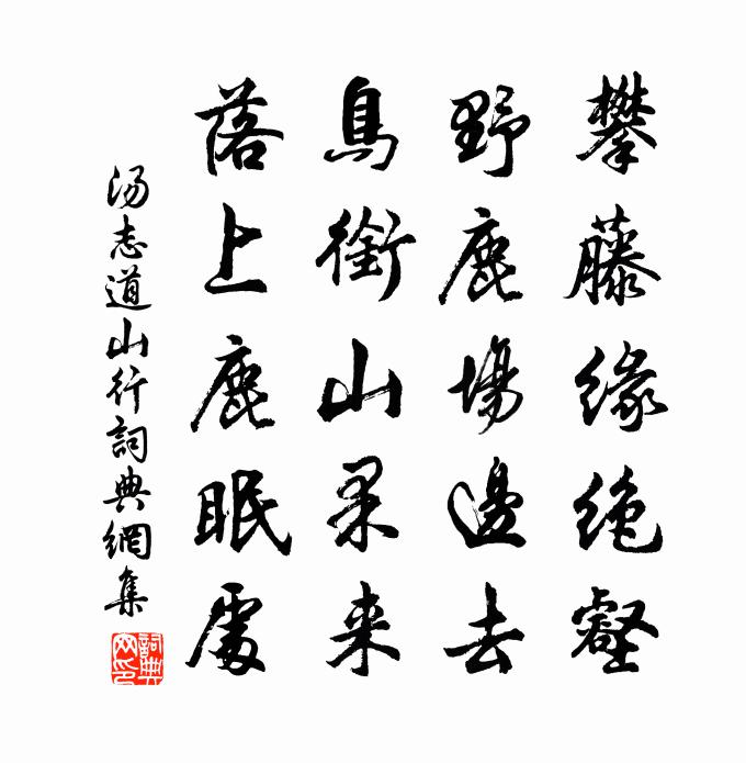 詩詞名句歷史字典書法欣賞書法字典國語詞典說文解字康熙字典古漢語字典標 題 作 者 詩 句 山行作者:湯志道 朝代:宋代山行原文攀藤緣絕壑,野鹿場邊去。鳥銜山果來,落上鹿眠處。詩詞問答問:山行的作者是誰?答:湯志道問:山行寫於哪個朝代?答:宋代湯志道山行書法欣賞山行書法作品詩詞推薦山中夜聞風雨王銍〔宋代〕空山清夜寒無寐,松檜搖聲風雨高。行盡江湖忘岩壑,猶疑繞屋盡波濤。蝶戀花晏幾道〔宋代〕卷絮風頭寒欲盡。墜粉飄紅,日日香成陣。新酒又添殘酒困。今春不減前春恨。蝶去鶯飛無處問。隔水高樓,望斷山谷自贊雲作夢中夢見身外身福唐曾錫盛談西周必大〔宋代〕大患都緣有此身,笑看身外假為真。夢中更作西湖夢,誰謂先生不到閩。聞歌二絕葛立方〔宋代〕月明如鏡酒如空,響谷清聲出漢宮。怪得中庭紅葉墮,琉璃帳底唱迴風。又和西捷晁說之〔宋代〕西州五帥議多攻,決策曾聞利不窮。今日一乘能心取,異時重譯要皆通。明光喜霽甲兵雨,沙磧恩搖草木風。自顧曉寢白居易〔唐代〕轉枕重安寢,回頭一欠伸。紙窗明覺曉,布被暖知春。莫強疏慵性,須安老大身。雞鳴一覺睡,不博早朝人。村東晚眺陸游〔宋代〕飽食無營過暮年,筇枝到處一蕭然。清秋欲近露沾草,新月未高星滿天。遠火微茫沽酒市,叢蒲窸窣釣魚船。喔詩頌古一百二十一首釋宗杲〔宋代〕雲門舉起竹篦,禪和切忌針錐。鸞鳳不棲荊棘,{左感右鳥}{左感右鳥}偏守空池。石橋張景脩〔宋代〕天與晴來抵萬金,更逢詩伯共登臨。輟公一夜楞嚴講,慰我十年方廣心。白雪陽春雖寡和,高山流水有知音。石橋冬節後至丞相第詣世子車中作沈約〔南北朝〕廉公失權勢,門館有虛盈。貴賤猶如此,況乃曲池平。高車塵未滅,珠履故餘聲。賓階綠錢滿,客位紫苔生。誰當松樹元稹〔唐代〕華山高幢幢,上有高高松。株株遙各各,葉葉相重重。槐樹夾道植,枝葉俱冥濛。既無貞直乾,復有罥掛蟲。何不送韋中丞奉使新羅權德輿〔唐代〕淳化洽聲明,殊方均惠養。計書重譯至,錫命雙旌往。星辭北極遠,水泛東溟廣。斗柄辨宵程,天琛宜晝賞。孤光雜言送當世待制知楊州梅堯臣〔宋代〕廣陵老人爭持壺酒,朝言送少年使君,暮言迎少年太守,少年俱是玉墀人,文章快利生銅吼。莫作蕪城賦,事往復題龍門僧房劉滄〔唐代〕靜室遙臨伊水東,寂寥誰與此身同。禹門山色度寒磬,蕭寺竹聲來晚風。僧宿石龕殘雪在,雁歸沙渚夕陽空。偶將上元次日至黃州遇雨袁說友〔宋代〕誰說黃州斗樣微,滿城燈火亦相輝。痴兒方有揶揄意,卻得連江雨解圍。別親朋鄭蜀賓〔唐代〕畏途方萬里,生涯近百年。不知將白首,何處入黃泉。壽致政徐光祿趙汝騰〔宋代〕易躋廿四中書考,難聚三千聽講生。入侍親庭為一笑,方瞳弘景轉精神。李斯徐鈞〔宋代〕燃除六籍忍坑儒,本欲愚人卒自愚。若使當時甘被逐,東門牽犬歡應無。題馬世功豁野堂左璵〔宋代〕歡言赴幽期,作意理煙艇。曳纜松篁陰,未覺心地迥。舍舟登爽塏,微步水雲淨。扶輿登斯堂,遐眺方一騁。開軒偈頌五十一首釋道沖〔宋代〕孰名為佛,禮者是誰。設或未辨端倪,看四棱塌地。名句推薦紛紛墜葉飄香砌。夜寂靜,寒聲碎。范仲淹《御街行·秋日懷舊》 蜀道之難,難於上青天!李白《蜀道難》 霜威出塞早,雲色渡河秋。李白《太原早秋》 楊柳風柔,海棠月淡,獨自倚闌時。薩都剌《小闌乾·去年人在鳳凰池》 多知而無親,博學而無方,好多而無定者,君子不與。荀子《荀子·大略》 歸師勿掩,窮寇莫追。羅貫中《三國演義·第九十五回》 東飛烏鵲西飛燕。盈盈一水經年見。陳師道《菩薩蠻·七夕》 春潮帶雨晚來急,野渡無人舟自橫。韋應物《滁州西澗》 中秋佳月最端圓。老痴頑。見多番。陳著《江城子·中秋早雨晚晴》 仍憐故鄉水,萬里送行舟。李白《渡荊門送別》