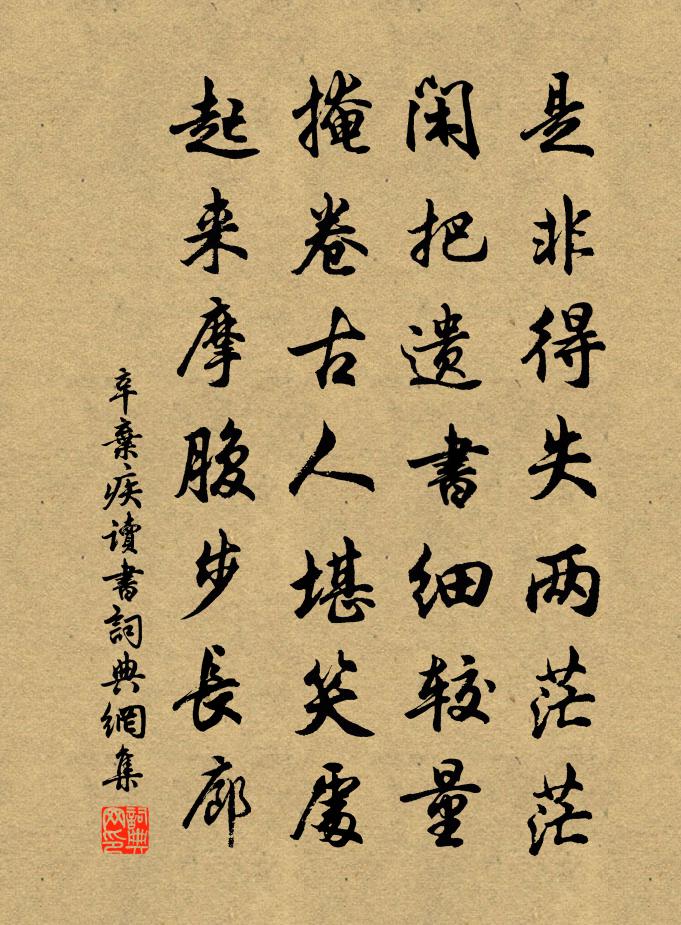 詩詞名句歷史字典書法欣賞書法字典國語詞典說文解字康熙字典古漢語字典標 題 作 者 詩 句 讀書作者:辛棄疾 朝代:宋代讀書原文是非得失兩茫茫,閒把遺書細較量。掩卷古人堪笑處,起來摩腹步長廊。詩詞問答問:讀書的作者是誰?答:辛棄疾問:讀書寫於哪個朝代?答:宋代問:辛棄疾的名句有哪些?答:辛棄疾名句大全辛棄疾讀書書法欣賞讀書書法作品詩詞推薦津頭望白水周繇〔唐代〕晴江暗漲岸吹沙,山畔船沖樹杪斜。城郭半淹橋市鬧,鷺鷥繚繞入人家。次韻大受過蘇企道晚飲郭印〔宋代〕痛飲忘形處,清談得意時。為憐非惡客,還看出新詩。交道真難合,人情豈易知。林泉他日約,杖屨且相隨。游洞霄釋道濟〔宋代〕平明發餘杭,扁舟泝清流。登岩五六里,小逕穿林丘。奇峰聳天柱,九鎖岩谷幽。雲根立仙館,勝處非人謀。入門奉和聖製元日晏殊〔宋代〕人正肇屆時多祜,鳳歷惟新景載陽。雙闕布和雲氣鬱,千門獻壽玉聲長。東風入律三邊靜,北斗回春萬物芳。朝暇瑪瑙坡四詠釋智圓〔宋代〕瑪瑙坡前石,堅貞可補天。女媧何處去,冷落沒寒煙。告春亭朱翌〔宋代〕竟日成清坐,因行或撫松。牆陰連曲浪,木杪涌奇峰。要路看公等,閒鄉屬我儂。未春花已盡,春到若為容。思佳客仇遠〔宋代〕落盡殘紅雨乍收。新篁靜院叫鉤輈。柳絲輕拂闌乾角,怕引閒愁懶上樓。春淡淡,水悠悠。綺窗曾為牡丹留。轉頭蝶戀花倪偁〔宋代〕我愛西湖湖上路。萬頃滄波,河漢連天注。一片寒光明白鷺。依稀似我登臨處。報答溪山須好語。痛飲高歌,何必清禪者遊方釋智愚〔宋代〕金風露浥菊花秋,杞棘當途何處游。衡岳康廬相撞著,恐伊未是汝同流。普照庵小憩李洪〔宋代〕昔日牧童聚沙戲,若個阿師來卓庵。千聖路頭都把斷,不須辛苦誤同參。法曹羅立之酒邊舉數首皆仆故人為我寄聲戴復古〔宋代〕佳士欣相識,吟邊問姓名。官為三語掾,詩到五言城。野客可憐我,故人煩寄聲。白頭歸故隱,秋後會群英。題劉氏所藏展子虔感應觀音二首黃庭堅〔宋代〕人間猶有展生筆,佛事蒼茫煙景寒。常恐花飛蝴蝶散,明窗一日百回看。觀物吟二首邵雍〔宋代〕柳性至柔軟,一年長丈余。雖然易得榮,奈何易得枯。華亭道間張榘〔宋代〕移船過九曲,滿袖貯西風。木落山容老,荷枯水面空。客懷詩句里,時事酒杯中。莫聽雲間鶴,寧呼天外鴻。次韻子由送陳侗知陝州蘇軾〔宋代〕誰能如鐵牛,橫身負黃河。滔天不能沒,尺箠未易訶。世俗自無常,徐公故逶迤。別來不可說,事與浮雲多。當時逸再為婺女之行既別出郭矣夜不能寐成六絕句趙蕃〔宋代〕體能中格號時文,能料科場可策勛。此外更資為學在,木鬚根立乃凌雲。十月三十日晴暖而梅意殊冷也舒岳祥〔宋代〕良月今日盡,始見小春天。明日為子正,陽復於此焉。牆陰委宿莽,已覺青娟娟。壞壁出凍蠅,亦解飛翾翾。向來散懷陳顏〔宋代〕世亂無爾我,安心伏草茅。從今離蠆尾,向晚轉花稍。筆墨徜徉事,溪山淡泊餚。只留蘭與菊,傍我作知交。點絳唇元好問〔金代〕連夜春寒,夜來好夢衾暖。寺樓鍾斷。卻恨更籌短。一點閒情,苦被離愁管。西城晚。雁飛天遠。草色歸心滿。送崔侍御書記赴山北座主尚書招辟李頻〔唐代〕書記向丘門,旌幢夾谷尊。從來游幕意,此去並酬恩。雁叫嫌冰合,驄嘶喜雪繁。同為入室士,不覺別銷魂。名句推薦澹泊之守,須從穠艷場中試來;鎮定之操,還向紛紜境上勘過。陳繼儒《小窗幽記·集醒篇》 子用私道者家必亂,臣用私義者國必危。劉向《戰國策·趙二·趙燕後胡服》 獨自下層樓,樓下蛩聲怨。程垓《卜運算元·獨自上層樓》 送行無酒亦無錢,勸爾一杯菩薩泉。蘇軾《武昌酌菩薩泉送王子立》 簾控鉤,掩上珠樓,風雨替花愁喬吉《春閨怨·不系雕鞍門前柳》 白馬金鞍從武皇,旌旗十萬宿長楊。王昌齡《青樓曲二首》 白頭太守真愚甚,滿插茱萸望辟邪。宋祁《九日置酒》 老來疾病都是壯時招得;衰時罪孽都是盛時作得。洪應明《菜根譚·概論》 雲母屏風燭影深,長河漸落曉星沉。李商隱《嫦娥》 春酒香熟鱸魚美,誰同醉?纜卻扁舟篷底睡。李珣《南鄉子·雲帶雨》