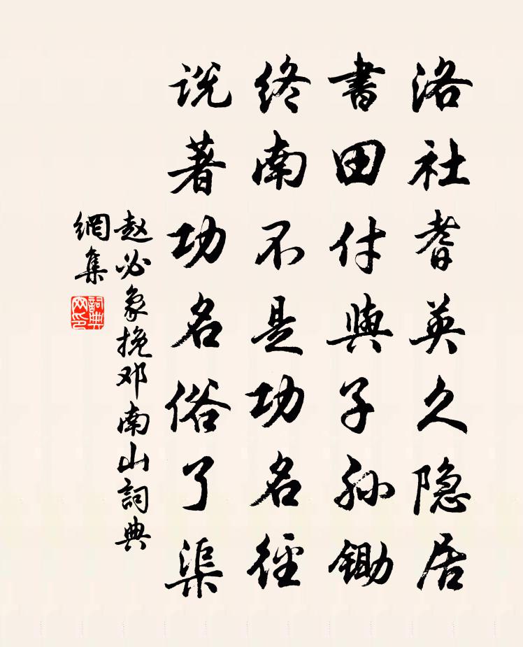 詩詞名句歷史字典書法欣賞書法字典國語詞典說文解字康熙字典古漢語字典標 題 作 者 詩 句 挽鄧南山作者:趙必象 朝代:宋代挽鄧南山原文洛社耆英久隱居,書田付與子孫鋤。終南不是功名徑,說著功名俗了渠。詩詞問答問:挽鄧南山的作者是誰?答:趙必象問:挽鄧南山寫於哪個朝代?答:宋代趙必象挽鄧南山書法欣賞挽鄧南山書法作品詩詞推薦送衛功曹赴荊南錢起〔唐代〕漢家仍用武,才子晚成名。惆悵江陵去,誰知魏闕情。碧雲愁楚水,春酒醉宜城。定想褰帷政,還聞坐嘯聲。飯飽晝臥戲作短歌陸游〔宋代〕為農得飯常半菽,出仕固應甘脫粟。藜羹自美何待糝,況復畏人嘲苜蓿。今年還東已八十,視聽雖存鬢先禿。安能正旦後一日陸游〔宋代〕七十今年是,連朝樂未休。比鄰更頌禱,親黨共遲留。羊映紅纏酒,花簪絳帕頭。從今日有喜,農事起西疇。夜文天祥〔宋代〕秋光連夜色,萬里客淒淒。落木空山杳,孤雲故國迷。衾寒霜正下,燈晚月平西。夢過重成夢,千門雞亂啼。繩金寺黎良知〔宋代〕懸崖結屋層層閣,眺遠開窗面面峰。雲起半天齊碧瓦,風生萬壑響長松。經從兩浙曾豐〔宋代〕渺渺秦航渡,茫茫夏蓋湖。地形東帶越,山勢右襟吳。勝負心徒熱,興亡骨並枯。古今姑棄置,一笑問歸途。謝人送常州草蟲扇楊萬里〔宋代〕生怕炎天老又逢,草蟲扇子獻奇功。還將多稼亭前月,卷盡西湖柳上風。蚱蜢翅輕塗翡翠,蜻蜓腰細滴猩紅。舊時詠竹二首蘇轍〔宋代〕南鄰竹甚茂,門巷不容賓。懸印君當往,囊金我患貧。翠旌稍亂起,犀角筍初勻。不惜圖書賣,端來作主人。送僧歸護國寺張師德〔宋代〕喜陪人傑論三乘,岩室經年鎖翠稜。六代有師傳法印,萬緣無象監心燈。赤城道遠明霞畫,瀑布聲寒月照冰。跡似寓寺八首張耒〔宋代〕錯落星河沒半空,江城悲角五更風。幽人夢斷西窗雨,背壁籠燈到曉紅。伏聞令公疾愈對見延英,因有賀詩遠封投獻薛逢〔唐代〕吉語云雲海外傳,令公疾愈起朝天。皇風再扇寰區內,人鏡重開日月邊。光啟四門通壽域,深疏萬頃溉情田。陪臣水龍吟(武寧瑞蓮)楊無咎〔宋代〕曉來雨歇風生,素商乍入鴛鴦浦。紅蕖翠蓋,不知西帝,神遊何處。羅綺叢中,是誰相慕,憑肩私語。似漢皋佩解賀新郎 壽劉時中五月二十又八日宋褧〔元代〕繡陌徑新雨。致昇平、五弦琴里,薰風吹戶。夏館深沉晨容好,寶鼎紅雲香霧。還又是、逋仙初度。疇昔驂鸞騎赤庚寅正月送羅季週遊學禾川楊萬里〔宋代〕眼邊相識蠶樣密,如子歲寒萬才一。我德西山子義山,老里一別堪三年。外舅陰功不知數,諸孫太半廊廟具。學文再赴襄陽,辱宣武相公貽詩,今用奉酬李逢吉〔唐代〕解韍辭丹禁,揚旌去赤墀。自驚非素望,何力及清時。又據三公席,多慚四老祠。峴山風已遠,棠樹事難追。江漢題東邨所藏宮錦圖王柏〔宋代〕後德相成帝業昌,不耽歌舞夸新妝。六宮婦式頒蠶事,職雅心耑清晝長。忽見雙娥理絲把,寬急對牽身勢強。輻輪謁金門·示知命弟黃庭堅〔宋代〕山又水,行盡吳頭楚尾。兄弟燈前家萬里,相看如夢寐。君似成蹊桃李,入 * 堂松桂。莫厭歲寒無氣味,餘生今次景琳錄事贈別韻范成大〔宋代〕放船鳴櫓便秦吳,送別空煩長者車。宿霧鎖山常冪冪,斷雲將雨忽疏疏。高城五嶺花深處,短棹三江木落初。賴得句趙庚夫〔宋代〕故人埋玉僧歸塔,獨聽疏鍾起暮愁。行東山下至南岩陸游〔宋代〕穿林了不厭崎嶇,邂逅幽懷得少攄。昔媿出山成小草,今知臨水羨游魚。呦呦馴鹿隨輕策,決決流泉入野渠。坐覺名句推薦鄉村四月閒人少,才了蠶桑又插田。翁卷《鄉村四月》 惡有釁,雖貴罰也。左丘明《國語·魯語·臧文仲請賞重館人》 薄倖郎君何日到,想自當初,莫要相逢好。施耐庵《蝶戀花·一別家山音信杳》 把吳鉤看了,欄桿拍遍,無人會,登臨意。辛棄疾《水龍吟·登建康賞心亭》 但願蒼生俱飽暖,不辭辛苦出山林。于謙《詠煤炭》 脈脈花疏天淡,雲來去、數枝雪。范成大《霜天曉角·梅》 曉寒料峭尚欺人,春態苗條先到柳。毛滂《玉樓春·己卯歲元日》 輕衫未攬,猶將淚點偷藏史達祖《夜合花·柳鎖鶯魂》 遇酒且呵呵,人生能幾何!韋莊《菩薩蠻·勸君今夜須沈醉》 別來不寄一行書。尋常相見了,猶道不如初。晁沖之《臨江仙·憶昔西池池上飲》