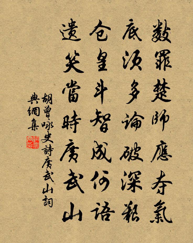 詩詞名句歷史字典書法欣賞書法字典國語詞典說文解字康熙字典古漢語字典標 題 作 者 詩 句 詠史詩廣武山作者:胡曾 朝代:唐代詠史詩廣武山原文數罪楚師應奪氣,底須多論破深艱。倉皇鬥智成何語,遺笑當時廣武山。詩詞問答問:詠史詩廣武山的作者是誰?答:胡曾問:詠史詩廣武山寫於哪個朝代?答:唐代問:詠史詩廣武山是什麼體裁?答:七絕胡曾詠史詩廣武山書法欣賞詠史詩廣武山書法作品注釋全唐詩:卷647-139詩詞推薦滿庭芳 贈周信等王丹桂〔元代〕貴賤由天,榮枯隨分,分明不在強圖。得之本有,失者本來無。謾使機關巧幸,勞神智、疲役形軀。痴迷客,蠅頭夜坐黃庚〔宋代〕世事等輕雲,蘧廬寄此身。青燈少年夢,白髮異鄉人。按劍驚山鬼,吞丹養穀神。黃庭重讀罷,吾得葆吾真。詩一首陳摶〔宋代〕華陰高處是吾宮,出即凌空跨曉風。台殿不將金鎖閉,來時自有白雲封。西崦方岳〔宋代〕西崦東岡取次行,倚松小立又詩成。山風溪月寶無價,牧笛樵歌畫有聲。半頃萊田供伏臘,一間茅屋老昇平。未知宜甫家有金鈴菊客未這識因代菊贈宜甫司馬光〔宋代〕主人倦邀客,寂寞委蒼苔。此日開無益,明年不復開。病中寄曾使君湖上曹勛〔宋代〕露曉紅幢綠蓋明,使君千騎會耆英。笙歌遞奏連雲上,荷芰傳香拂面清。遐想雅歡均四坐,欲尋幽夢下重成。負薪壽星明晁端禮〔宋代〕露濕晴花,散紅香清影,建章宮殿。玉宇風來,銀河雲斂,天外老人星現。向曉千官入,稱慶山呼鰲抃。鳳髓香飄表侄趙文鼎監稅傳才拙所定九品杜詩說正宗作龐謙孺〔宋代〕平生竭力參時句,久矣冥搜見機杼。豈惟蘊蓄徹遮欄,要使幽深盡呈露。君今學詩叩妙理,頗已具眼識精粗。他年長持經僧貫休〔唐代〕嘮嘮長夜坐,嘮嘮早起。杉森森,不見長,人聲續續如流水。摐金掙玉,吐宮咽徵。頭低草木,手合神鬼。日消三山村曉思於濆〔唐代〕開門省禾黍,鄰翁水頭住。今朝南澗波,昨夜西川雨。牧童披短蓑,腰笛期煙渚。不問水邊人,騎牛傍山去。春從天上來 廣陵冬夜,與松雲子論五音二變張翥〔元代〕還相為宮,犁然律呂之均,雅俗之應也。不覺漏下,月滿霜空,神情爽發。松雲子吹春從天上來曲,音韻淒遠。予臨川縣治古桂兩大株與葉潛仲鄔文伯飲花下趙汝鐩〔宋代〕雙桂相傳久,百年殊未衰。樹聯鋪葉密,根老著花遲。葩墜黏詩筆,香濃透酒卮。月中但孤影,安得兩安枝。韻令(碩人生日)程大昌〔宋代〕是男是女,都有官稱。孫兒仕也登。時新衣著,不待經營。寒時火櫃,春里花亭。星辰上履,我只喚卿卿。壽開八飲馬長城窟王炎〔宋代〕春風塞草青,胡兒區脫靜。秋風塞草黃,胡騎角弓勁。秦人驅丁夫,築城備強胡。城成有虧日,胡來無已時。哀笳玉蝴蝶李鼐〔宋代〕望處水寒雲繞,倚欄千里,澹蕩晴暉。夢燕門闌,和氣喜動簾幃。舞裀重、花明彩鳳,歌扇小、香暖金猊。漏聲遲雜詠五言八首劉克莊〔宋代〕埋向西陵里,千年不復晨。未知台上妓,歌舞樂何人。問卜崔塗〔唐代〕承家望一名,幾欲問君平?自小非無志,何年即有成。豈能長失路,爭忍學歸耕?不擬逢昭代,悠悠過此生。蝶戀花·兩岸月橋花半吐真德秀〔宋代〕兩岸月橋花半吐。紅透肌香,暗把遊人誤。盡道武陵溪上路。不知迷入江南去。先自冰霜真態度。何事枝頭,點點偈頌五十一首釋道沖〔宋代〕 * 眼,破沙盆。貴時傾國不換,賤時不直分文。不作貴,不作賤。分付石溪老子,共結佛祖深冤。賀新郎(送杜子野赴省)嚴仁〔宋代〕說到城南杜。盡風流、至今人號,去天尺五。家世聯翩蒼玉佩,自有文章機杼。看鸞鳳、九霄軒翥。文陣堂堂新得名句推薦相思相望不相親,天為誰春。納蘭性德《畫堂春·一生一代一雙人》 好問則裕,自用則小佚名《尚書·商書·仲虺之誥》 永豐柳,無人盡日飛花雪。張先《千秋歲·數聲鶗鴂》 當事者迷,旁觀者清。佚名《增廣賢文·下集》 能勝強敵者,先自勝者也。商鞅《商君書·畫策》 易樂者必多哀,輕施者必好奪。王通《中說·卷一·王道篇》 犬吠水聲中,桃花帶露濃。李白《訪戴天山道士不遇》 千山鳥飛絕,萬徑人蹤滅。柳宗元《江雪》 楚鄉飛鳥沒,獨與碧雲還。錢起《送夏侯審校書東歸》 治國常富,而亂國常貧。管仲《管子·治國》