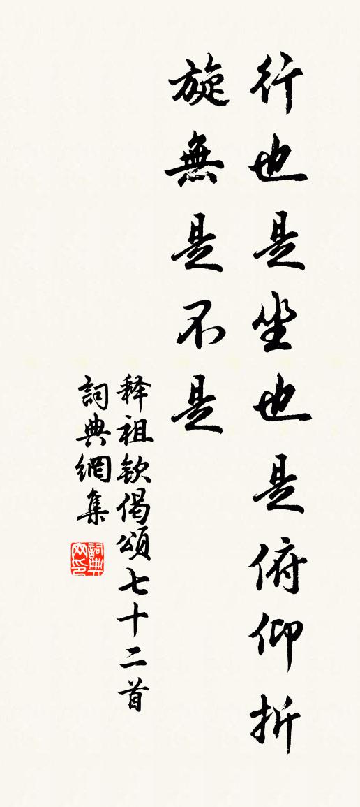 詩詞名句歷史字典書法欣賞書法字典國語詞典說文解字康熙字典古漢語字典標 題 作 者 詩 句 偈頌七十二首作者:釋祖欽 朝代:宋代偈頌七十二首原文行也是,坐也是。俯仰折旋,無是不是。詩詞問答問:偈頌七十二首的作者是誰?答:釋祖欽問:偈頌七十二首寫於哪個朝代?答:宋代釋祖欽偈頌七十二首書法欣賞偈頌七十二首書法作品詩詞推薦巴山李新〔宋代〕飛雲冉冉隔層巒,漲水茫茫失舊灣。自昔秋風悲宋玉,這回夜雨宿巴山。獨行雲嶠雙飛舄,誰置壺漿一解顏。世事騎過山村陳造〔宋代〕煙村面勢枕蒼山,一徑循山作屈蟠。入望高幢羅翠密,掛空匹練噀清寒。吟髭撚白迎風去,妝面駢紅倚戶看。頗似次韻仇仁近用韻見示五首方回〔宋代〕褒衣全覺近人輕,擊柝鳴鼙滿萬城。士氣欲如枯草死,文聲未見蟄雷驚。絳侯豈識長沙傅,秦宓能非棘子成。當復送周伯壽赴省二首項安世〔宋代〕陳薛非卿監,趙羅真吏兵。殿中尤給事,館下范先生。六士書難作,千懷子代傾。蒼生底時卿,切莫話歸耕。曲江感秋 五年作。白居易〔唐代〕沙草新雨地,岸柳涼風枝。三年感秋意,並在曲江池。早蟬已嘹唳,晚荷復離披。前秋去秋思,一一生此時。昔人絕句夏完淳〔明代〕扁舟明月兩峰間,千頃蘆花人未遠。縹緲蒼茫不可接,白雲空翠洞庭山。孫秀才下第暫還京口留別起居邀余和以贈行范祖禹〔宋代〕翔鸞戢翼下層空,南浦歸帆逐曉風。夢寐蘭陔清露白,嘯歌江國火雲紅。王畿結綬來無久,天漢乘槎去可通。莫為別兩絕邵雍〔宋代〕賞花高閣上,負約罪難回。若許將詩贖,何時不可陪。彈琴釋寶曇〔宋代〕一鼓薰風至自南,再行新月墮瑤簪。高山流水人猶在,笛弄梅花莫再三。書窗夏日朱繼芳〔宋代〕南風伊軋語窗扉,團扇無功白日遲。長恨老來方學易,自從春去不吟詩。蟲絲有力縈琴索,蛀粉無聲點墨池。偶出踏沙行 雪中山茶洪希文〔元代〕風掠寒條,雪封凍蕊。行人蟻凍荒崖里。千岩萬壑白皚皚,孤紅傑出真堪美。生類殲夷,芳心銷歇。玄冥漏*春生送林校書入山連文鳳〔宋代〕茫茫塵世厭風波,但把柴門掩薜蘿。朝野交遊能有幾,文章氣味已無多。收書且作林泉隱,洗硯間將歲月磨。後夜偈十三首釋慧空〔宋代〕雪峰禪,無星子,只見升堂打鼓。賺得大眾上來,近日山中有虎。長至令晨,顛言倒語。舟中見獵犬有感宋琬〔清代〕秋水蘆花一片明,難同鷹隼共功名。檣邊飯飽垂頭睡,也似英雄髀肉生。馮校書輓詩魏了翁〔宋代〕高志崢嶸局九州,直從人表著先籌。青囊書在鬼神泣,黃絹辭高冰雪羞。槐里但知矜折角,蘭台無復問長頭。玉棺木蘭花(與諸人泛溪作)葛勝仲〔宋代〕木闌乾外池光闊。午夜喬林迷岸樾。掠船涼吹起青苹,縈水歌聲欺白雪。檀郎響趁紅牙節。胡語嘈嘈仍切切。人生忍笑韓偓〔唐代〕宮樣衣裳淺畫眉,晚來梳洗更相宜。水精鸚鵡釵頭顫,舉袂佯羞忍笑時。水淺舟滯解悶十絕鄭獬〔宋代〕柳枝拂水萬千縷,水去柳枝還卻回。不似桃花愛飄蕩,等閒流出碧溪來。寄范清老二絕孔武仲〔宋代〕高平處士節尤孤,門掩江邊徑欲蕪。詩好未窺新歲集,酒醇猶憶去年壺。江湖偉觀葉茵〔宋代〕此地舊寒碧,留題護竹君。窗虛不礙月,壁老易生雲。一水東西隔,兩山南北分。未堪低著眼,世事正紛紛。名句推薦二十四橋仍在,波心蕩、冷月無聲。姜夔《揚州慢·淮左名都》 林中有奇鳥,自言是鳳凰。阮籍《詠懷八十二首·其七十九》 白草黃沙。月照孤村三兩家。蔣氏女《減字木蘭花·題雄州驛》 見人惡,即內省。有則改,無加警。李毓秀《弟子規·信》 孤芳一世,供斷有情愁,消瘦損,東陽也,試問花知否曹組《驀山溪·梅》 失意還獨語,多愁只自知。張籍《薊北旅思 / 送遠人》 南山截竹為觱篥,此樂本自龜茲出李頎《聽安萬善吹觱篥歌》 萬里歸來顏愈少,微笑,笑時猶帶嶺梅香。蘇軾《定風波·南海歸贈王定國侍人寓娘》 美人慵翦上元燈,彈淚倚瑤瑟。朱敦儒《好事近·春雨細如塵》 黃昏庭院柳啼鴉,記得那人,和月折梨花。陳亮《虞美人·東風盪颺輕雲縷》