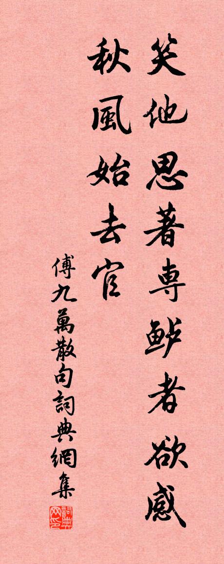詩詞名句歷史字典書法欣賞書法字典國語詞典說文解字康熙字典古漢語字典標 題 作 者 詩 句 句作者:傅九萬 朝代:宋代句原文笑他思著專鱸者,欲感秋風始去官。詩詞問答問:句的作者是誰?答:傅九萬問:句寫於哪個朝代?答:宋代傅九萬句書法欣賞句書法作品詩詞推薦北山值雪偶成衛宗武〔宋代〕艮象涵萬有,佳趣備四時。此行屬寒沍,喜遇臘雪飛。琤琤初集霰,粲粲紛葳蕤。奔騰漸成陣,勢作龍鳳馳。森森漁父詞五首釋子淳〔宋代〕鶴髮漁翁歲莫論,桑田幾變爾常存。紅蓼岸,荻花村,水月虛明兩不痕。百鍊鏡-辨皇王鑑也白居易〔唐代〕百鍊鏡,鎔范非常規,日辰處所靈且祇。江心波上舟中鑄,五月五日日午時。瓊粉金膏磨瑩已,化為一片秋潭水。湖嶼李石〔宋代〕我昔泛洞庭,白波大如屋。水天兩相際,渺渺浸坤軸。小舟掀簸中,嘔眩篷底伏。忽然得島嶼,便欲縋船宿。西歸游將軍岩胡寅〔宋代〕初識後亭山,一賞北岩秀。更聞將軍隱,飛策飛雲岫。何為英烈姿,石壁寄門竇。和非馬力竭,依險聊自救。無乃袷饗太廟佚名〔宋代〕靈其顧思,降福來萃。天子受之,飴爾在位。神既享矣,福既均矣。豆斯入矣,禮之成矣。經從兩浙曾豐〔宋代〕渺渺秦航渡,茫茫夏蓋湖。地形東帶越,山勢右襟吳。勝負心徒熱,興亡骨並枯。古今姑棄置,一笑問歸途。嘉興天慶觀梁朝檜錢時〔宋代〕五季干戈滿地訌,山川草木亦酸風。如何偃蹇梁朝檜,獨壽中吳雨露中。送張叔毅北歸強至〔宋代〕公子姓張天上有,少年如誼雒陽無。滿編秀氣同歸楚,後夜文星不照吳。雲密蛟龍閒未試,霜寒鴻雁急相呼。知君雞丁謂〔宋代〕戒旦知霄漏,棲塒識晚陽。花冠誠可愛,芥羽亦難防。祝祝時求友,咬咬獨擅場。自當陳玉質,寧止化陳倉。春盡與友人入裴氏林探漁竿溫庭筠〔唐代〕一徑互紆直,茅棘亦已繁。晴陽入荒竹,曖曖和春園。倚杖息慚倦,徘徊戀微暄。歷尋嬋娟節,剪破蒼筤根。地閉送馮貫道之東川轉而之行在張嵲〔宋代〕秋風來萬里,草木日夜凋。屬茲憀栗時,執別在今朝。亂離多苦辛,況乃道路窮。若人抱奇節,勁氣千雲霄。結交觀音大士贊釋普岩〔宋代〕草木丘陵,風雷雲氣。具足妙相尊,證入三摩地。萬象森羅從鼎沸。登上嶺游黃山陳天麟〔宋代〕朝陽滉漾水朦朧,曉煙橫抹天微風。三十六峰不著色,點綴淡墨排秋空。小山連延大山倨,林深無人但云樹。平生春閨怨效唐才調集體張紹文〔宋代〕楊柳和煙翠不分,東風吹雨上離樽。鵾弦調急難藏恨,燕子樓高易斷魂。錦子書成春夢遊遠,玉壺淚滿夜燈昏。馬題蔣億極目樓洪邁〔宋代〕樓下高低萬井煙,樓頭極目思悠然。山圍風景無餘地,戶接星河不盡天。閩嶺百重通北路,楚江千里系東船。客星宋頌九首聖神石介〔宋代〕聖機神謀,天秘地藏,風行雷動。旦秣我馬,夕取其疆。寄董卿嘉榮十韻杜甫〔唐代〕聞道君牙帳,防秋近赤霄。下臨千雪嶺,卻背五繩橋。海內久戎服,京師今晏朝。犬羊曾爛熳,宮闕尚蕭條。猛將【中呂】滿庭芳_山中雜興二張可久〔元代〕山中雜興二首人生可憐,流光一瞬,華表千年。江山好處追游遍,古意翛然。琵琶恨青衫樂天,洞簫寒赤壁坡仙。贈秘書王監丞文天祥〔宋代〕君不見秘書外監賀放翁,鏡湖一曲高清風。又不見太子師傅兩疏氏,東門祖帳羅群公。人生晚節良不易,頹波下下名句推薦繁采寡情,味之必厭。劉勰《文心雕龍·情采》 戒惕弗棄,智勇弗顯。來俊臣《羅織經·事上卷第二》 知君獨坐青軒下,此時結念同所懷。李白《早秋單父南樓酬竇公衡》 月明星稀,烏鵲南飛。繞樹三匝,何枝可依?曹操《短歌行》 人悄悄,簾外月朧明。岳飛《小重山·昨夜寒蛩不住鳴》 萬里橋西一草堂,百花潭水即滄浪。杜甫《狂夫》 宣和舊日,臨安南渡,芳景猶自如故。劉辰翁《永遇樂·璧月初晴》 美功不伐,貴位不善佚名《孔子家語·弟子行》 君子不蔽人之美,不言人之惡。韓非及後人《韓非子·內儲說上七術》 巧媳婦煮不得沒米粥馮夢龍《警世通言·卷十二》