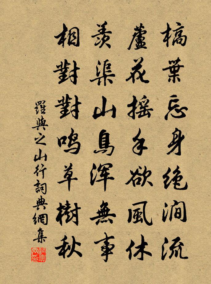 詩詞名句歷史字典書法欣賞書法字典國語詞典說文解字康熙字典古漢語字典標 題 作 者 詩 句 山行作者:羅與之 朝代:宋代山行原文槁葉忘身絕澗流,蘆花搖手欲風休。羨渠山鳥渾無事,相對對鳴草樹秋。詩詞問答問:山行的作者是誰?答:羅與之問:山行寫於哪個朝代?答:宋代羅與之山行書法欣賞山行書法作品詩詞推薦十二月二十九夜大雪三首楊公遠〔宋代〕六出霏霏餞歲華,終宵撩亂撲窗紗。未言造化工夫巧,且看乾坤景角奢。□□□□□□□,□□□□□□□藥。明鹽倉作呈叔能同官葛立方〔宋代〕平生懶作子公書,俯首銓曹一紀余。第有神馳招隱館,久無夢到承明廬。文字真宜覆醬瓿,技能只合服鹽車。清才次韻富季申主簿梅花陳與義〔宋代〕東風知君將出遊,玉人迥立林之幽。欹牆數苞乃爾瘦,中有萬斛江南愁。君喔新詩我聽瑩,句里無塵春色靜。人人雨中過湖孫應時〔宋代〕煙雨平湖棹歸,清秋休作楚詞悲。關心千里蓴鱸興,轉眼一年橘柚時。好景何妨間處得,勝懷應少欲人知。相過拊贈滕宗諒呂岩〔唐代〕華州回道人,來到岳陽城。別我游何處,秋空一劍橫。甜羹之法以菘菜山藥芋萊菔雜為之不施醯醬山陸游〔宋代〕老住湖邊一把茆,時沽村酒具山殽。年來傳得甜羹法,更為吳酸作解嘲。贈莊賢良招隱樓三首項安世〔宋代〕樓居入闤闠,不受闠中塵。闠中豈無數,無此招隱人。昔者小山篇,非我招隱意。吾今已隱矣,更欲招同志。同志次韻前人為人誣告受羊陳著〔宋代〕冰櫱肝腸無詭隨,彼嚚何物妄相持。夢魂不到菜園破,行止肯教芒屩知。安用舌埋防異日,空聞內袒有當時。從他和德粹三絕朱槔〔宋代〕心賞南樓一味涼,波光山影豐藜床。莫言體國非吾事,好夢不能千里長。齊後圖唐寅〔明代〕百二關河狼虎秦,連環難解獻高臣。若非縴手抽刀斬,應笑山東後有人。過金陵謁吳大帝廟袁陟〔宋代〕人苦曹瞞虐,天悲駐祿終。山河分鼎峙,氣象發江東。一旦墟京洛,彌年豢幼沖。炎精竟灰燼,紫蓋出艨艟。長策八聲甘州(為遁齊壽)黃機〔宋代〕問訊翁、底事到人間,人間足嬉遊。向文邊書意,詩邊著語,□滿南州。逸韻高情總似,野水盪孤舟。所未能忘者子由作二頌頌石台長老問公手寫蓮經字如黑蟻蘇軾〔宋代〕眼前擾擾黑蚍蜉,口角霏霏白唾珠。要識吾師無礙處,試將燒卻看嗔無。眼睛心地兩虛圓,脅不沾床二十年。誰信張功父索余近詩,余以南海、朝天二集示之,楊萬里〔宋代〕作者於今星樣稀,淒其望古駟難追。空棄孤竹陶元亮,玉佩瓊琚杜拾遺。自笑金秋如嬾婦,可能擊鼓和馮夷。報章和劉後村梅花百詠方蒙仲〔宋代〕夜色朝光兩莫知,樹間但見白差差。江南到處名姝少,一律前村雪裡詞。頌古十六首釋明辯〔宋代〕我手何似佛手,黃龍鼻下無口。當時所見顢頇,至今百拙千醜。山有扶蘇佚名〔先秦〕山有扶蘇,隰有荷華。不見子都,乃見狂且。山有喬松,隰有游龍,不見子充,乃見狡童。瓶笙詩並引蘇軾〔宋代〕庚辰八月二十八日,劉幾仲餞飲東坡。中觴聞笙簫聲,杳杳若在雲霄間,抑揚往返,粗中音節。徐而察之,則出於桓靈時童謠佚名〔兩漢〕舉秀才,不知書。舉孝廉,父別居。寒素清白濁如泥,高第良將怯如雞。丙寅十四首效韋蘇州黃庭堅〔宋代〕少小尚狷介,與人常不款。置身稍雍容,遇酒輒引滿。自是鶴長足,難齊鳧脛短。名句推薦吳洲春草蘭杜芳,感物思歸懷故鄉。宋之問《寒食江州滿塘驛》 小池寒綠欲生漪,雨晴還日西。秦觀《阮郎歸·春風吹雨繞殘枝》 歲月無多人易老,乾坤雖大愁難著吳潛《滿江紅·豫章滕王閣》 皮之不存,毛將安傅?左丘明《左傳·僖公·僖公十四年》 千羊之皮不如一狐之腋。司馬遷《史記·趙世家》 雪後燕瑤池,人間第一枝。趙令畤《菩薩蠻·春風試手先梅蕊》 日日雨不斷,愁殺望山人。賈島《望山》 惶恐灘頭說惶恐,零丁洋里嘆零丁。文天祥《過零丁洋》 宴爾新婚,以我御窮。佚名《谷風》 貧賤非辱,貧賤而諂求於人者為辱王永彬《圍爐夜話·第三一則》