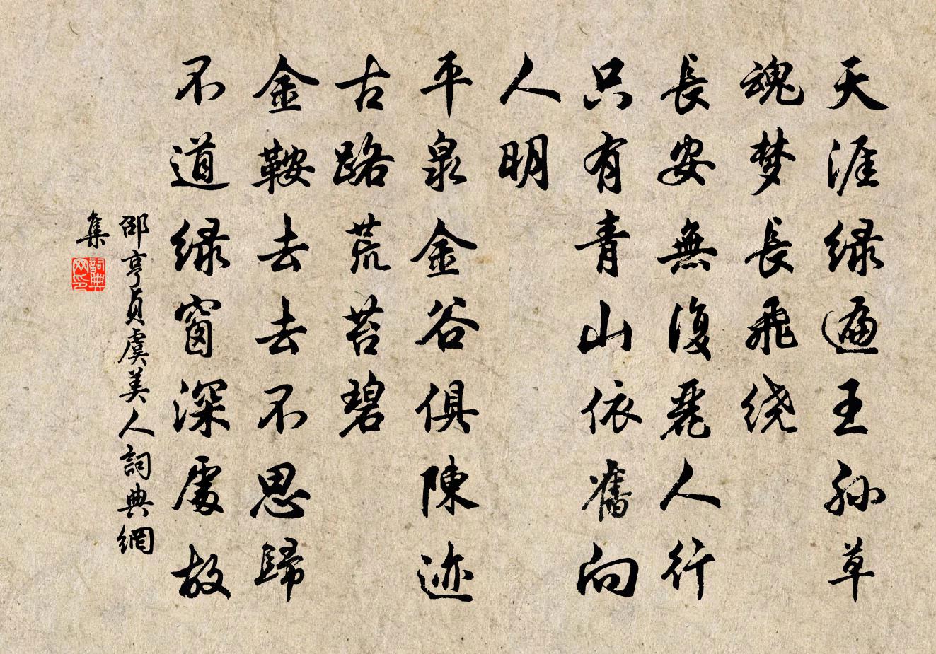 詩詞名句歷史字典書法欣賞書法字典國語詞典說文解字康熙字典古漢語字典標 題 作 者 詩 句 虞美人作者:邵亨貞 朝代:元代虞美人原文天涯綠遍王孫草。魂夢長飛繞。長安無復麗人行。只有青山,依舊向人明。平泉金谷俱陳跡。古路荒苔碧。金鞍去去不思歸。不道綠窗深處故詩詞問答問:虞美人的作者是誰?答:邵亨貞問:虞美人寫於哪個朝代?答:元代問:虞美人是什麼體裁?答:詞邵亨貞虞美人書法欣賞虞美人書法作品詩詞推薦送姚庭珪杜荀鶴〔唐代〕脫衣將換酒,對酌話何之。雨後秋蕭索,天涯晚別離。人生無此恨,鬢色不成絲。未得重相見,看君馬上詩。瑞芝堂曾豐〔宋代〕太空生兩儀,群有函一氣。飛走動植中,往往有常類。凡與常類殊,疑類復疑異。縉雲開國公,來攝飛挽事。乘閒逍遙詠宋太宗〔宋代〕道妙懷真紀異常,人間天上若存亡。潛機物類多中覷,納取虛無定久長。碧落遨遊歸洞府,黃金不買自馨香。參同再和三篇蘇頌〔宋代〕莫嘆潛鱗久在池,已喧才譽滿朝知。雄辭自可吞雲夢,博識應能對仲師。榮辱早諳真採選,競謙不校古儒棋。使還桃花菊朱翌〔宋代〕菊花忽作桃花面,放眼難看九月黃。花不見桃惟見菊,又將紅雨學啼妝。和張太中館於西湖韓維〔宋代〕湖榭從來與眾同,況於清晏奉群公。驅車即日趨翔鳳,就館初寒聽過鴻。霜雪滿髯仍自壯,珠璣落筆不知窮。太平寓陳雜詩十首張耒〔宋代〕開門無客來,永日不冠履。客至我老懶,投刺輒復去。端成兩相忘,因得百無慮。故人在旁郡,書信不能屢。興哀郊廟歌辭。德明興聖廟樂章。興聖酌獻佚名〔唐代〕閟宮靜謐,合樂周張。泰奠始獻,百末重觴。震澹存誠,庶幾迪嘗。遙源之祚,天漢靈長。山中釋文珦〔宋代〕每說遠公棲隱處,亂雲□歌石難通。不是樵夫相指引,無雲得到此山中。登瀟灑亭錢可則〔宋代〕有緣結得南山境,瀟灑亭高最可人。此景古今吟不盡,熙熙客里且行春。宮詞張公庠〔宋代〕清秋皓月正嬋娟,的歷華星亦偏天。欲上層樓須穩步,不同平地有金蓮。呈莫大猷令趙蕃〔宋代〕入境能知政,昔聞今信然。吾行萬安道,頗識令君賢。阡陌東西隔,人家遠近連。針青秧出水,穗長麥搖煙。犬吠寄肯體丘葵〔宋代〕三年雲臥一身閒,惟有君來蕭寺間。既是君平為世棄,不妨巢父掉頭還。平生學道魚千里,晚歲參禪豹一班。惟有后土廟瓊花詩王禹偁〔宋代〕誰移琪樹下仙鄉,二月輕冰八月霜。若使壽陽公主在,自當羞見落梅妝。朝丹霞高似孫〔宋代〕轉璇樞兮上亭亭,一語契兮驚群星。味清淨兮不可經,玄復玄兮發新硎。三衢道中崔復初〔宋代〕一客在他鄉,行程一月強。雲寒山欲暗,日短道偏長。楓葉嫣如醉,梅花謝亦香。誰家砧杵急,回首感征裳。連日與王忠玉張全翁游西湖訪北山清順道潛二蘇軾〔宋代〕北山非自高,千仞付我足。西湖亦何有,萬象生我目。雲深人在塢,風靜回響谷。與君皆無心,信步行看竹。竹間和徐子融韻陳文蔚〔宋代〕自憐涉世每多艱,事一縈心或厭煩。近日工夫可所似,有時慚愧夢中閒。多麗李清照〔宋代〕小樓寒,夜長簾幕低垂。恨瀟瀟[1]無情風雨,夜來揉損瓊肌。也不似貴妃醉臉,也不似孫壽愁眉。韓令偷香,次韻吉老十小詩黃庭堅〔宋代〕茵席絮剪繭,枕囊收決明。南風入晝夢,起坐是松聲。名句推薦話須通俗方傳遠,語必關風始動人。馮夢龍《警世通言·卷十二》 金柳搖風樹樹,系彩舫龍舟遙岸。柳永《破陣樂·露花倒影》 金井梧桐秋葉黃,珠簾不捲夜來霜。王昌齡《長信怨》 今年元夜時,月與燈依舊。歐陽修《生查子·元夕》 一年好景君須記,最是橙黃橘綠時。蘇軾《贈劉景文 / 冬景》 古戍蒼蒼烽火寒,大荒沈沈飛雪白。李頎《聽董大彈胡笳聲兼寄語弄房給事》 愛民者強,不愛民者弱荀子《荀子·議兵》 去年夜半橫江夢,倚危檣,參差曾賦劉辰翁《桂枝香· * 人去》 嘆隙中駒,石中火,夢中身。蘇軾《行香子·述懷》 庸德之行,庸言之謹;有所不足,不敢不勉子思《中庸·第十三章》