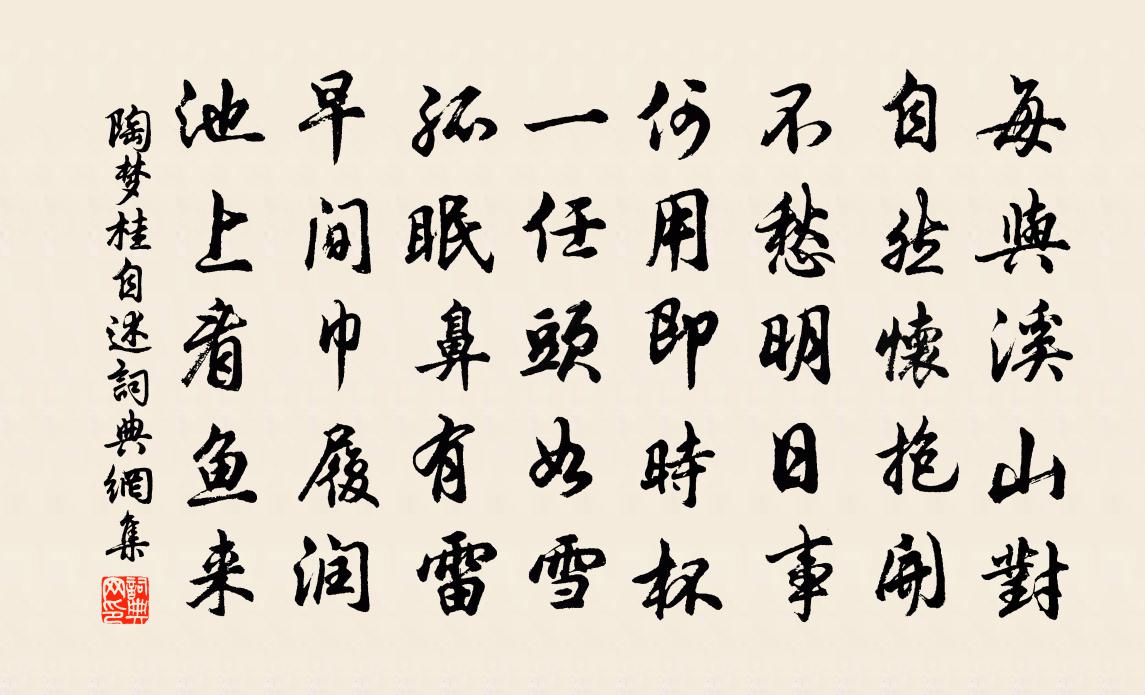 詩詞名句歷史字典書法欣賞書法字典國語詞典說文解字康熙字典古漢語字典標 題 作 者 詩 句 自述作者:陶夢桂 朝代:宋代自述原文每與溪山對,自然懷抱開。不愁明日事,何用即時杯。一任頭如雪,孤眠鼻有雷。早間巾履潤,池上看魚來。詩詞問答問:自述的作者是誰?答:陶夢桂問:自述寫於哪個朝代?答:宋代陶夢桂自述書法欣賞自述書法作品詩詞推薦李宣叔秘丞遺川牋及粉紙二軸梅堯臣〔宋代〕蜀人搗玉屑,楚客調金粉。制牋君有贈,草疏我無蘊。宜書楊雄辭,莫寫屈原憤。誰識此意微,曾非事搖吻。送王龜齡著作赴會稽大宗丞陸游〔宋代〕有越踰千載,何人不宦遊?向來惟一范,真足壯吾州。高躅今誰繼,先生獨再留。豋堂吊興廢,想像氣橫秋。晝倦楊萬里〔宋代〕睡眼蒙松倦日長,卻拋詩卷步迴廊。狸奴桑自雙雙戲,忽見人來走似獐。菊連文鳳〔宋代〕不用移春檻,西風滿客車。行行無長物,粲粲只黃花。晚色裝秋重,寒香引霧斜。輦來尊俎處,有酒不須余。逢曹子敬知錄三首董嗣杲〔宋代〕相逢愁醉霅溪西,老卻陳思七步詩。二十年前親擢第,孤忠曾際穆陵知。至後方回〔宋代〕三歷推周正,今當七袠開。不應嫌老迫,更用著愁催。酒竭傾渾滓,爐殘戀暖灰。故園歸去好,移樹及春栽。蝶戀花葉夢得〔宋代〕薄雪消時春已半。踏遍蒼苔,手挽花枝看。一縷遊絲牽不斷。多情更覺蜂兒亂。盡日平波回遠岸。倒影浮光,卻記寄題張子登遂勤齋曾豐〔宋代〕一字於吾補不曾,詩書況味冷如冰。誰家以此為長策,不把其它易短檠。鐘鼎軒裳眼應白,余猶要得聖賢力。意誠嘉禾頌七章章四句吳泳〔宋代〕翼翼嘉禾,在梁之畝。九穗離離,實栗實秀。句白居易〔唐代〕慈恩塔下題名處,十七人中最少年。 寄顏一齊閣內寂室方氏釋慧性〔宋代〕即心即佛沒誵訛,不動舌頭意氣多。打破虛空行活路,夫妻撫掌笑呵呵。游洞霄宮黃常吉〔宋代〕山鎖清溪溪鎖峰,溪光山色兩怡融。松枝點滴衣夾雨,雲葉飄揚岩際風。玉室金堂端好坐,石壇乳竇自相通。我生十報恩馬鈺〔元代〕山侗十願報師恩。劈碎金枷玉*情。久視門中修久視,長生路上得長生。昏昏默默澄澄湛,杳昔冥冥淨淨清。鄉亮晚渡黃河駱賓王〔唐代〕千里尋歸路,一葦亂平源。通波連馬頰,迸水急龍門。照日榮光淨,驚風瑞浪翻。棹唱臨風斷,樵謳入聽喧。岸迥贈張伯常之郢見過因話荊楚故事仍貺佳什曾鞏〔宋代〕一見心親十載前,相望南北久茫然。喜傾白 * 文酒,重訪清江下瀨船。志大肯同悲抱璞,識高寧許笑求田。已闚賀廣東黃漕生辰六絕曾豐〔宋代〕博落山中黃子楊,少從李生受仙方。道成初試飛升步,引手蟾宮折桂香。井李嶠〔唐代〕玉甃談仙客,銅台賞魏君。蜀都宵映火,杞國旦生雲。向日蓮花淨,含風李樹薰。已開千里國,還聚五星文。穿珠節劉光祖〔宋代〕往日房陵憐逐客,物情不覺在天涯。十年來作六州長,四海共知雙鬢華。封內半為故敵踐,路傍時問野人家。京山送項平甫教授之成都陳造〔宋代〕昔人石穴命西蜀,豈知桃華胥隱腹。詩人昔吟蜀道難,何曾錦城負物看。平時風物今猶故,井絡坤維神所護。漢官沒了期歌錢鏐〔唐代〕沒了期,沒了期,營基才了又倉基。沒了期,沒了期,春衣才了又冬衣。名句推薦記取西湖西畔,正暮山好處,空翠煙霏。蘇軾《八聲甘州·寄參寥子》 休說鱸魚堪膾,盡西風,季鷹歸未?辛棄疾《水龍吟·登建康賞心亭》 吳姬越艷楚王妃,爭弄蓮舟水濕衣。王昌齡《採蓮曲二首》 門有車馬客,駕言發故鄉。陸機《門有車馬客行》 良辰當五日,偕老祝千年。權德輿《端午日禮部宿齋有衣服彩結之貺以詩還答》 猶有桃花流水上,無辭竹葉醉尊前。劉禹錫《憶江南·春去也》 哀莫大於心死。莊子《莊子·外篇·田子方》 寫不了相思,又蘸涼波飛去。朱彝尊《長亭怨慢·雁》 是非成敗轉頭空。楊慎《臨江仙·滾滾長江東逝水》 童子柳陰眠正著,一牛吃過柳陰西。楊萬里《桑茶坑道中》