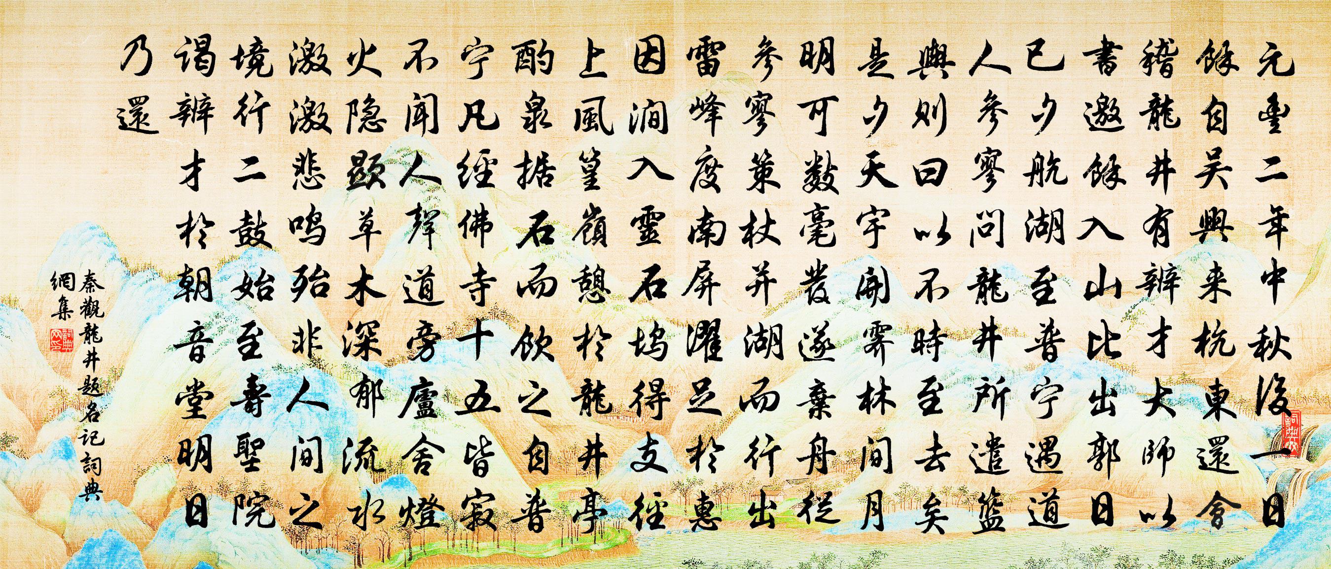 《淮海集》中另有一篇《游龍井記》,也是元豐二年所作。文中著重敘述有關龍井的文獻記載和傳說,解釋風篁嶺為什麼多泉水,對所謂在龍井求雨有靈也發表了看法。比較起來,《龍井題名記》以入山訪友為線索,具體地記述了出郭、渡湖、穿林、登山的行蹤,描寫了月下西湖山林的景物,“游”的味道顯然濃一些。雖然這是一篇遊記散文,但對景物的細緻觀察與描繪,以及善於創造清幽的氣氛,同樣也體現了詞人秦觀的氣質和藝術特色。