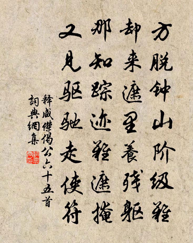 詩詞名句歷史字典書法欣賞書法字典國語詞典說文解字康熙字典古漢語字典標 題 作 者 詩 句 偈公六十五首作者:釋鹹傑 朝代:宋代偈公六十五首原文方脫鐘山階級難,卻來遮里養殘軀。那知蹤跡難遮掩,又見驅馳走使符。詩詞問答問:偈公六十五首的作者是誰?答:釋鹹傑問:偈公六十五首寫於哪個朝代?答:宋代釋鹹傑偈公六十五首書法欣賞偈公六十五首書法作品詩詞推薦解佩令 贈馬鈺王哲〔元代〕扶風宜甫,聽余教旨。你從前、入道未是。終有洪禧,舊交朋、陸山後至。一一須、聽他玄理。山頭休去,此中居法華寺上方題江上人禪空皎然〔唐代〕路入松聲遠更奇,山光水色共參差。中峰禪寂一僧在,坐對梁朝老桂枝。郊廟歌辭。周郊祀樂章。福順樂佚名〔唐代〕昊天成命,邦國盛儀。多士齊列,六龍載馳。壇升泰一,樂奏鹹池。高明祚德,永致昌期。頌證道歌證道歌釋印肅〔宋代〕住相布施生天福,不用贊龜並買卜。分毫不贈自家修,如影隨形皆具足。小師智廣請贊釋了惠〔宋代〕澤廣藏山,理能伏豹。父既不慈,子亦不孝。吉凶影象自分明,不用燒香求卦兆。滿井遊記袁宏道〔明代〕燕地寒,花朝節後,余寒猶厲。凍風時作,作則飛沙走礫。侷促一室之內,欲出不得。每冒風馳行,未百步輒返。偈頌六十五首釋普濟〔宋代〕臘極嚴寒,凍破泥團。不可默會,不可形言。雞上樹,鴨下水,明朝更獻楚王看。婺州和陸諫議將赴闕懷陽羨山居韋莊〔唐代〕望闕路仍遠,子牟魂欲飛。道開燒藥鼎,僧寄臥雲衣。故國饒芳草,他山掛夕暉。東陽雖勝地,王粲奈思歸。閒閒公為上清宮道士寫經並以所養鵝群付之諸王洋〔宋代〕會稽筆法老無塵,今代閒閒是後身。只有愛鵝緣已盡,舉群還付和來人。月上瓜洲·寓烏夜啼南徐多景樓作張輯〔宋代〕江頭又見新秋。幾多愁。塞草連天何處、是神州。英雄恨,古今淚,水東流。惟有漁竿明月、上瓜洲。和僉事夾谷之寄韻方逢辰〔宋代〕夫子說周易,肇開太極分。及乎作春秋,下逮西狩麟。混辟至決裂,堅冰致習馴。三皇何皞皞,五帝何紛紛。卓哉月夜泛舟李流謙〔宋代〕苦雨毛邊日夜,毛佳月遭薄毛蝕。晚風散積靄,水天忽改碧。江皋放幽步,露下襟袂濕。劃然湖海興,如驥不受勒頌古十五首釋慧遠〔宋代〕換捶胸明哭老爺,棺材未出死屍斜。不如掘地深埋卻,管取來年吃嫩茄。飲馬長城窟行曹勛〔宋代〕漢馬飲長城,匈奴空塞北。東胡與烏丸,先驅出絕哉。月氏合康居,受詔發疎勒。右校羅天山,左山林胡國。嫖姚范參政自建康得資政宮祠六詩寄呈趙蕃〔宋代〕細思不是乞身難,政為貧賢不放閒。奏疏比聞頻叩闕,詔恩今見許還山。蝶戀花秦觀〔宋代〕金鳳花開紅落砌。簾卷斜陽,雨後涼風細。最是人間佳景致。小樓可惜人孤倚。蛺蝶飛來花上戲。對對飛來,對對送潘叔昌主教清湘姜特立〔宋代〕醖藉金閨客,風流粉署郎。文嘗追屈賈,身合到瀟湘。經術東萊學,才名上國光。遐方豈淹泊,雲路看騰驤。胥山釋行海〔宋代〕子胥山上噪群烏,舊日英靈在此無。臣節已虧因撻楚,兵籌雖用奈亡吳。雲屯灌木疑烽戍,石列平城設陣圖。只可曉發詩何遜〔南北朝〕早霞麗初日。清風渭薄霧。水底見行雲。天邊看遠樹。且望{氵公}泝劇。暫有江山趣。疾兔聊復起。爽地豈能賦西江月姬翼〔元代〕巨細洪纖在在,飛潛動植芸芸。乾坤升降不停輪。借問誰為轉運。妙理周行獨立,真君莫測冥存。一針一草盡渾淪名句推薦萬物並育而不相害。道並行而不相悖。子思《中庸·第三十章》 為惡而畏人知,惡中猶有善路;為善而急人知,善處即是惡根。洪應明《菜根譚·概論》 白雲初下天山外,浮雲直向五原間。盧思道《從軍行》 念故人,千里至此共明月。寇準《踏莎行·寒草煙光闊》 商人重利輕別離,前月浮梁買茶去。白居易《琵琶行 / 琵琶引》 溪壑可盈,志欲無滿。姚察、姚思廉《梁書·列傳·卷五十三》 歲華向晚愁思,誰念玉關人老?蔡挺《喜遷鶯·霜天秋曉》 位卑未敢忘憂國,事定猶須待闔棺。陸游《病起書懷》 浪花有意千里雪,桃花無言一隊春。李煜《漁父·浪花有意千里雪》 一種青山秋草里,路人唯拜漢文陵許渾《途經秦始皇墓》