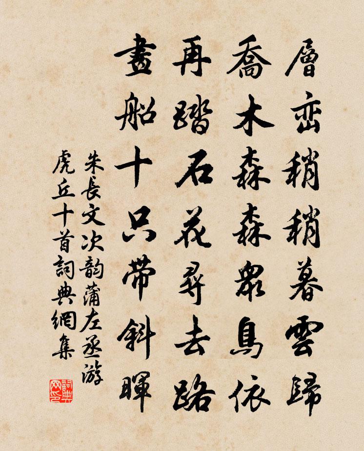 詩詞名句歷史字典書法欣賞書法字典國語詞典說文解字康熙字典古漢語字典標 題 作 者 詩 句 次韻蒲左丞游虎丘十首作者:朱長文 朝代:唐代次韻蒲左丞游虎丘十首原文層巒稍稍暮雲歸,喬木森森眾鳥依。再踏石花尋去路,畫船十隻帶斜暉。詩詞問答問:次韻蒲左丞游虎丘十首的作者是誰?答:朱長文問:次韻蒲左丞游虎丘十首寫於哪個朝代?答:唐代朱長文次韻蒲左丞游虎丘十首書法欣賞次韻蒲左丞游虎丘十首書法作品詩詞推薦謝劉文伯惠好翁牋舒岳祥〔宋代〕春膏夸瑩淨,雲母斗輕明。吾子誠不俗,老夫安用名。雖非時態尚,猶見故人情。雅興因君動,新吟恁幾成。鴛鴦湖棹歌 之六十朱彝尊〔清代〕九里橋西落照銜,櫻桃初熟鳥爭鵮。須知美酒烏程到,遙見新塍一片帆。無夢令馬鈺〔元代〕物外洞天金雨。澆溉九還之數。猿馬兩澄澄,自是性停命住。命住。命住。產個胎仙飛舉。江陵第二十四文天祥〔宋代〕聞說江陵府,今又降元戎。甲外控鳴鏑,肩輿強老翁。以予與斯遠倡酬詩一卷寄錢伯同運使郎中二首趙蕃〔宋代〕公作廣信牧,我為辰陽掾。長沙趣歸程,臨汝甫再見。我今華岳祠,公乘江東傳。雖能遞尺書,未易重會面。錢晁春草碧/番槍子万俟詠〔宋代〕又隨芳緒生,看翠霽連空,愁遍征路。東風裡,誰望斷西塞,恨迷南浦。天涯地角,意不盡、消沈萬古。曾是送別歸將范成大〔宋代〕輿不濟兮中河,日欲暮兮情多。子蘭橈兮蕙棹,願因子兮凌波。眢壑兮以漁,周落兮以驅。驪龍兮飛度,郊之麟兮江城子葉夢得〔宋代〕碧潭浮影蘸紅旗。日初遲。漾晴漪。我欲尋芳,先遣報春知。盡放百花連夜發,休更待,曉風吹。滿攜尊酒弄繁枝山寺陳宓〔宋代〕疏林漏曉日,修竹起寒風。鐘鼓催朝暮,千年如此同。游溫湯李流謙〔宋代〕丹雛振翰棲佛屋,蛟吻吐泉供客浴。東華夢破軟紅飛,不肯隨人到岩谷。扣欄投餌魚群喜,一鱗圉圉獨去之。萬里吊朱給事李復〔宋代〕筮仕西州佐邑時,高才不厭簿書卑。清修與眾初難合,真節當朝晚始知。諫苑塵埃多舊藁,佛宮粉繪有生祠。與君賀皇太子九月四日生辰四首楊萬里〔宋代〕代邸躬仁儉,湯孫世聖賢。誰雲無二日,今恰見三天。甲觀初寒夕,神光似晝然。前星那解老,何但八千年。晚望方回〔宋代〕萬事何堪挽,江流日夜東。年華三戒後,心緒四愁中。待雪登危阜,觀星仰暗空。夜寒天地黑,幾室有爐紅。和太常李主簿秋中山下別墅即事盧綸〔唐代〕清秋來幾時,宋玉已先知。曠朗霞映竹,澄明山滿池。葺橋雙鶴赴,收果眾猿隨。韶樂方今奏,雲林徒蔽虧。勉牛生、夏侯生呂岩〔唐代〕二秀才,二秀才兮非秀才,非秀才兮是仙才。中 * 里親遭遇,仰面觀天笑眼開。鶴形兮龜骨,龍吟兮虎顏。我有浣溪沙·桃杏風香簾幕閒孫光憲〔五代〕桃杏風香簾幕閒,謝家門戶約花關,畫梁幽語燕初還。繡閣數行題了壁,曉屏一枕酒醒山,卻疑身是夢魂間!晚步門外散懷陸游〔宋代〕萬化紛紛本一機,不為腐骨欲安歸?彭殤共盡孰修短?堯桀兩忘無是非。濡首極知當痛飲,翦翎那復許群飛。江郊過胡文定公碧泉書堂張栻〔宋代〕入門認溪碧,循流識深源。念我昔此來,及今七寒暄。人事幾更變,寒花故猶存。堂堂武夷翁,道義世所尊。永袖二絕寄章氏女子鄭剛中〔宋代〕益昌春晚百花開,骨肉今朝對酒杯。共說相思悲復喜,就中憐汝不同來。冬日梅窗書事四首 其一朱淑真〔宋代〕明窗瑩幾淨無塵,月映幽窗夜色新。惟有梅花無限意,射人又放一枝春。名句推薦終日兩相思。為君憔悴盡,百花時。溫庭筠《南歌子·倭墮低梳髻》 梧桐葉上,點點露珠零。尹鶚《臨江仙·深秋寒夜銀河靜》 放眼暮江千頃,中有離愁萬斛,無處落征鴻。楊炎正《水調歌頭·把酒對斜日》 屋漏者民去之,水淺者魚逃之,樹高者鳥宿之,德厚者士趨之劉向《說苑·談叢》 莫道君行早,更有早行人。佚名《增廣賢文·上集》 妖嬈艷態,妒風笑月,長殢東君。李清照《慶清朝·禁幄低張》 同為懶慢園林客,共對蕭條雨雪天。白居易《雪夜小飲贈夢得》 白馬黃金塞,雲砂繞夢思。李白《塞下曲六首》 故國雖大,好戰必亡;天下雖安,忘戰必危。姜子牙《司馬法·仁本》 摩頂放踵利天下,為之。孟子《孟子·盡心章句上·第二十六節》