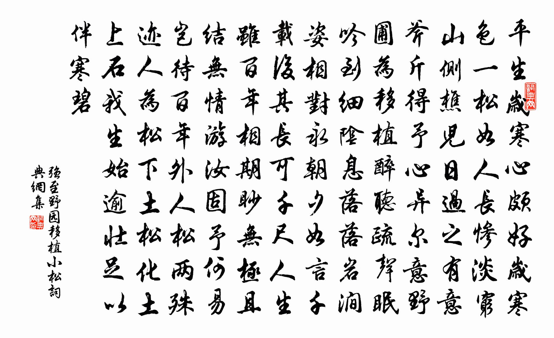 詩詞名句歷史字典書法欣賞書法字典國語詞典說文解字康熙字典古漢語字典標 題 作 者 詩 句 野園移植小松作者:強至 朝代:宋代野園移植小松原文平生歲寒心,頗好歲寒色。一松如人長,慘澹窮山側。樵兒日過之,有意斧斤得。予心異爾意,野圃為移植。醉聽疏聲眠,吟到細陰息。落落岩澗姿,相對永朝夕。如言千載後,其長可千尺。人生雖百年,相期眇無極。且結無情游,汝固予何易。豈待百年外,人松兩殊跡。人為松下土,鬆化土上石。我生始逾壯,足以伴寒碧。詩詞問答問:野園移植小松的作者是誰?答:強至問:野園移植小松寫於哪個朝代?答:宋代強至野園移植小松書法欣賞野園移植小松書法作品詩詞推薦平雲閣范成大〔宋代〕背倚天峰涌化宮,橫空閣道拖雙虹。火雲六月應奇絕,青瑣玲瓏八面風。送僧歸剡山貫休〔唐代〕遠逃為亂處,寺與石城連。木落歸山路,人初刈剡田。荒林猴咬栗,戰地鬼多年。好去楞伽子,精修莫偶然。三登樂范成大〔宋代〕今夕何朝,披岫幌、雲關重啟。引冰壺、素空似洗。捲簾中、敧枕上,月星浮水。天鏡夜明,半窗萬里。盼庭柯、獨步小園四首曾幾〔宋代〕誰將山杏胭脂色,來作江梅玉頰紅。但得暗香疏影在,不妨妝面對春風。醉花陰仲殊〔宋代〕一雙鶴繞蟠桃戲。說人間千歲。昨夜降元精,蓬矢桑弧,又報千家喜。綺羅庭院笙歌沸。擁玳簪珠履。五福一……鍾陵寒食日郊外閒遊曹松〔唐代〕可憐時節足風情,杏子粥香如冷餳。無奈春風輸舊火,遍教人喚作山櫻。聲聲慢侯善淵〔元代〕人心剛硬,不肯回頭。深沉苦海淹留。酒色財氣不捨,甚日方休。聞早尋歸出路,樂陶陶、雲水閒遊。無縈系,也次韻蘇主管青溪十絕句項安世〔宋代〕牆頭紅旆醉僛僛,大將防江出六奇。我自中原行鐵馬,他時此物不勞施。攄情留別并州從事馬戴〔唐代〕淺學長自鄙,謬承賢達知。才希漢主召,玉任楚人疑。年長慚漂泊,恩深惜別離。秋光獨鳥過,暝色一蟬悲。鶴髮洞仙歌 賦榛實屏山所錄 中州樂府王澮〔元代〕圓剛定質,混物非凡類。仁處其中靜忘意。任蝶蜂狂繞,燕雀喧爭,心君正,惟取清白自治。黃衣從淡泊,此個家岳陽樓雜詠十二絕胡寅〔宋代〕沅澧澬湘此並行,漲流洄薄又東傾。西南或與天為際,禹貢如何不記名。偶然五首皎然〔唐代〕樂禪心似盪,吾道不相妨。獨悟歌還笑,誰言老更狂。偶然寂無喧,吾了心性源。可嫌蟲食木,不笑鳥能言。隱心次韻君俞三詩時在山下李復〔宋代〕西陵大火流,南融已頹征。涼風拂庭樹,槭槭起秋聲。遙夜抱膝坐,耿耿河漢明。豈無尊中酒,非君誰與傾。北原情三首劉言史〔唐代〕錯莫天色愁,輓歌出重闉。誰家白網車,送客入幽塵。銘旌下官道,葬輿去轔轔。蕭條黃蒿中,奠酒花翠新。米雪送陳秘監歸泉州徐鉉〔唐代〕風滿潮溝木葉飛,水邊行客駐驂騑。三朝恩澤馮唐老,萬里鄉關賀監歸。世路窮通前事遠,半生談笑此心違。離歌庸醫行尹穡〔宋代〕南街書醫工門如書市,爭傳書和扁生後世。膏盲可為死可起,書屑蓬根盡珍劑。歲月轉久術轉疏,十醫九死一活無鵲橋仙佚名〔宋代〕東西二府,掖垣一相,誰似碩人兄弟。驂鸞來伴紫陽仙,要同享、橘中千歲。銀燈初試,花城不夜,鐵馬響冰春碎點絳唇(重九戲用東坡先生韻)向子諲〔宋代〕無熱池南,歲寒亭上開新宴。青山芳甸。盡入真如觀。舉酒高歌,人在秋天半。晴空遠。巷江影亂。何處飛來雁。不受暑亭馬之純〔宋代〕驅車曾向暑中來,望見塵襟已豁開。裊裊羊腸知幾折,亭亭鳳翅與俱回。渭川沮洳何如此,佛國清涼亦快哉。久坐題李季章中書舍人石林堂楊萬里〔宋代〕紫微仙人今太白,不愛好官愛奇石。頃從道山歸雪山,一葉漁船一橫笛。船過宣池月滿空,乘雲飛上九華峰。十指名句推薦前年伐月支,城上沒全師。張籍《沒蕃故人》 紛披乍依迥,掣曳或隨風。李世民《詠興國寺佛殿前幡》 涼月如眉掛柳灣,越中山色鏡中看。戴叔倫《蘭溪棹歌》 夢裡分明見關塞,不知何路向金微。張仲素《秋閨思二首》 父兄有惡行,子弟學之則無不肖王永彬《圍爐夜話·第三三則》 秋晚蓴鱸江上,夜深兒女燈前。辛棄疾《木蘭花慢·滁州送范倅》 霓裳片片晚妝新,束素亭亭玉殿春睦石《玉蘭》 安上在於悅下,為己存乎利人。房玄齡《晉書·列傳·第二十四章》 長堤春水綠悠悠,畎入漳河一道流。王之渙《宴詞》 空勞縴手,解佩贈情人。牛希濟《臨江仙·柳帶搖風漢水濱》