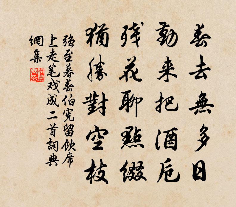 詩詞名句歷史字典書法欣賞書法字典國語詞典說文解字康熙字典古漢語字典標 題 作 者 詩 句 暮春伯憲留飲席上走筆戲成二首作者:強至 朝代:宋代原文春去無多日,勤來把酒卮。殘花聊點綴,猶勝對空枝。詩詞問答問:《暮春伯憲留飲席上走筆戲成二首》的作者是誰?答:強至問:該詩寫於哪個朝代?答:宋代書法欣賞暮春伯憲留飲席上走筆戲成二首書法作品詩詞推薦卜運算元(分題得苔)佚名〔宋代〕池台小雨乾,門巷香輪少。誰把青錢襯落紅,滿地無人掃。何時鬥草歸,幾度尋花了。留得佳人蓮步痕,宮樣鞋兒秋興二首文同〔宋代〕百蟲感秋陰,入夜聲更切。問爾苦何事,到曉啼不曷。盈庭不可止,蓊{上艹下歲}藏萬穴。會是天使然,相將送古詩陸游〔宋代〕能自得我心,無入不自得。靈府長優閒,蕉鹿烏能惑。濁醪吞數升,浩氣漫漫塞。醉來隱几酣,屢到華胥國。人生題鶴鳴山杜光庭〔唐代〕五氣雲龍下泰清,三天真客已功成。人間回首山川小,天上凌雲劍佩輕。花擁石壇何寂寞,草平轍跡自分明。鹿裘木蘭花(和孫公素別安陸·般涉調)張先〔宋代〕相離徒有相逢夢。門外馬蹄塵已動。怨歌留待醉時聽,遠目不堪空際送。今宵風月知誰共。聲咽琵琶槽上鳳。人生辛簿趙尉夜語新亭二首錢時〔宋代〕紛紛門外走紅塵,底是人間快活人。未判兩儀先太極,直須端的自家身。堯戒佚名〔先秦〕戰戰慄栗,日謹一日。人莫躓于山,而躓於垤。送王伯董入總幕李流謙〔宋代〕昔為萬里別,歸送北征鴻。近接何曾數,深期本自同。遠眸眵霧嶂,短箠滑霜風。更說無窮樂,懷中雙橘紅。慧和微以布衫送壽昌可師有偈答之戲成四首釋慧空〔宋代〕一物全無盡力擔,相逢江北又江南。向來貼肉那堪語,更著渠儂一布衫。謁按察馬僉事王義山〔宋代〕黷貨無厭政賄成,幾年蔀屋不曾晴。擊奸霹靂從天降,燭物晶明揭日行。影在烏台已風采,特煩龍節更澄清。兒童次韻衛慶陽使君送別這章曹彥約〔宋代〕細讀君詩字字新,巧將監鼓入羹蓴。也知世路催行客,更遣工歌勞使臣。千里身心空晤對,五經懷抱想紛綸。他年竹間亭小酌懷歐陽叔弼季默呈趙景貺陳履常蘇軾〔宋代〕(一題作小飲西湖,懷歐陽叔弼兄弟,贈趙景貺、陳履常)歲暮自急景,我閒方緩觴。醉飲西湖晚,步轉北渚長。六月雨十一首許月卿〔宋代〕雙星今夜話綢繆,頗語人間一夜秋。萬事悠悠何預我,四方蹙蹙屬之疇。萬家旁置傷心地,四水宗朝極目洲。坐看緣識宋太宗〔宋代〕得道超凡聖,逍遙本是緣。群迷難解會,我且不虛傳。但信恆無斷,精窮用意專。審聰明譬喻,勿被俗情牽。栽杉白居易〔唐代〕勁葉窗森利劍,窗孤莖挺端窗標。才高窗四五尺,勢若干青霄。移栽東窗前,愛爾寒不凋。病夫臥相對,日夕閒蕭頌古塔祖勝二首李石〔宋代〕天津橋上弄猢猻,女子從來不出門。卻被罔明穿鼻孔,鬢邊香撼玉梅魂。紙帳史彌寧〔宋代〕高臥義皇萬慮空,吟懷肅落杳無蹤。恨渠紙帳關詩夢,勾引梅花攪一冬。孔明曾鞏〔宋代〕稱吳稱魏已紛紛,渭水西邊獨漢臣。平日將軍不三顧,尋常田裡帶經人。自和羅道成〔宋代〕水雲蹤跡自閒游,夏谷陰寒冷勝秋。猿鳥性情猶戀舊,翻身卻去海邊州。南鄉子佚名〔宋代〕復卦起潛龍。戊已微調未可攻。九二見龍臨卦主,神通。從此爐中次第紅。泰卦恰相逢。猛火燒乾藉巽風。煉就黃名句推薦白日登山望烽火,黃昏飲馬傍交河。李頎《古從軍行》 因思杜陵夢,鳧雁滿回塘。溫庭筠《商山早行》 舟遙遙以輕颺,風飄飄而吹衣。陶淵明《歸去來兮辭·並序》 四海無閒田,農夫猶餓死。李紳《古風二首 / 憫農二首》 多君相門女,學道愛神仙李白《送內尋廬山女道士李騰空二首》 孤飛一片雪,百里見秋毫。李白《觀放白鷹二首》 龍馬花雪毛,金鞍五陵豪。李白《白馬篇》 笑殺陶淵明,不飲杯中酒。李白《嘲王歷陽不肯飲酒》 天涯倚樓新恨,楊柳幾絲碧。晏幾道《六么令·雪殘風信》 悄無人、桐陰轉午,晚涼新浴。蘇軾《賀新郎·夏景》